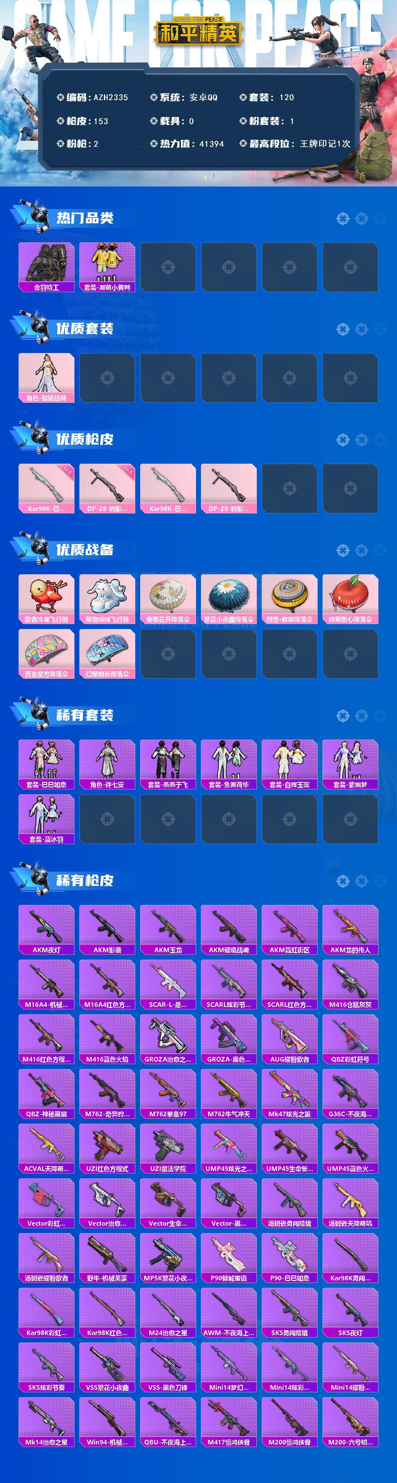 安卓 手q【1粉角色-智耀战神 潮萌小黄鸭 粉熊背包】1粉装-2特效呛-0载具-3粉色飞行器-41394热力值-1王牌印记-120套装-153呛皮 【热门品类】:套装-金羽特工,套装-潮萌小黄鸭 【粉色套装】:角色-智耀战神 【粉色呛皮等级】:kar98k-巳巳如意五级,dp-28-豹影疾电五级 【粉色呛皮】:kar98k-巳巳如意,dp-28-豹影疾电 【粉色飞行器】:歌者泠鸢飞行器