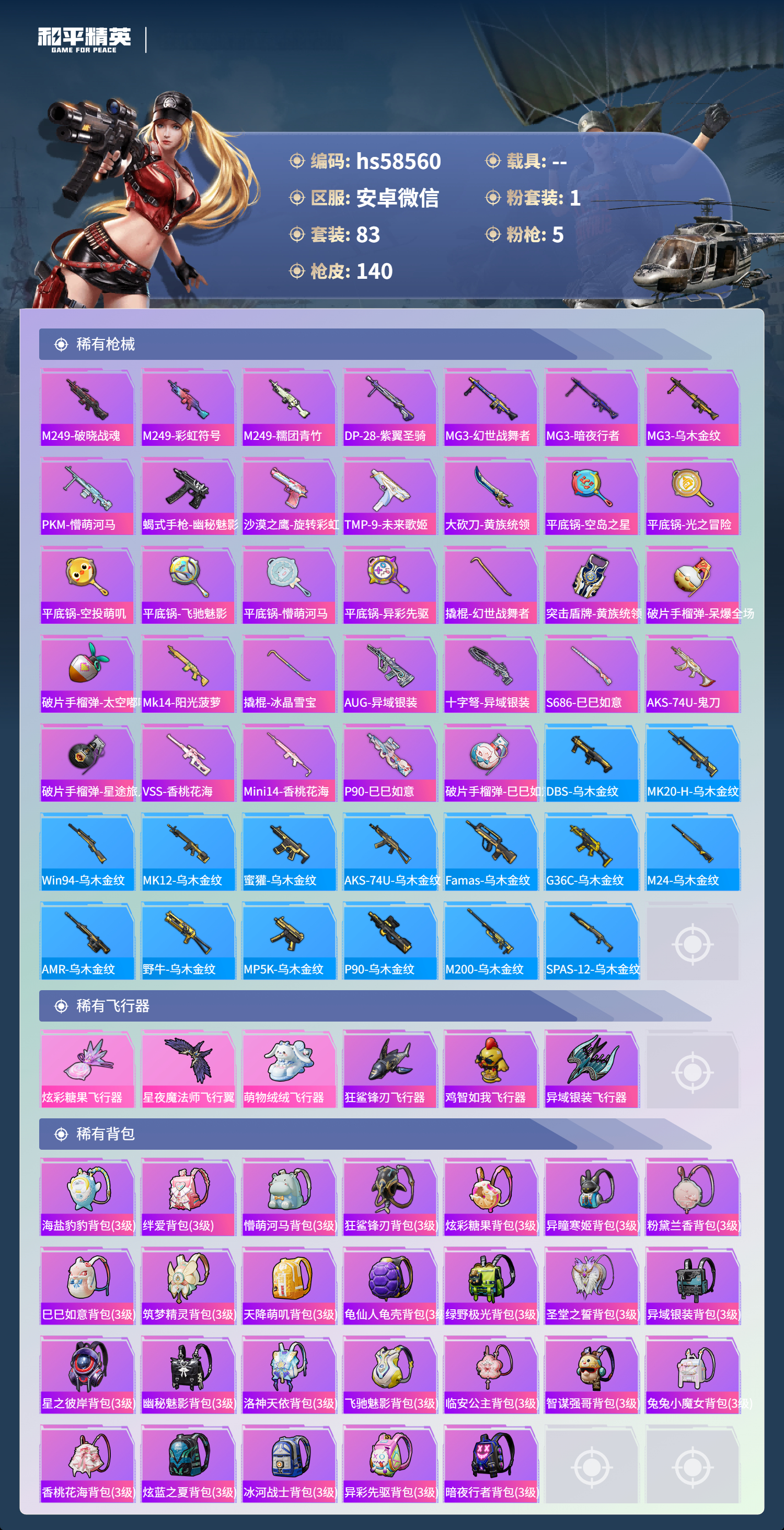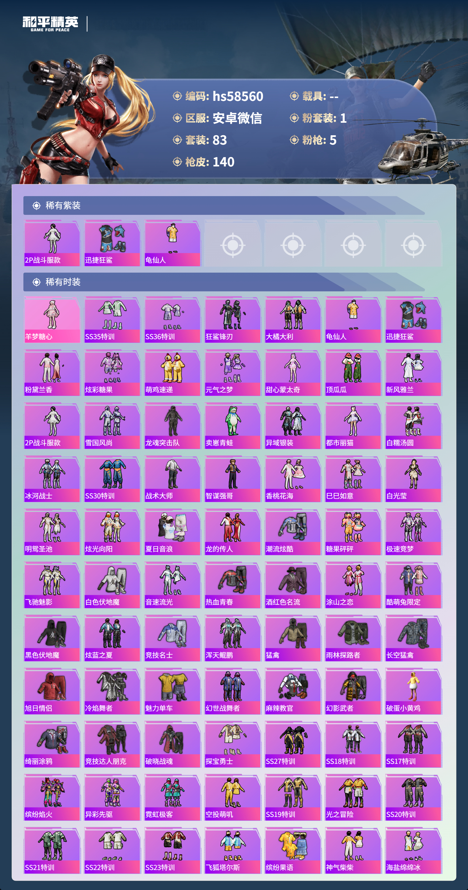 0载具-83套装-140呛皮-hs58560 安卓微信-10王牌印记-1粉装-5特效呛-38349热力值-83套装-140呛皮【1粉装】角色-羊梦糖心【5特效呛】aug-暖羊咩咩/5级aks-74u-森灵之息/5级dp-28-豹影疾电/5级kar98k-巳巳如意/4级groza-镜光银凌/5级【3稀有紫装】2p战斗服款迅捷狂鲨龟仙人【83稀有时装】羊梦糖心ss35特训ss36特训狂鲨锋刃大橘大利龟
