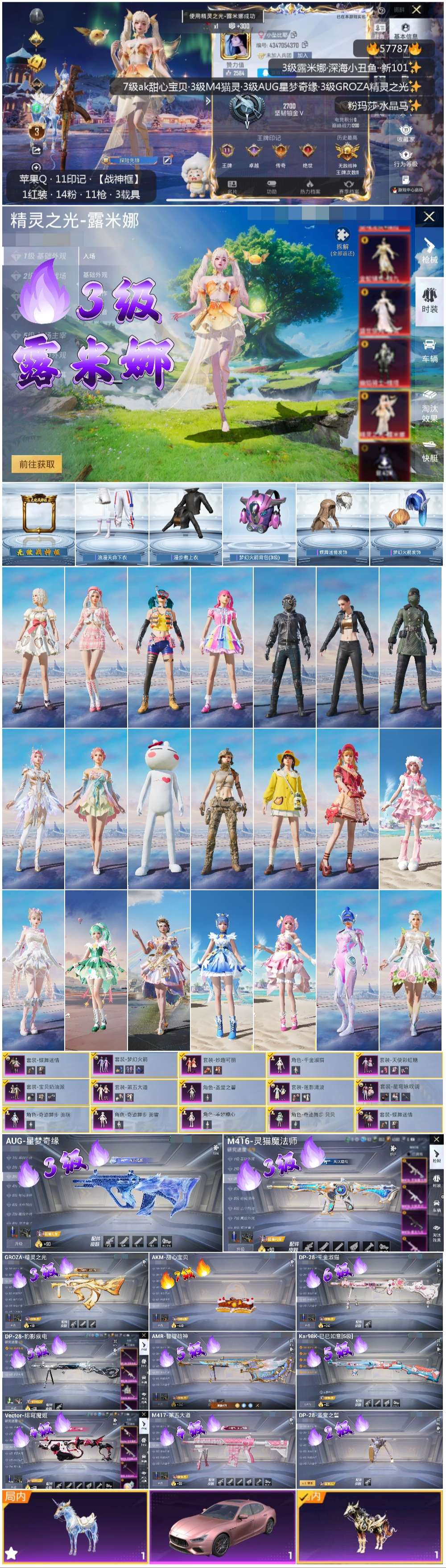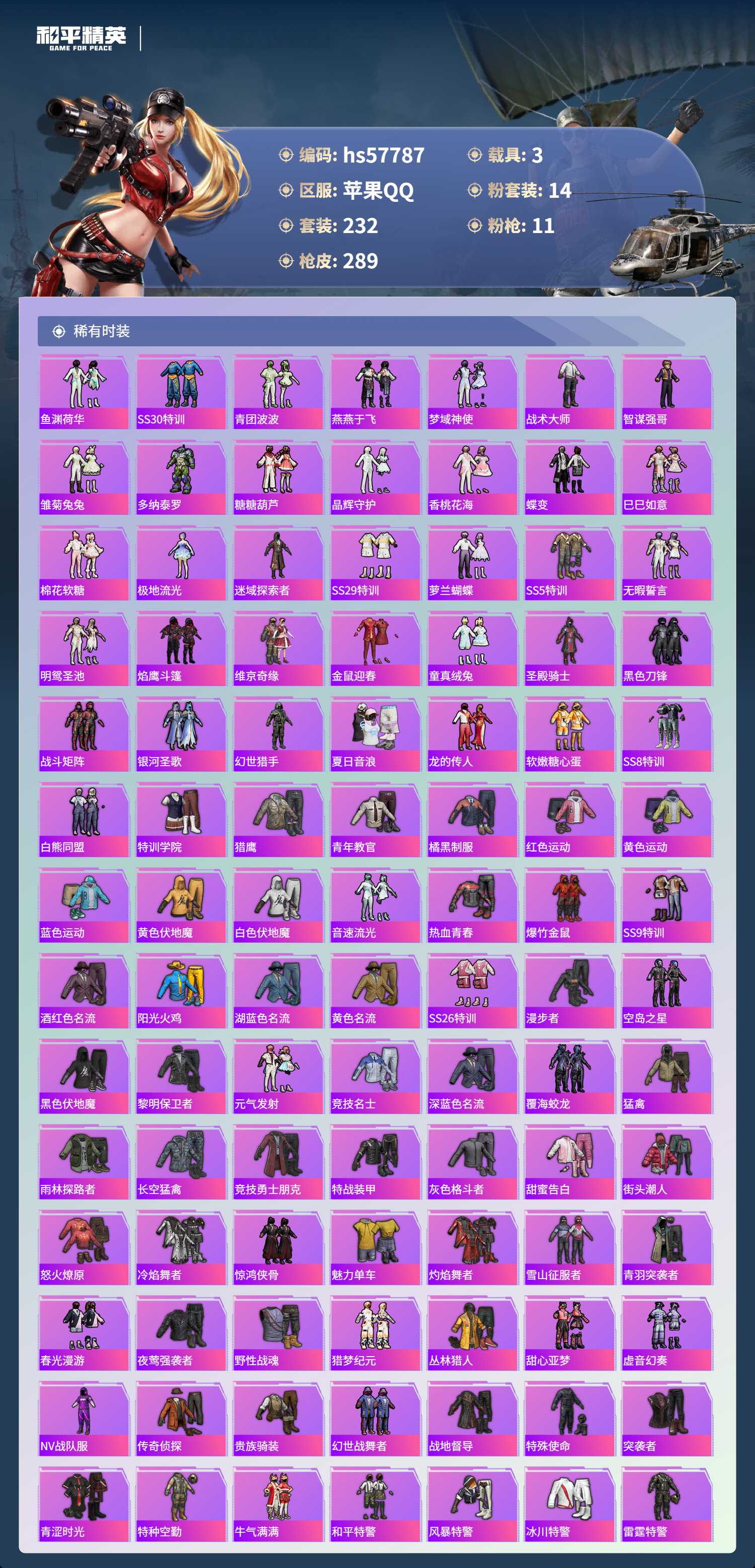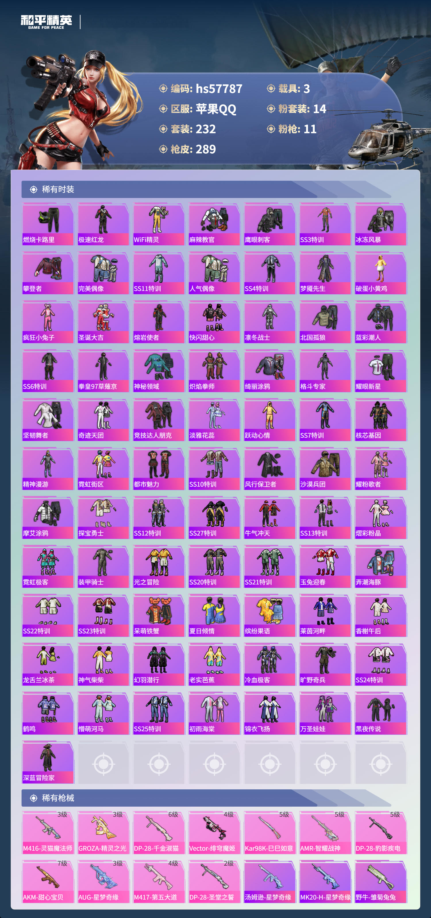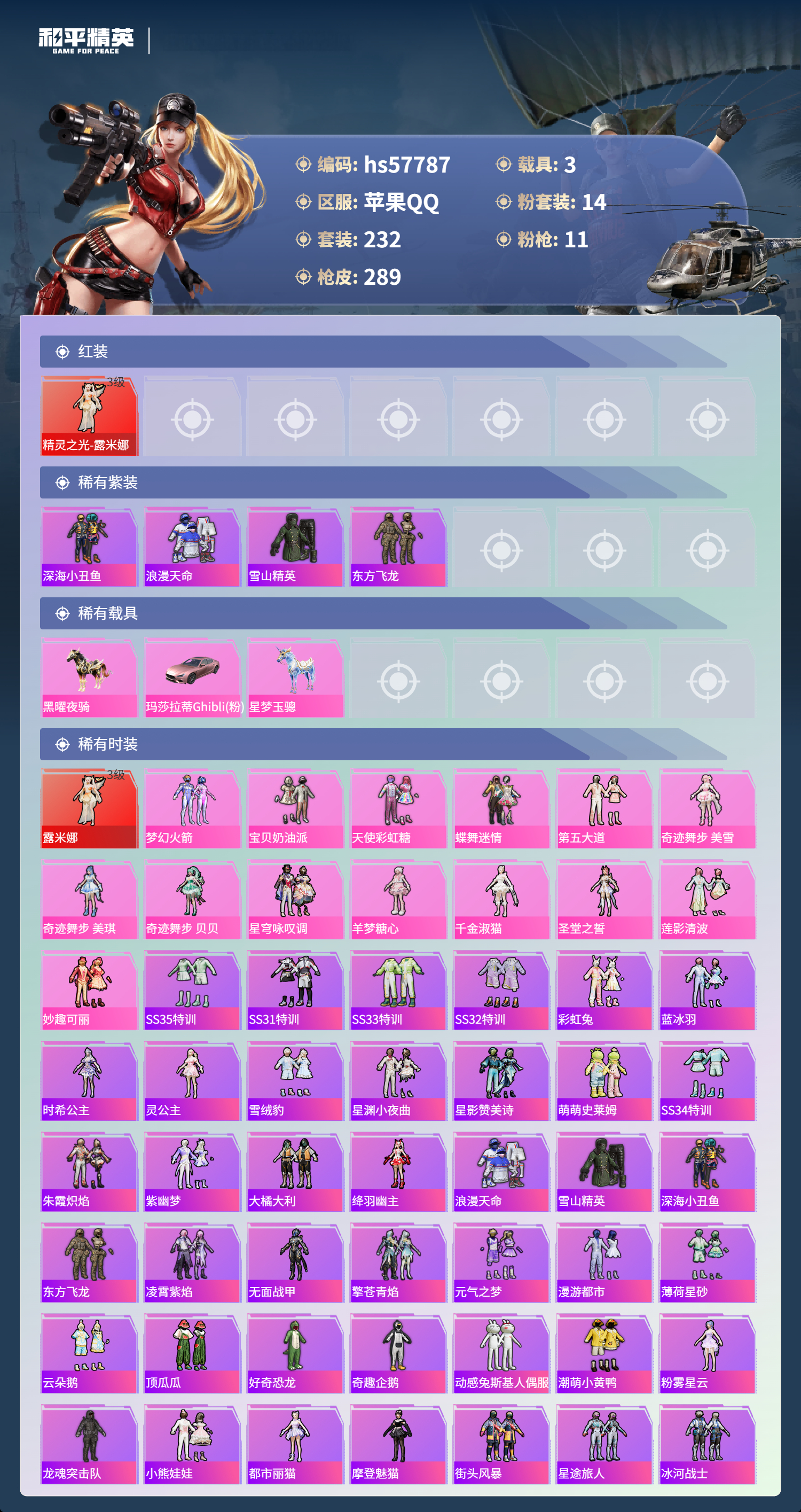 hs57787 苹果手q-11王牌印记-有战神框-1红装-14粉装-11特效呛-3载具-98330热力值-232套装-289呛皮-3卓越印记-3传奇印记【1红装】精灵之光-露米娜/3级【14粉装】套装-星穹咏叹调套装-第五大道角色-千金淑猫角色-奇迹舞步 美琪套装-蝶舞迷情套装-梦幻火箭角色-圣堂之誓套装-宝贝奶油派角色-奇迹舞步 贝贝套装-莲影清波角色-奇迹舞步 美雪