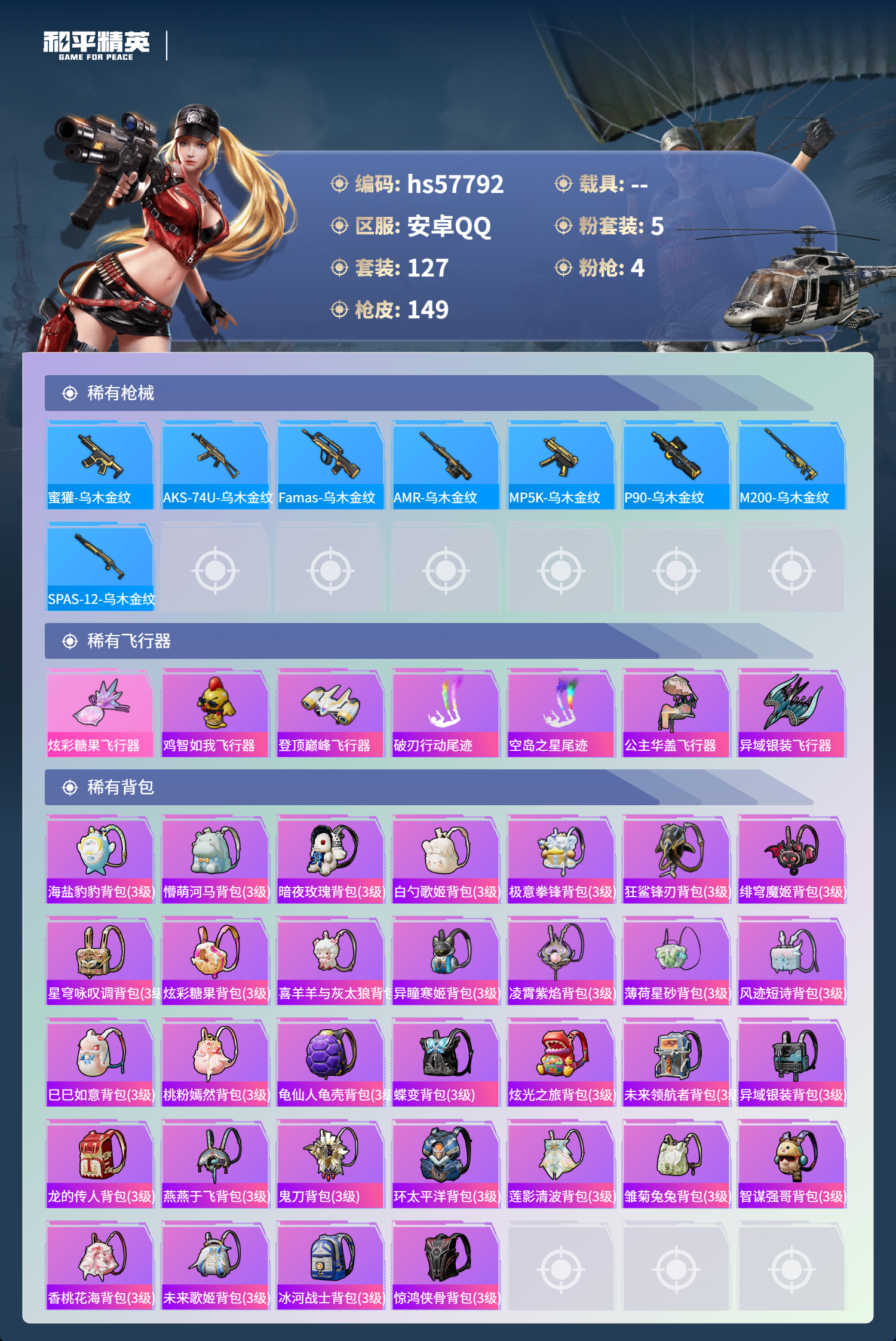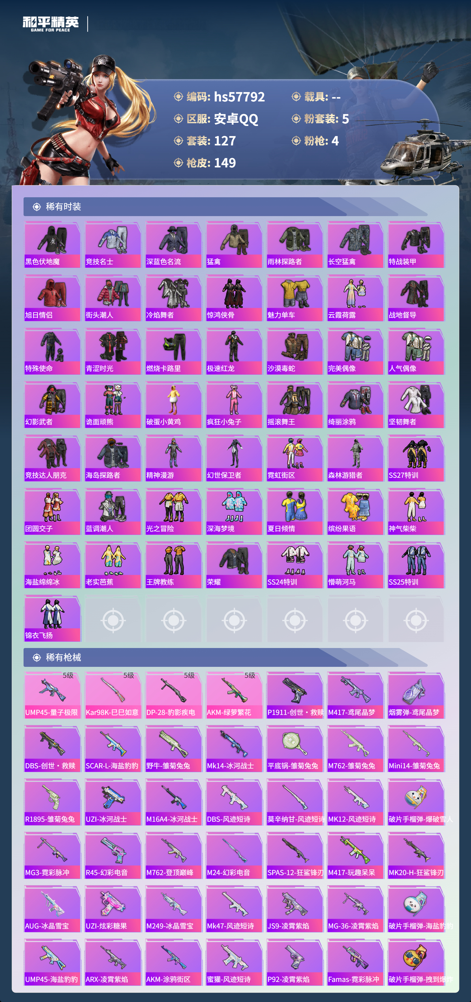 hs57792 安卓手q-11王牌印记-5粉装-4特效呛-43071热力值-127套装-149呛皮-4卓越印记-2传奇印记【5粉装】套装-星之彼岸套装-桃粉嫣然角色-小可学妹角色-呆萌星弥套装-创世·救赎【4特效呛】kar98k-巳巳如意/5级akm-绿萝繁花/5级dp-28-豹影疾电/5级ump45-量子极限/5级【3稀有紫装】mark.06小丑鱼龟仙人【127稀有时