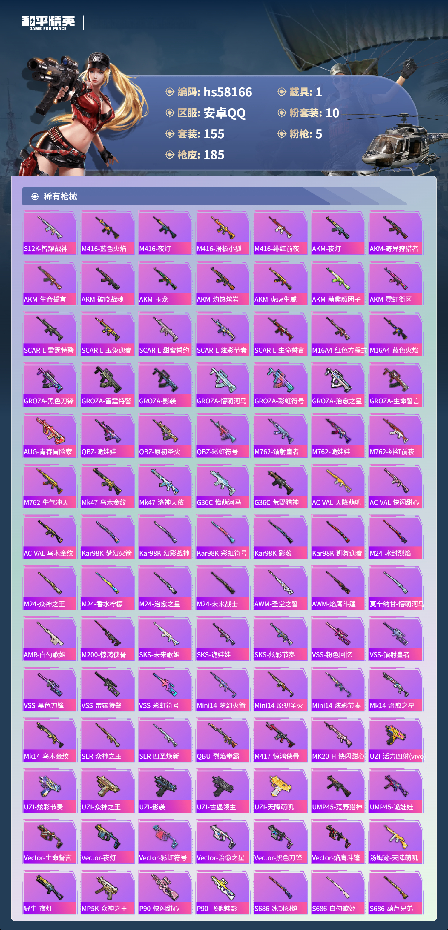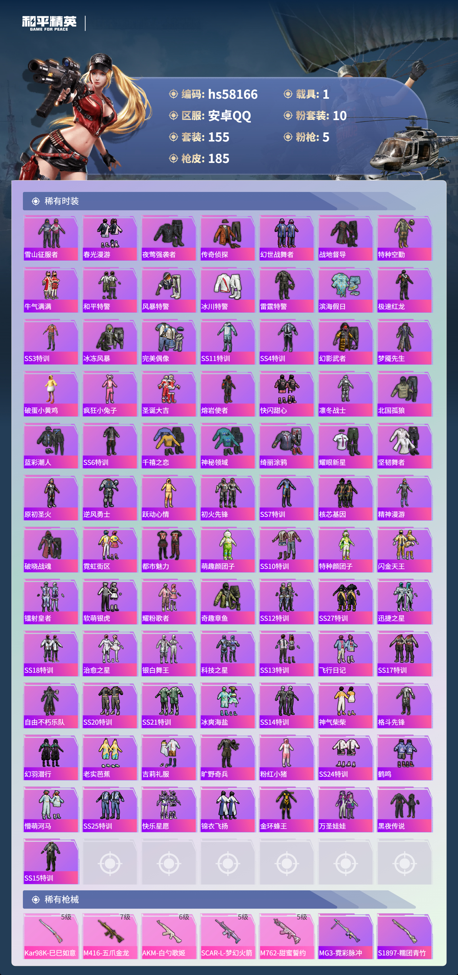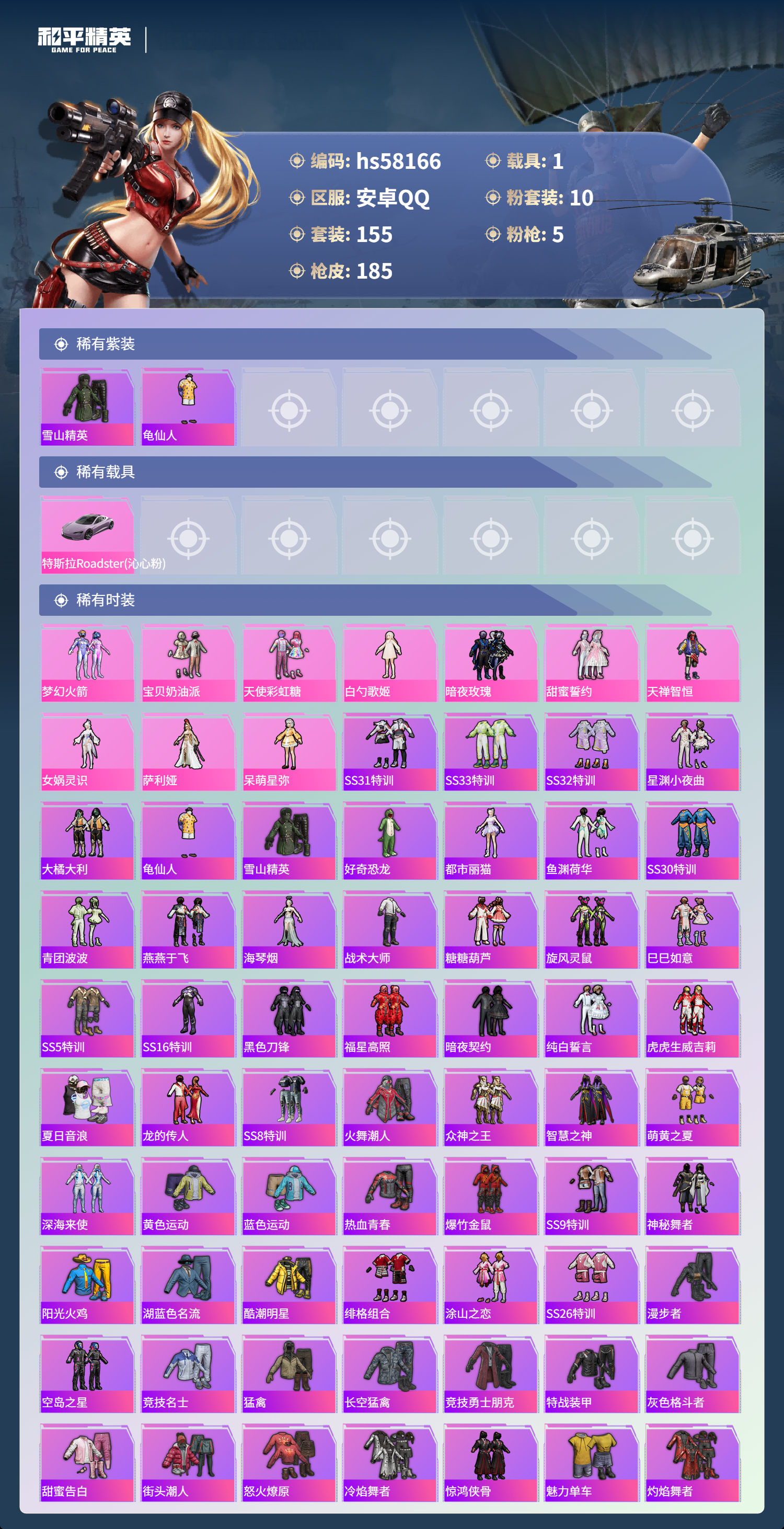 1载具-155套装-185呛皮-hs58166 安卓手q-21王牌印记-有战神框-10粉装-5特效呛-1载具-65001热力值-155套装-185呛皮-2卓越印记-1传奇印记【10粉装】套装-宝贝奶油派套装-暗夜玫瑰套装-天使彩虹糖套装-梦幻火箭角色-呆萌星弥角色-白勺歌姬套装-甜蜜誓约角色-萨利娅套装-天禅智恒角色-女娲灵识【5特效呛】m416-五爪金龙/7级kar98k-巳巳如意/5级scar-l-
