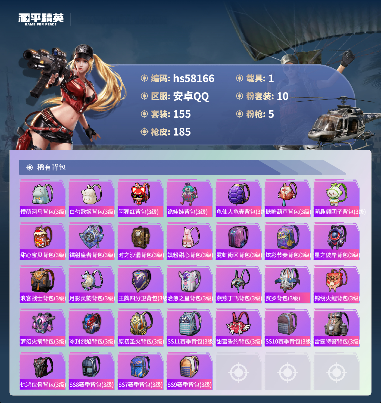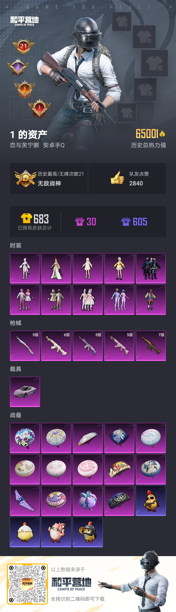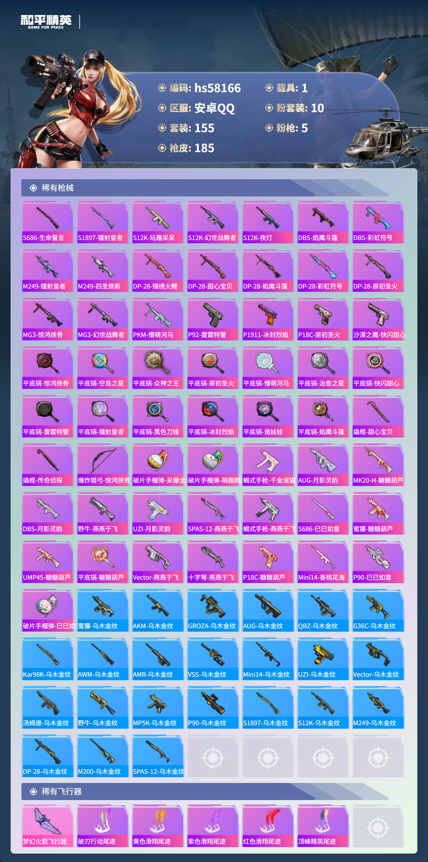1载具-155套装-185呛皮-hs58166 安卓手q-21王牌印记-有战神框-10粉装-5特效呛-1载具-65001热力值-155套装-185呛皮-2卓越印记-1传奇印记【10粉装】套装-宝贝奶油派套装-暗夜玫瑰套装-天使彩虹糖套装-梦幻火箭角色-呆萌星弥角色-白勺歌姬套装-甜蜜誓约角色-萨利娅套装-天禅智恒角色-女娲灵识【5特效呛】m416-五爪金龙/7级kar98k-巳巳如意/5级scar-l-