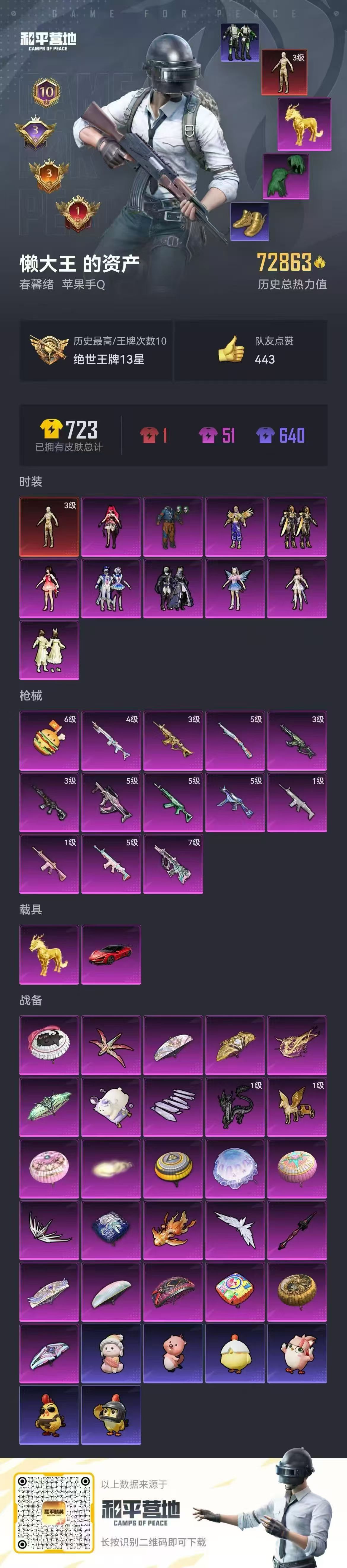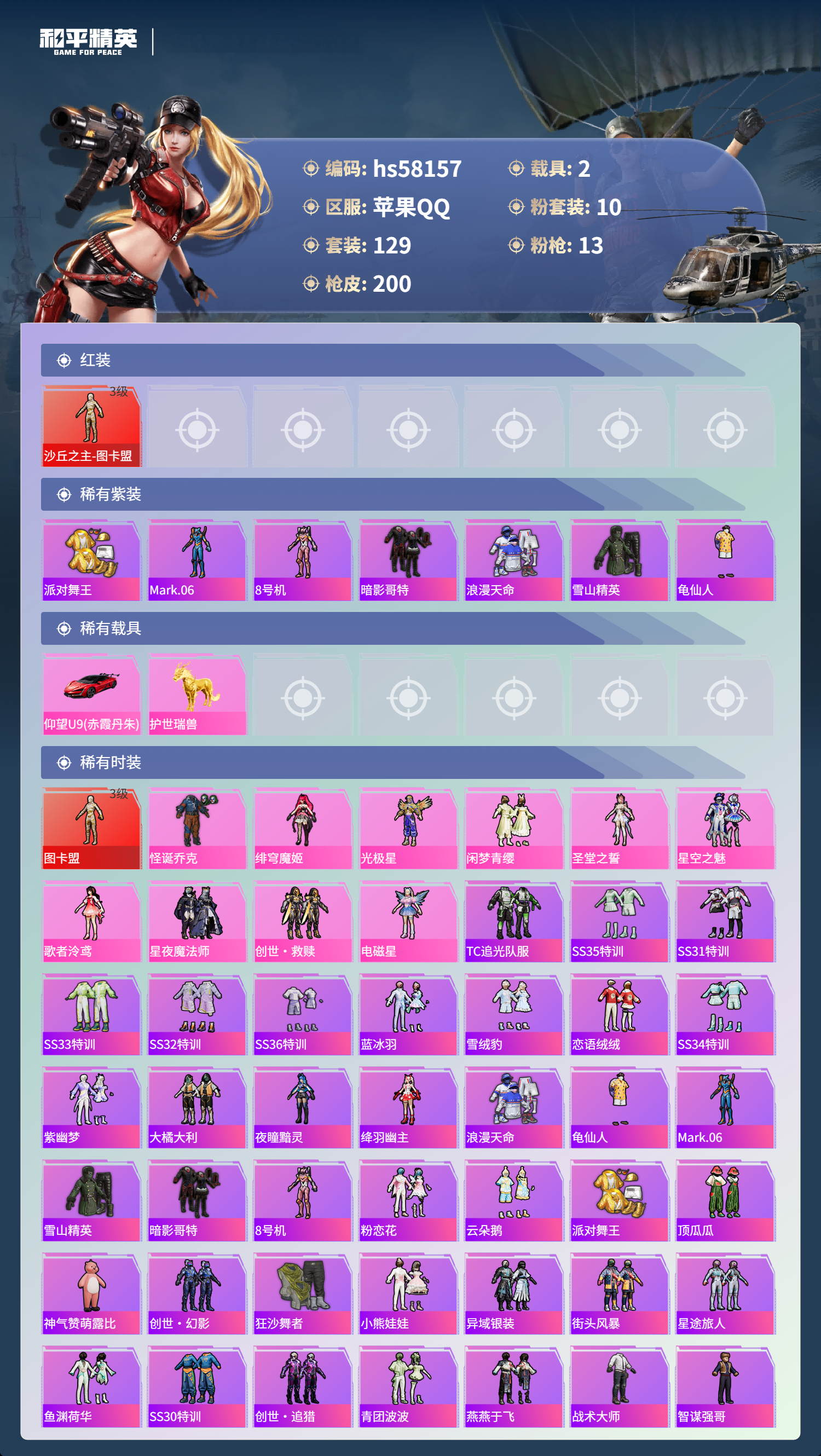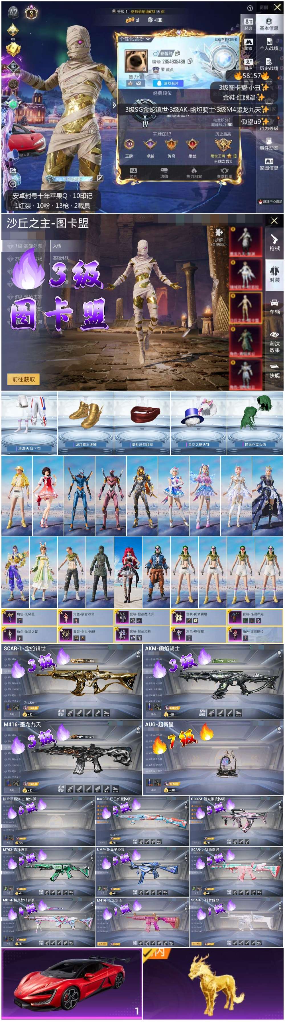 2400646苹果手q-10王牌印记-1红装-10粉装-13特效呛-2载具-73283热力值-129套装-200呛皮-3卓越印记-3传奇印记 【1红装】沙丘之主-图卡盟/3级 【10粉装】套装-创世·救赎角色-歌者泠鸢角色-圣堂之誓套装-星夜魔法师角色-光极星套装-闲梦青缨套装-怪诞乔克套装-星空之魅角色-绯穹魔姬角色-电磁星 【13特效呛】scar-l-金蛇镇世/3级