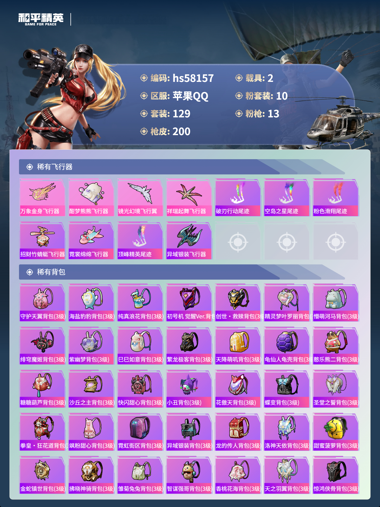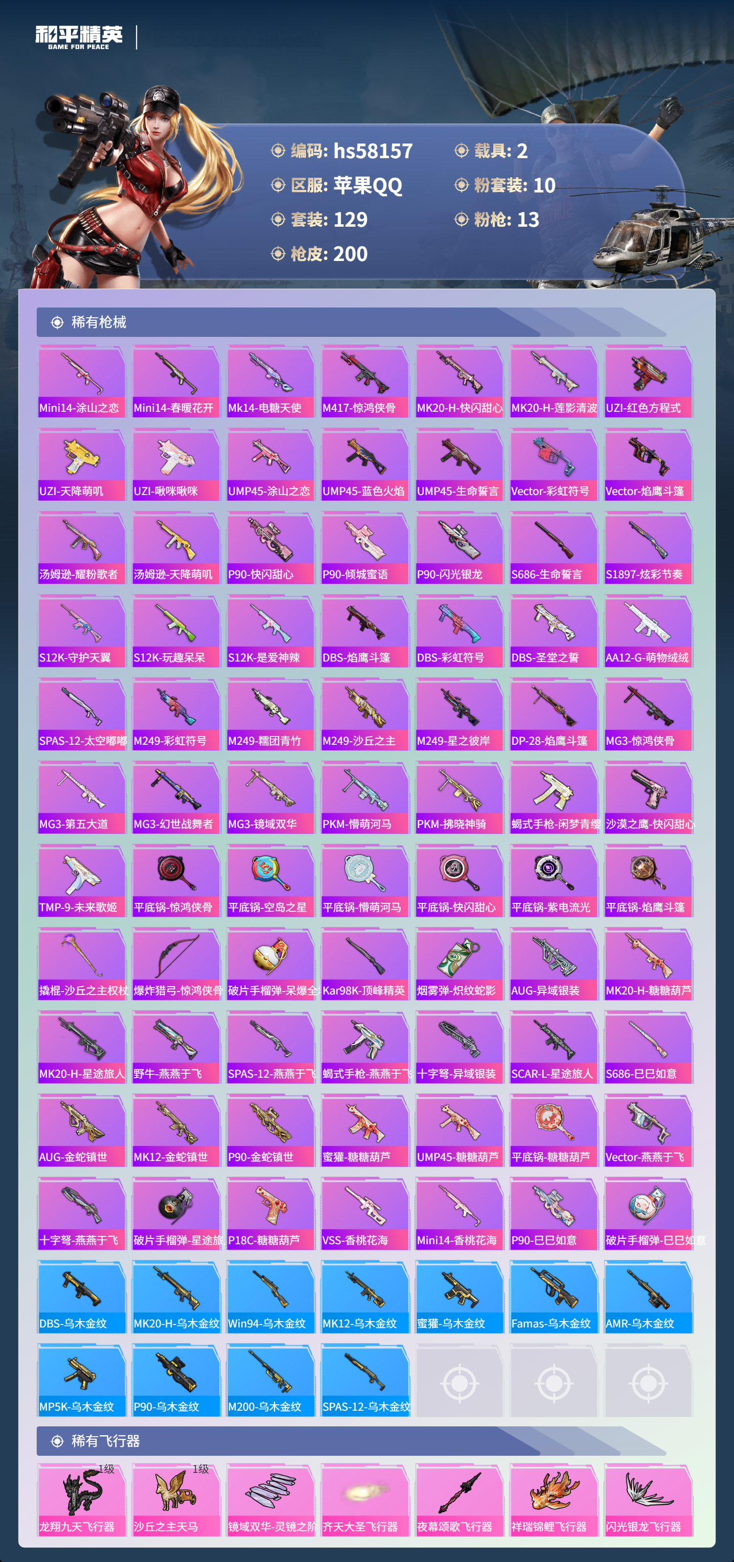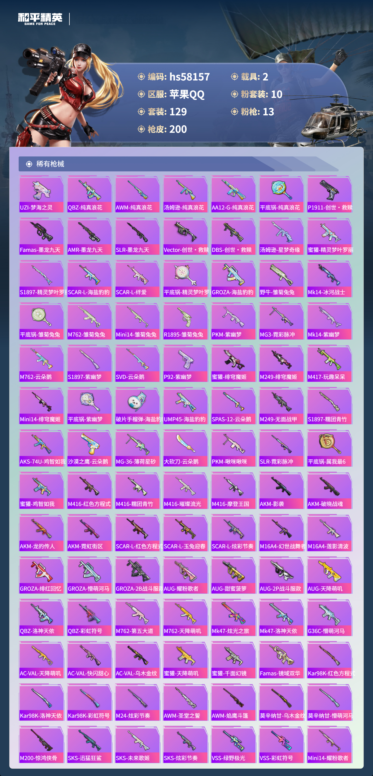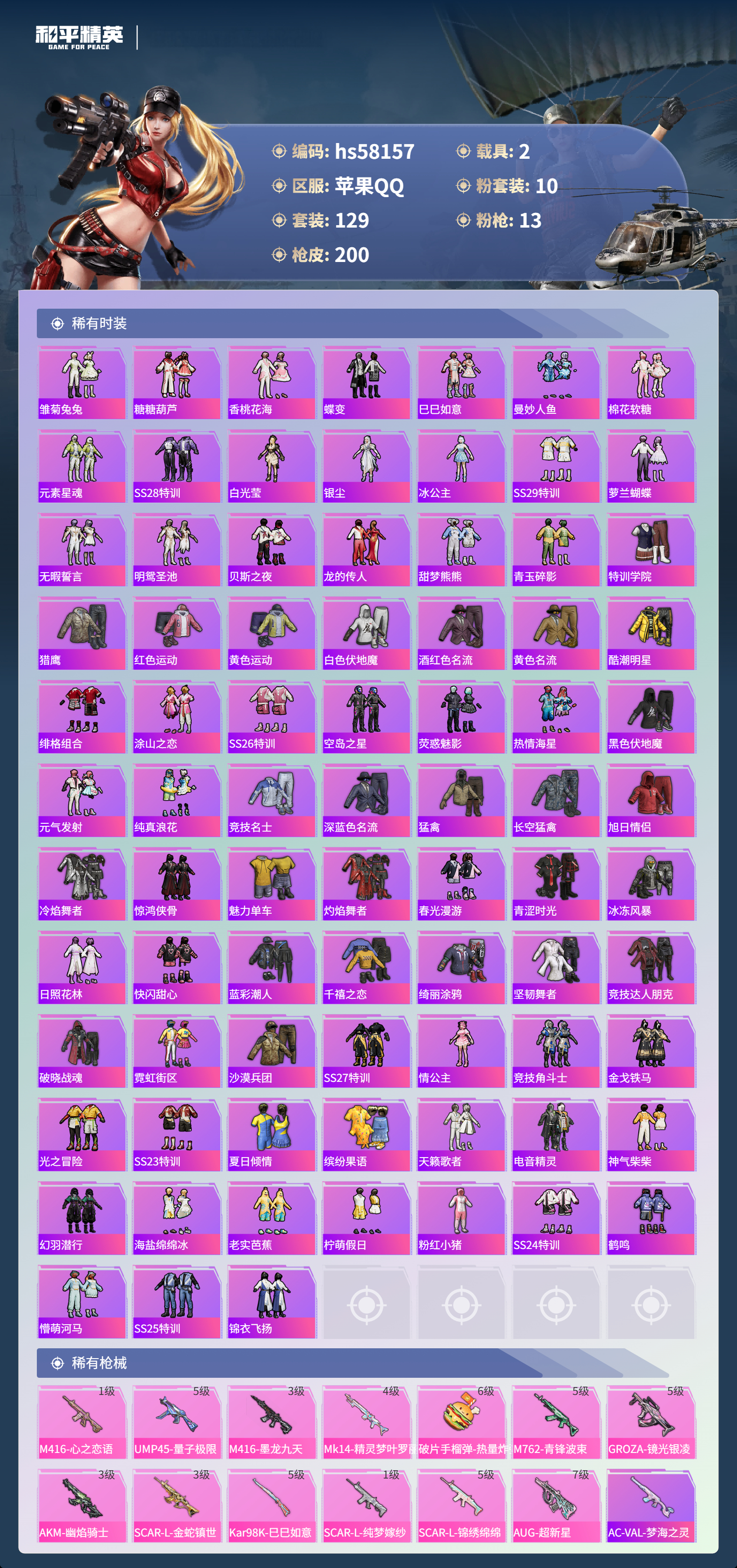 2400646苹果手q-10王牌印记-1红装-10粉装-13特效呛-2载具-73283热力值-129套装-200呛皮-3卓越印记-3传奇印记 【1红装】沙丘之主-图卡盟/3级 【10粉装】套装-创世·救赎角色-歌者泠鸢角色-圣堂之誓套装-星夜魔法师角色-光极星套装-闲梦青缨套装-怪诞乔克套装-星空之魅角色-绯穹魔姬角色-电磁星 【13特效呛】scar-l-金蛇镇世/3级