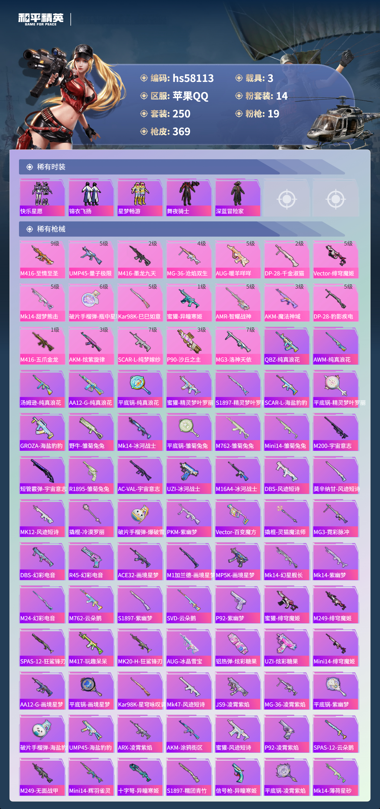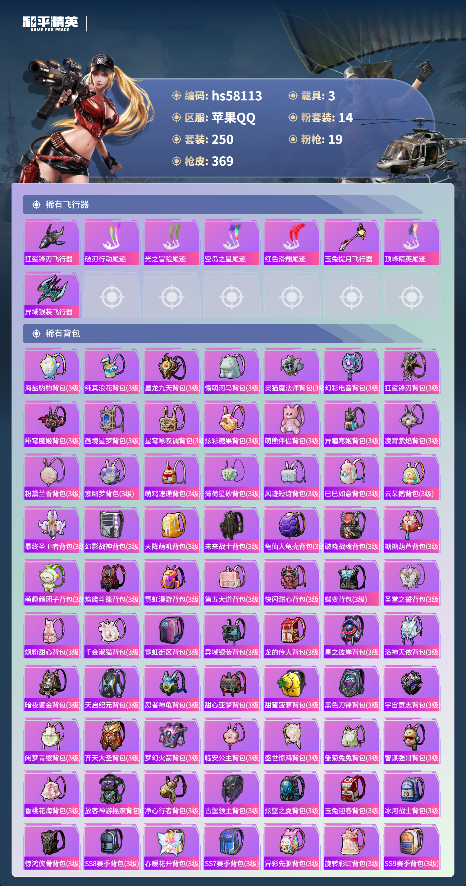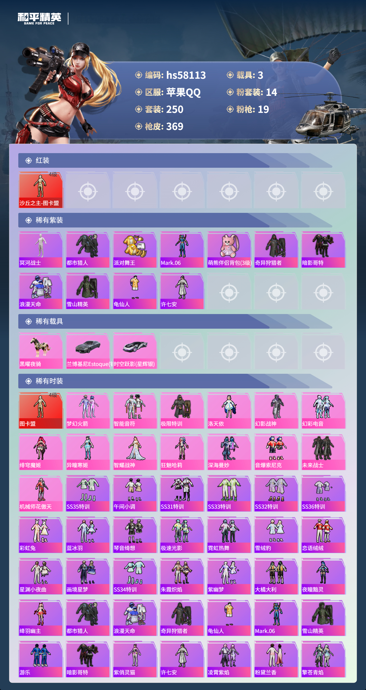 3载具-250套装-369呛皮-hs58113 苹果手q-18王牌印记-1红装-14粉装-19特效呛-3载具-热力值-250套装-369呛皮-4卓越印记-3传奇印记【1红装】沙丘之主-图卡盟/4级【14粉装】角色-智耀战神套装-幻影战神套装-机械师花傲天套装-深海曼妙套装-音爆索尼克角色-绯穹魔姬角色-狂魅哈莉套装-幻彩电音套装-梦幻火箭套装-智能音符角色-洛天依角色-异瞳寒姬套装-未来战