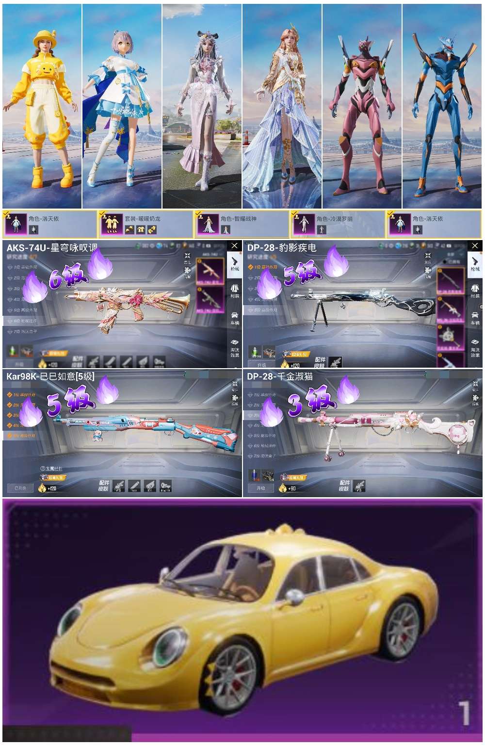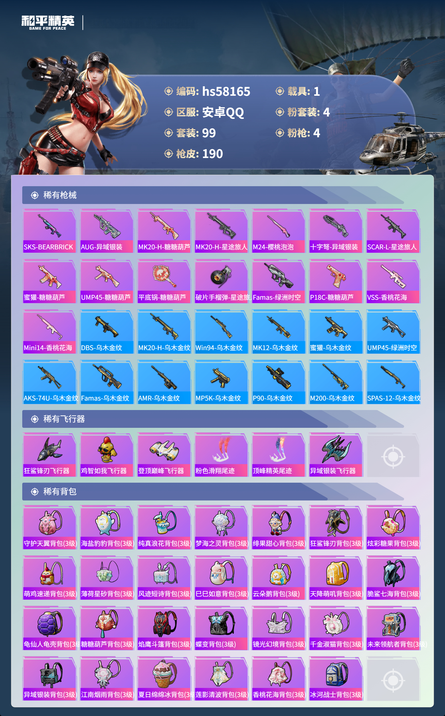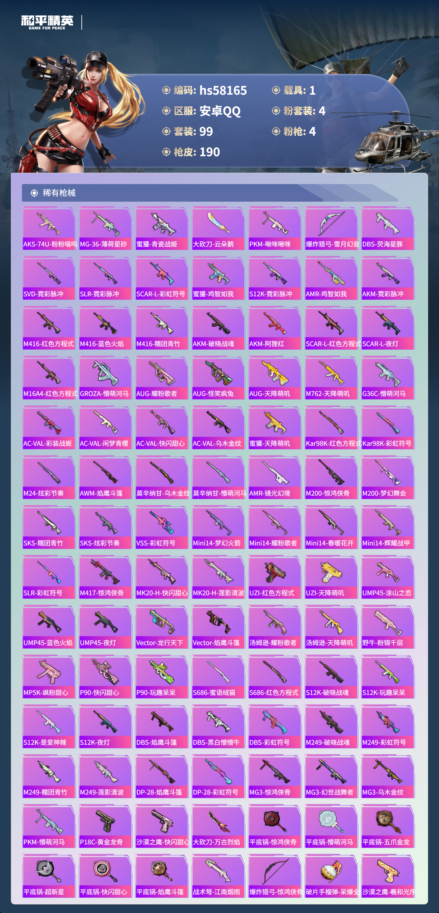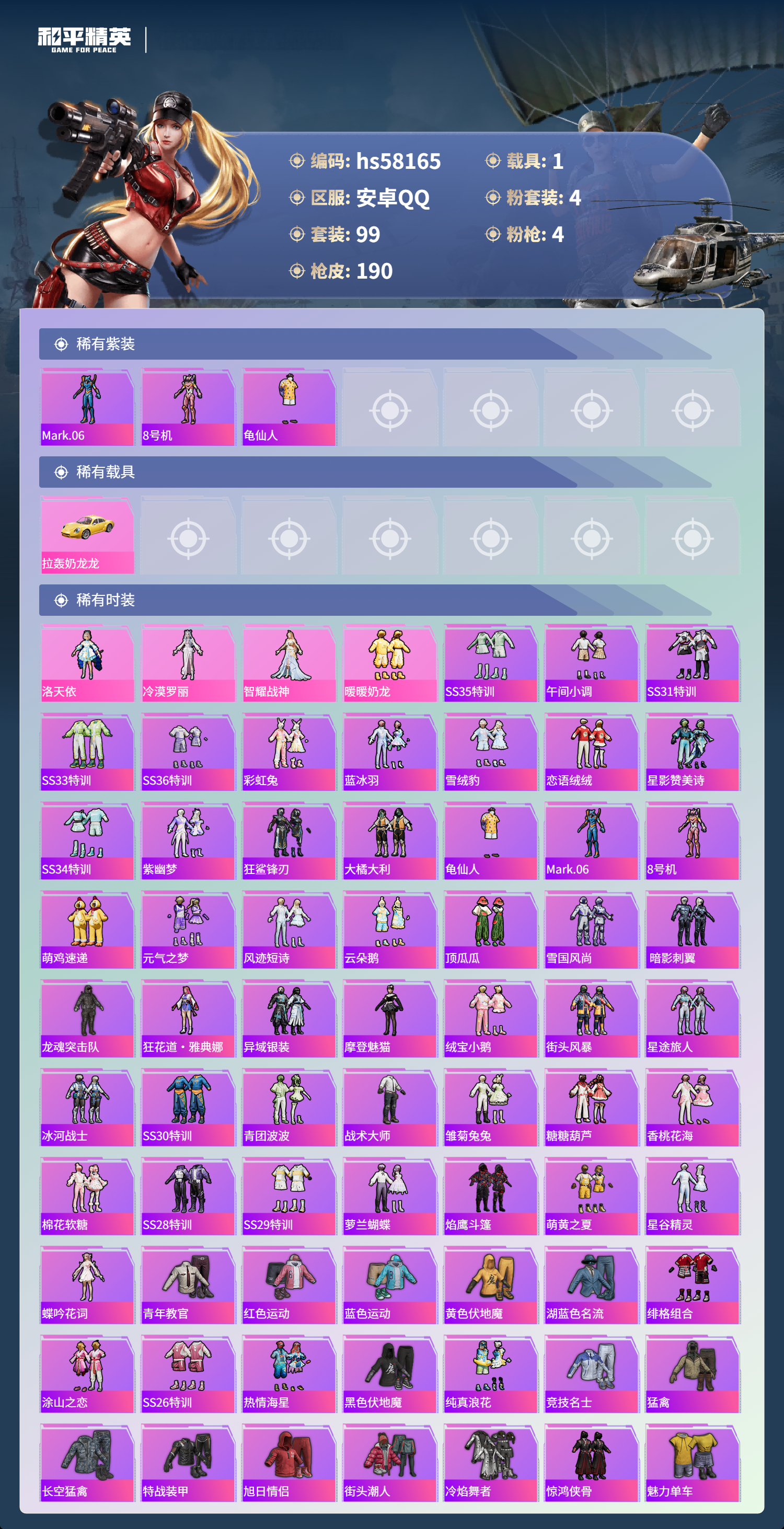 1载具-99套装-190呛皮-hs58165 安卓手q-0王牌印记-4粉装-4特效呛-1载具-49334热力值-99套装-190呛皮【4粉装】角色-智耀战神角色-冷漠罗丽角色-洛天依套装-暖暖奶龙【4特效呛】dp-28-豹影疾电/5级dp-28-千金淑猫/3级aks-74u-星穹咏叹调/6级kar98k-巳巳如意/5级【3稀有紫装】mark.068号机龟仙人【1稀有载具】拉轰奶龙龙【99稀有时装】洛天