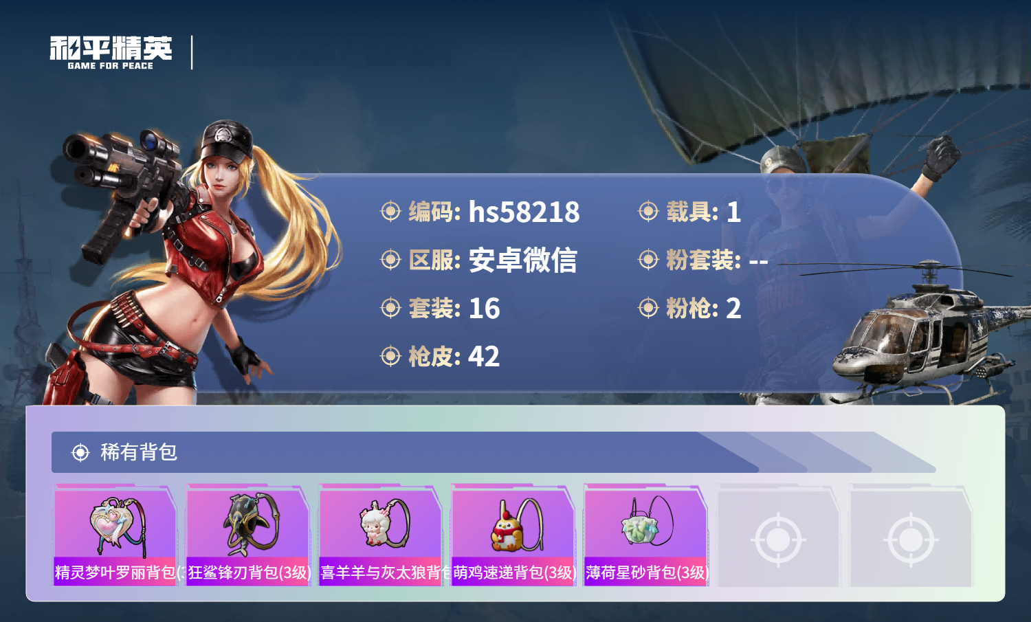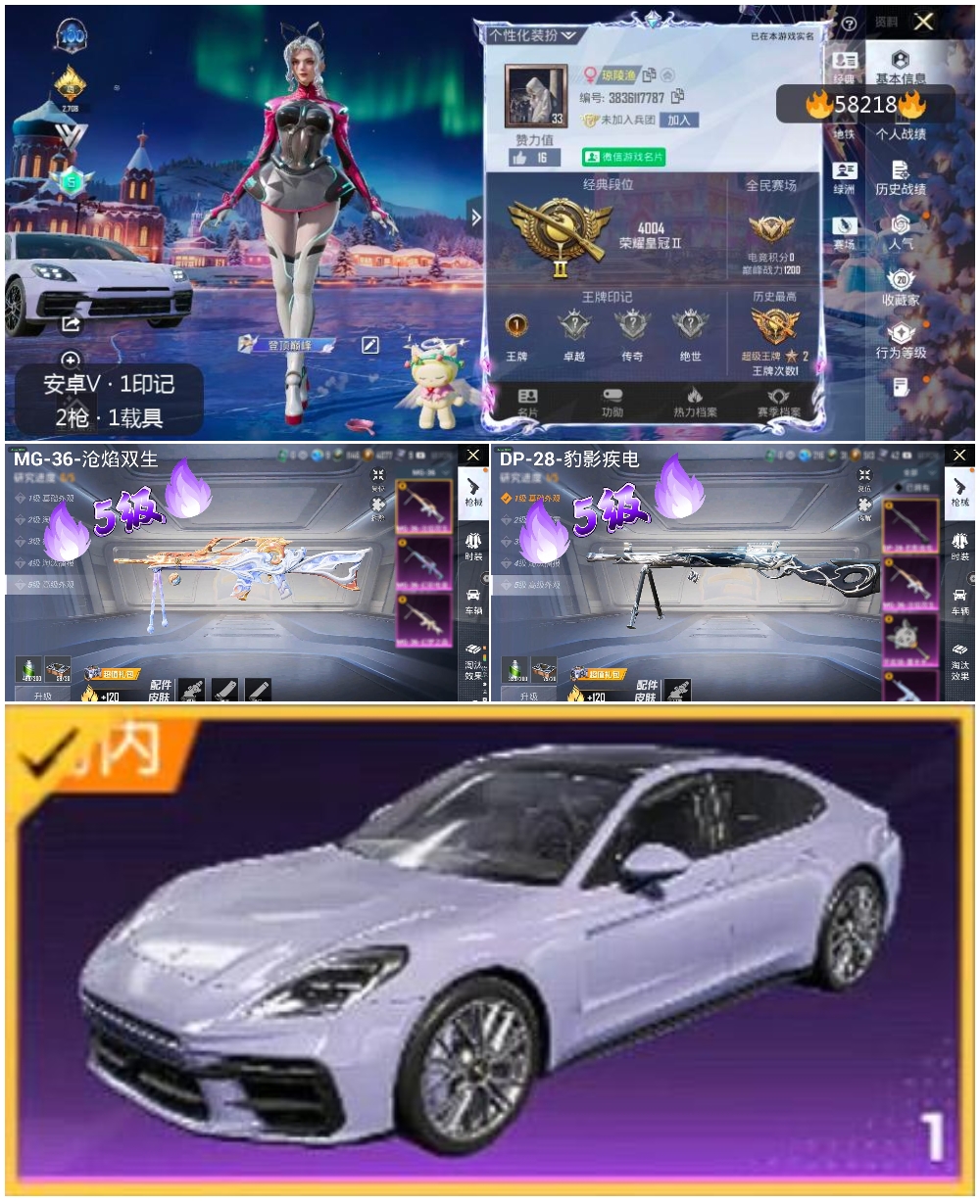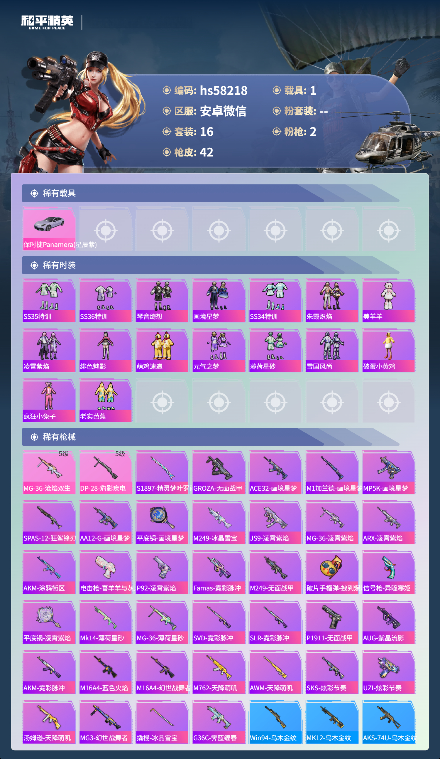 hs58218 安卓微信-1王牌印记-2特效呛-1载具-9814热力值-16套装-42呛皮【2特效呛】dp-28-豹影疾电/5级mg-36-沧焰双生/5级【1稀有载具】保时捷panamera星辰紫【16稀有时装】ss35特训ss36特训琴音绮想画境星梦ss34特训朱霞炽焰美羊羊凌霄紫焰绯色魅影萌鸡速递元气之梦薄荷星砂雪国风尚破蛋小黄鸡疯狂小兔子老实芭蕉