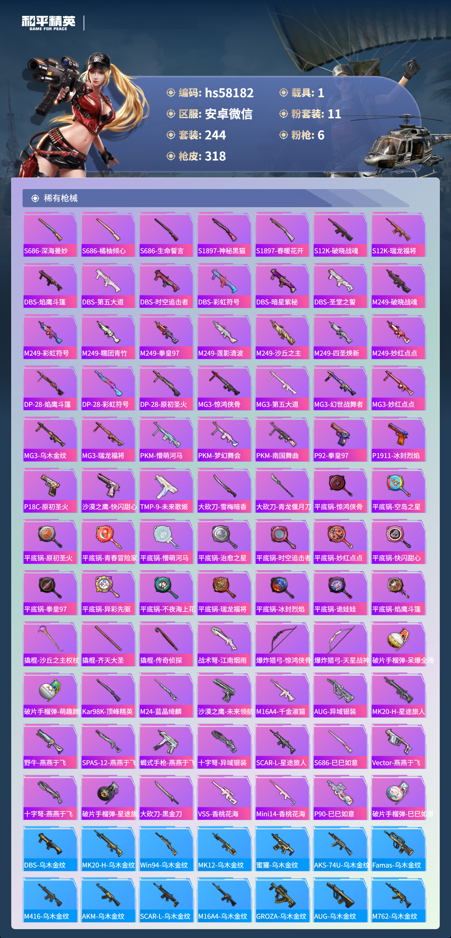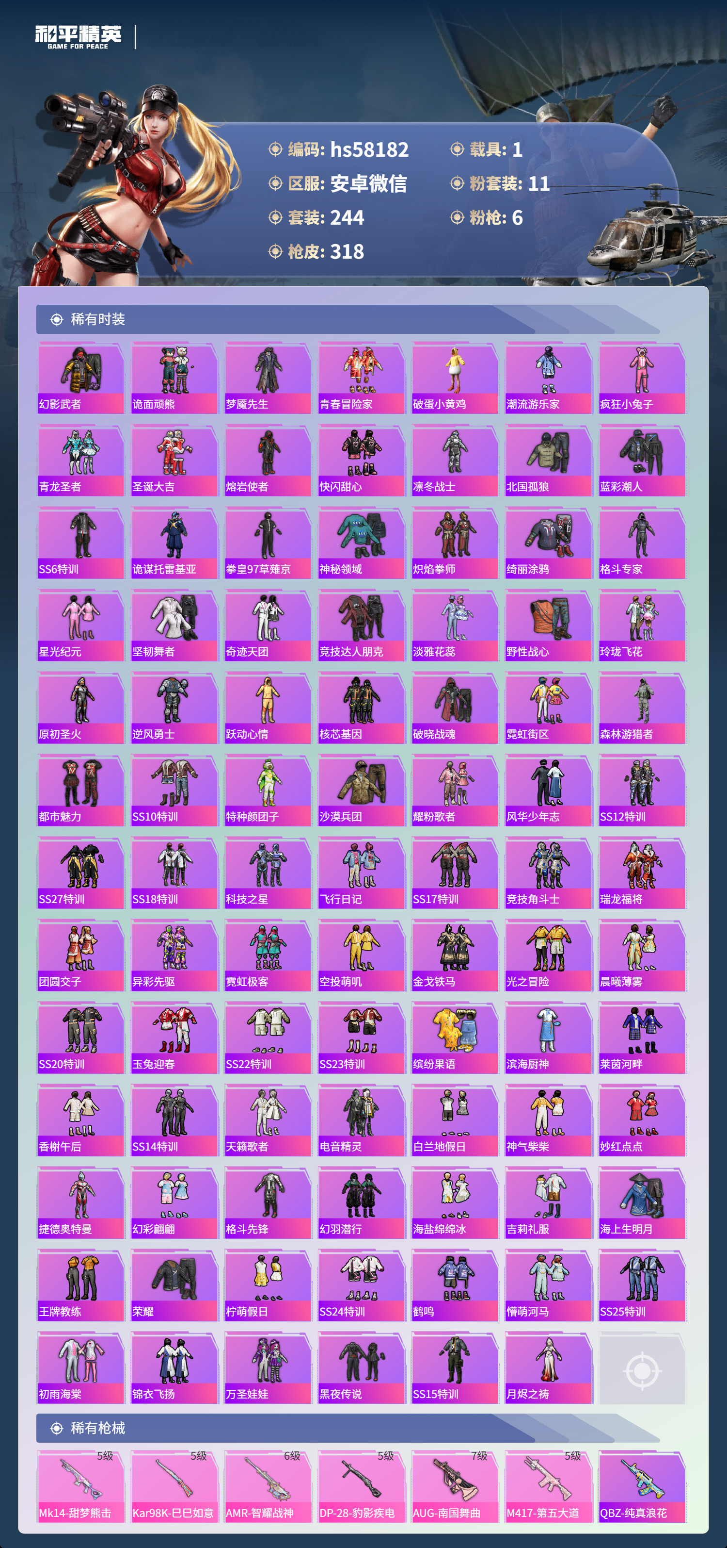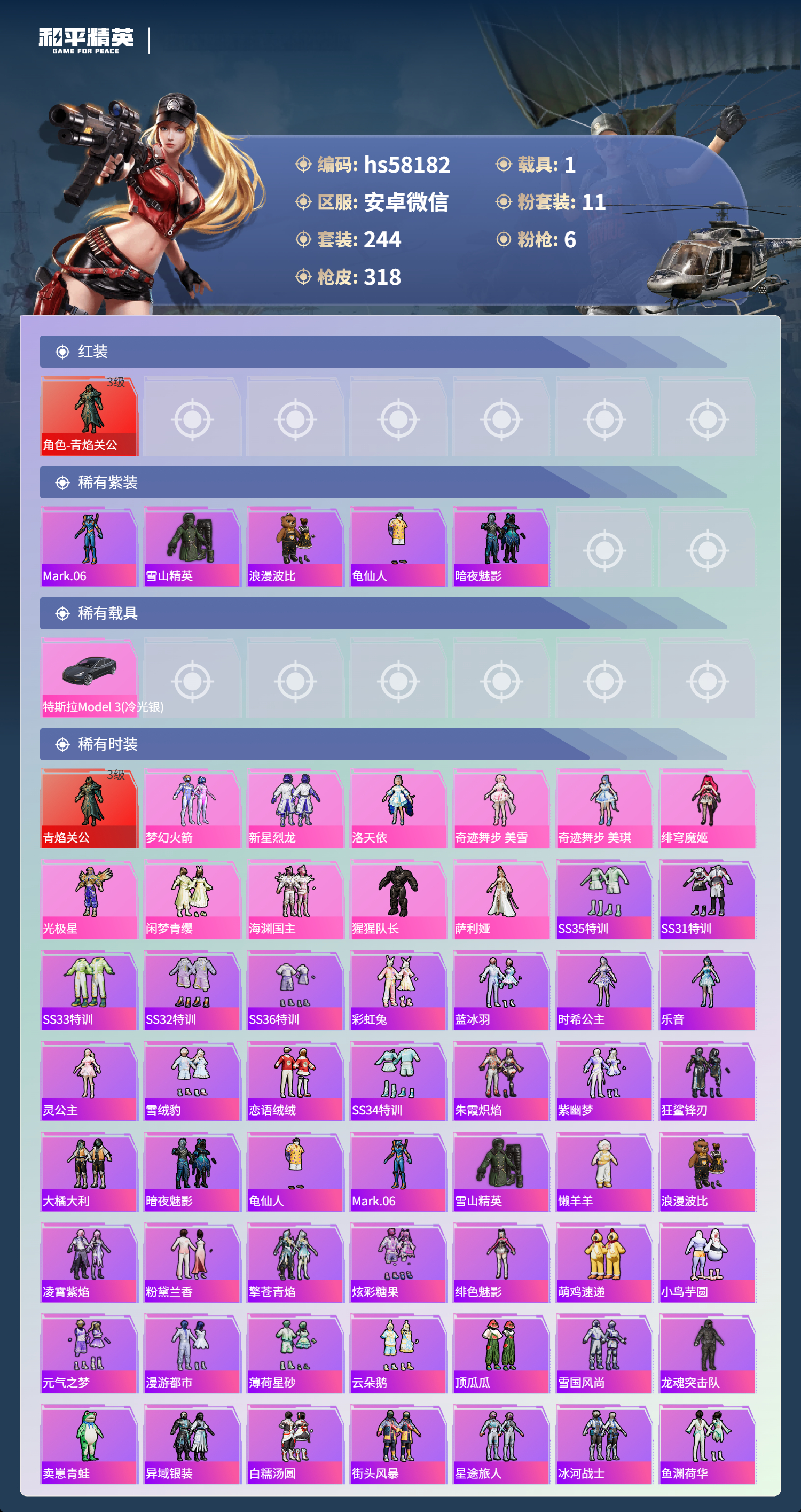 hs58182 安卓微信-9王牌印记-1红装-11粉装-6特效呛-1载具-热力值-244套装-318呛皮-2卓越印记-1传奇印记【1红装】角色-青焰关公/3级【11粉装】角色-奇迹舞步 美雪角色-洛天依角色-猩猩队长角色-光极星套装-海渊国主套装-梦幻火箭套装-新星烈龙角色-奇迹舞步 美琪角色-绯穹魔姬套装-闲梦青缨角色-萨利娅【6特效呛】mk14-甜梦熊击