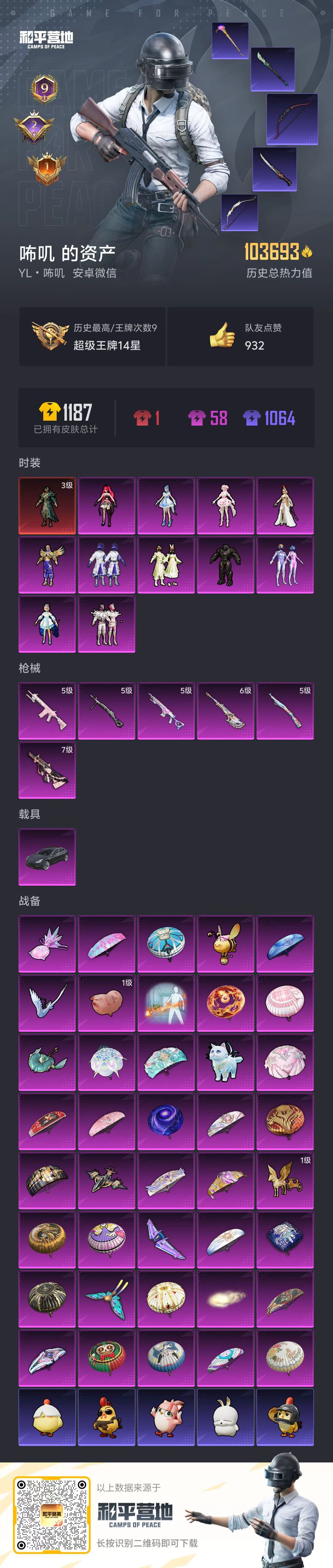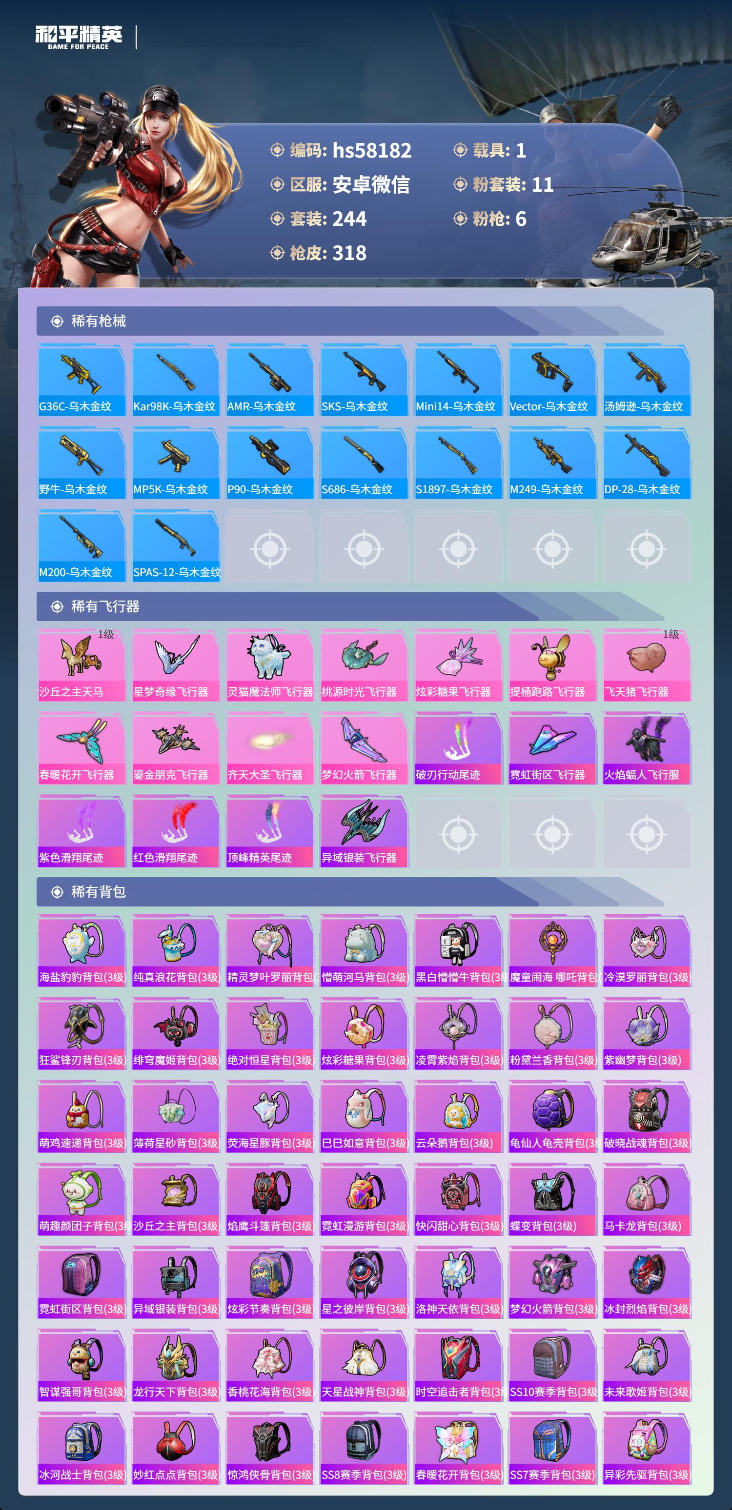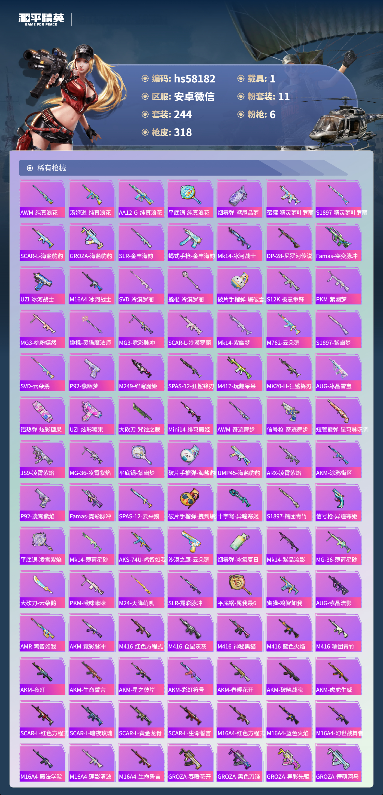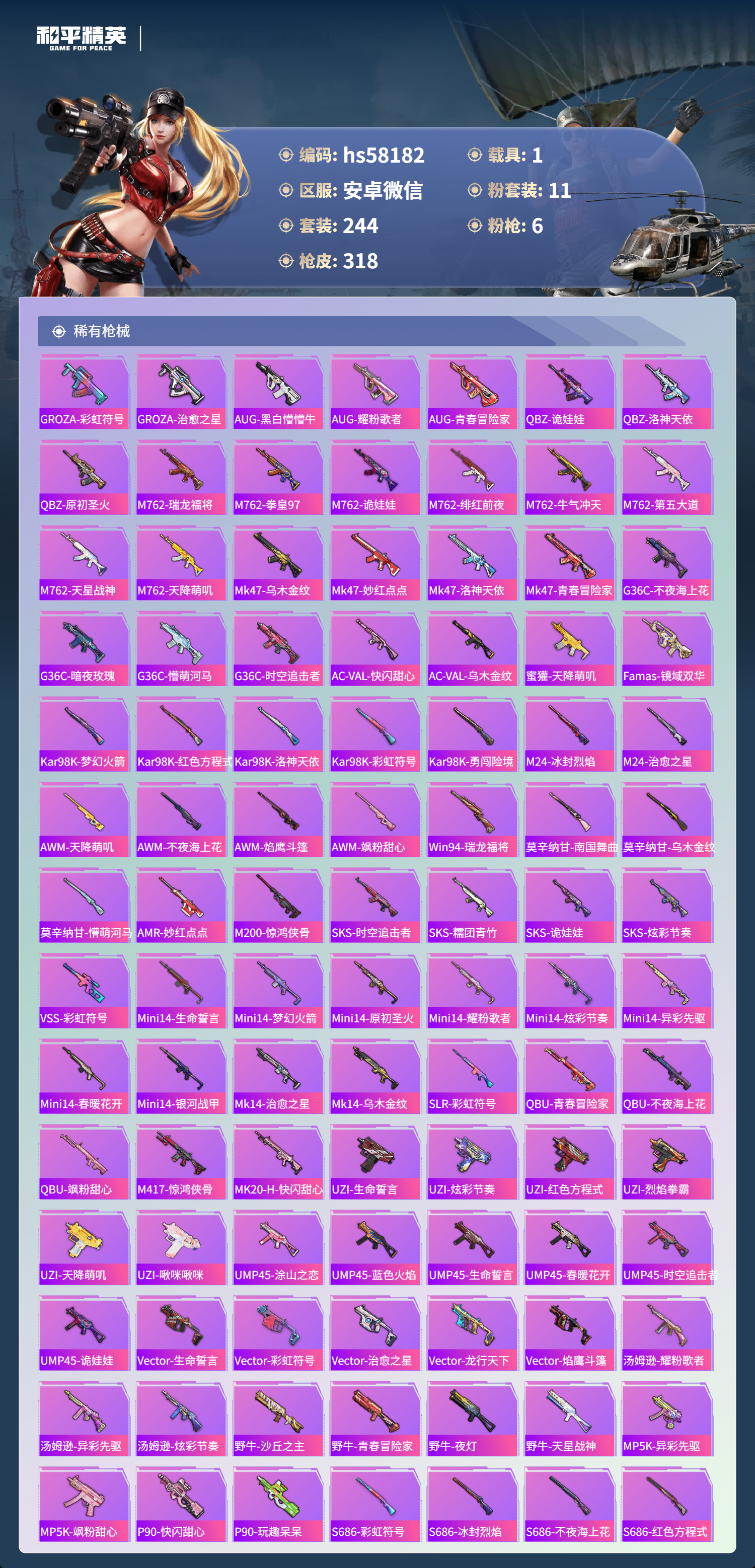 hs58182 安卓微信-9王牌印记-1红装-11粉装-6特效呛-1载具-热力值-244套装-318呛皮-2卓越印记-1传奇印记【1红装】角色-青焰关公/3级【11粉装】角色-奇迹舞步 美雪角色-洛天依角色-猩猩队长角色-光极星套装-海渊国主套装-梦幻火箭套装-新星烈龙角色-奇迹舞步 美琪角色-绯穹魔姬套装-闲梦青缨角色-萨利娅【6特效呛】mk14-甜梦熊击