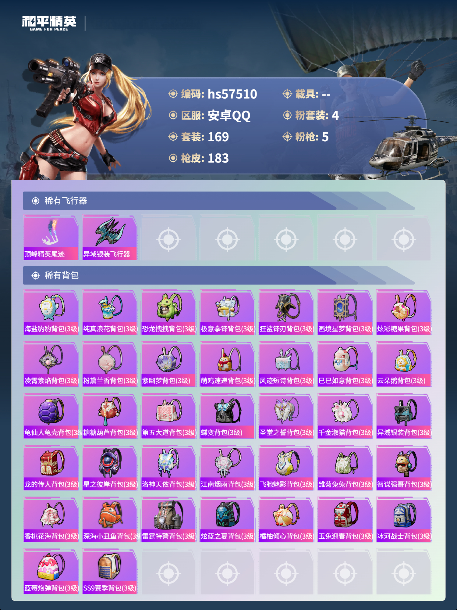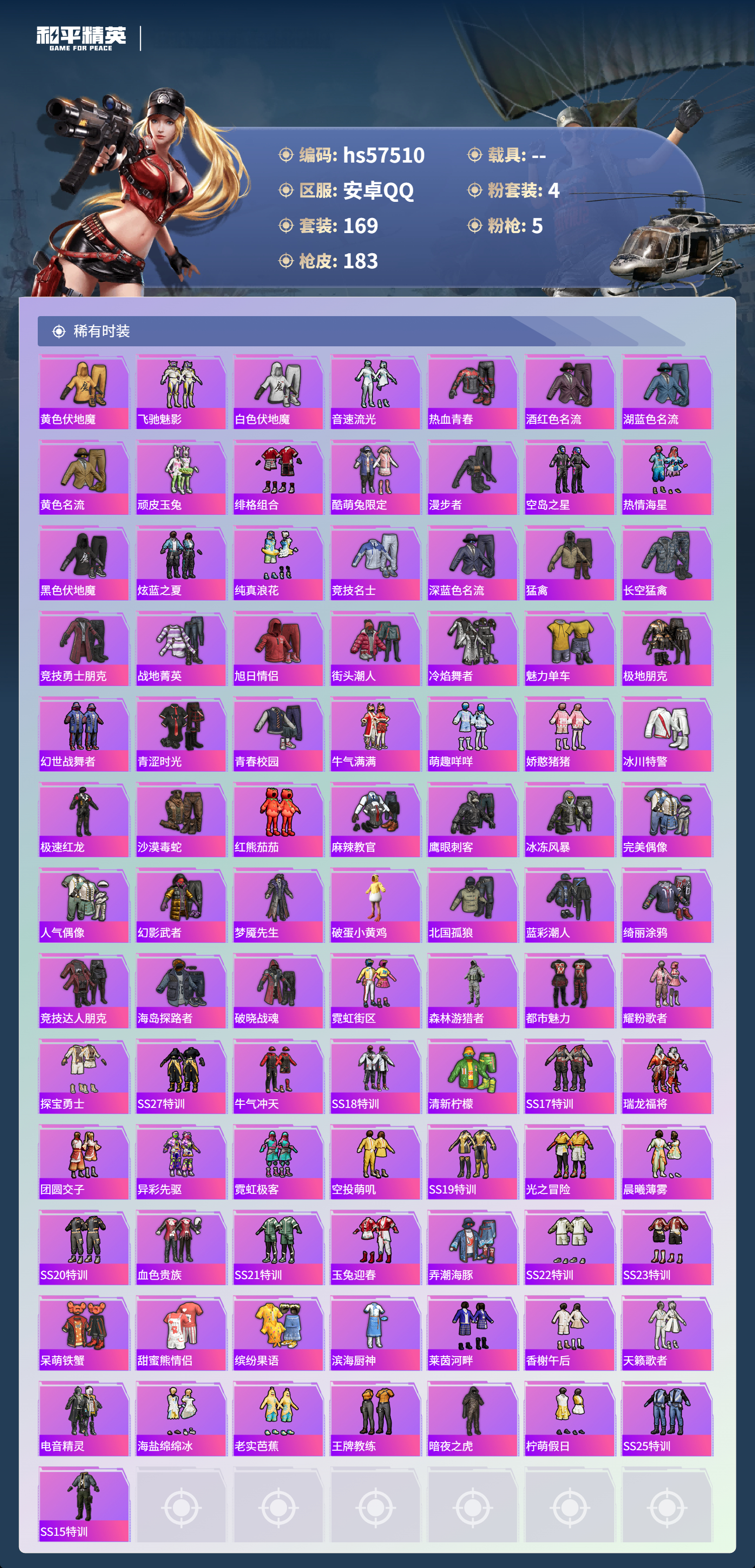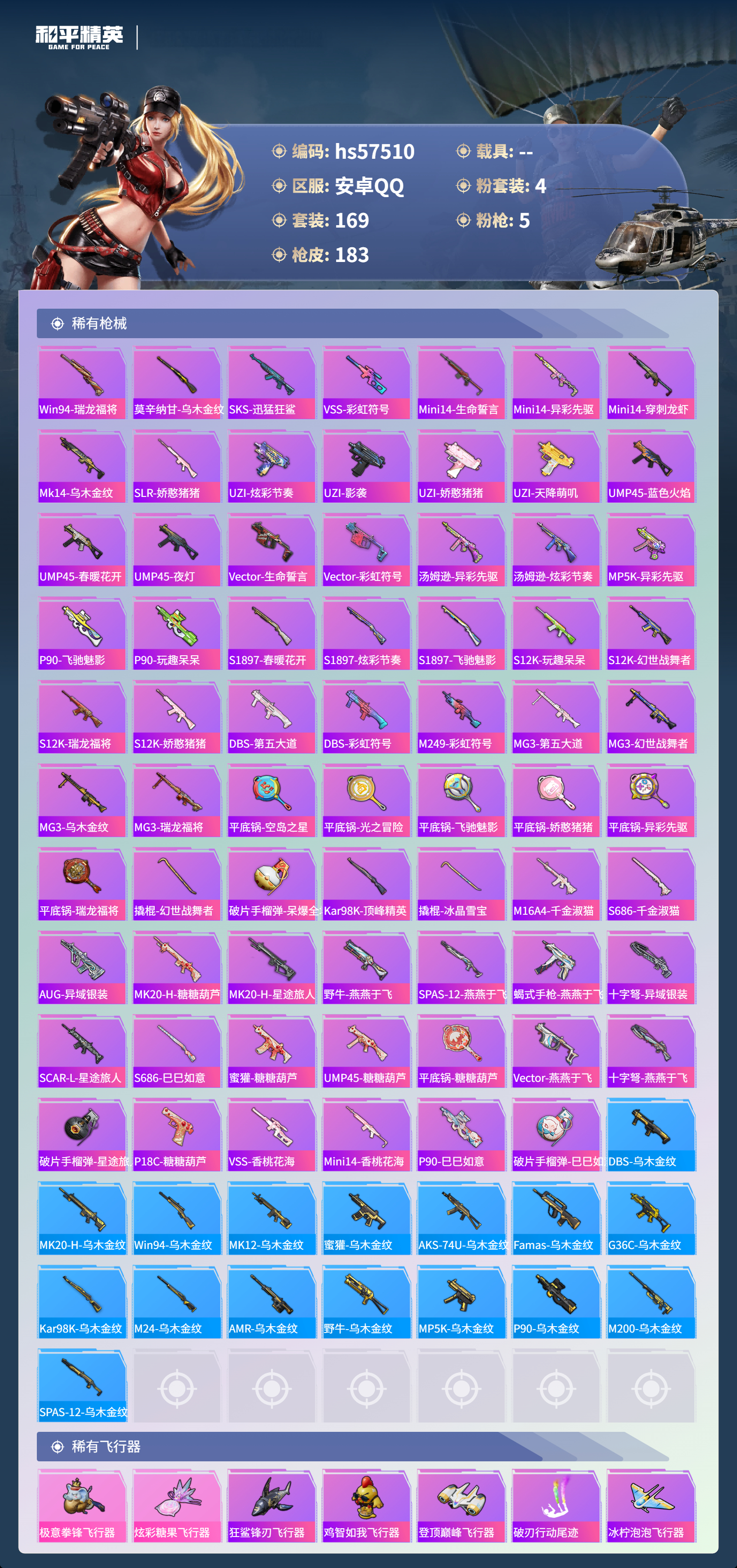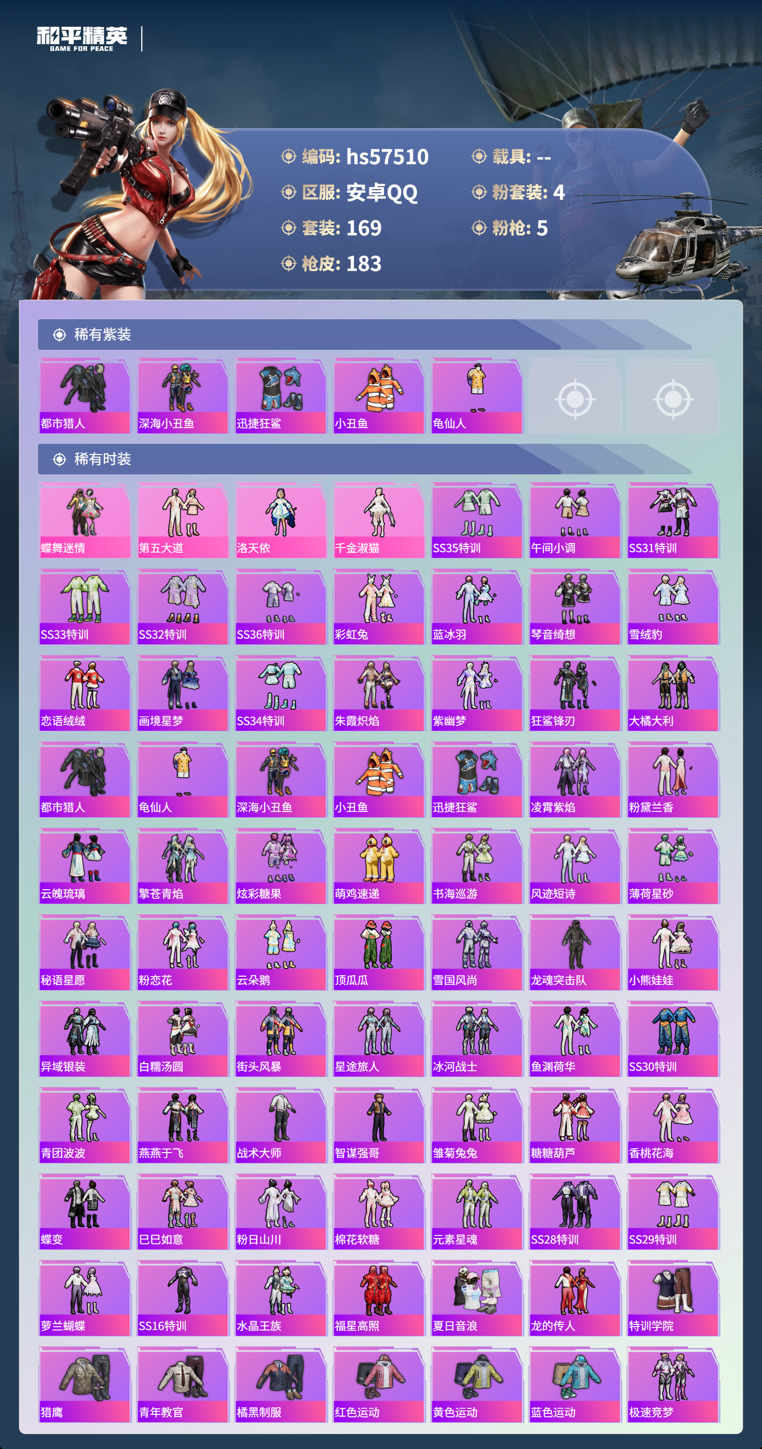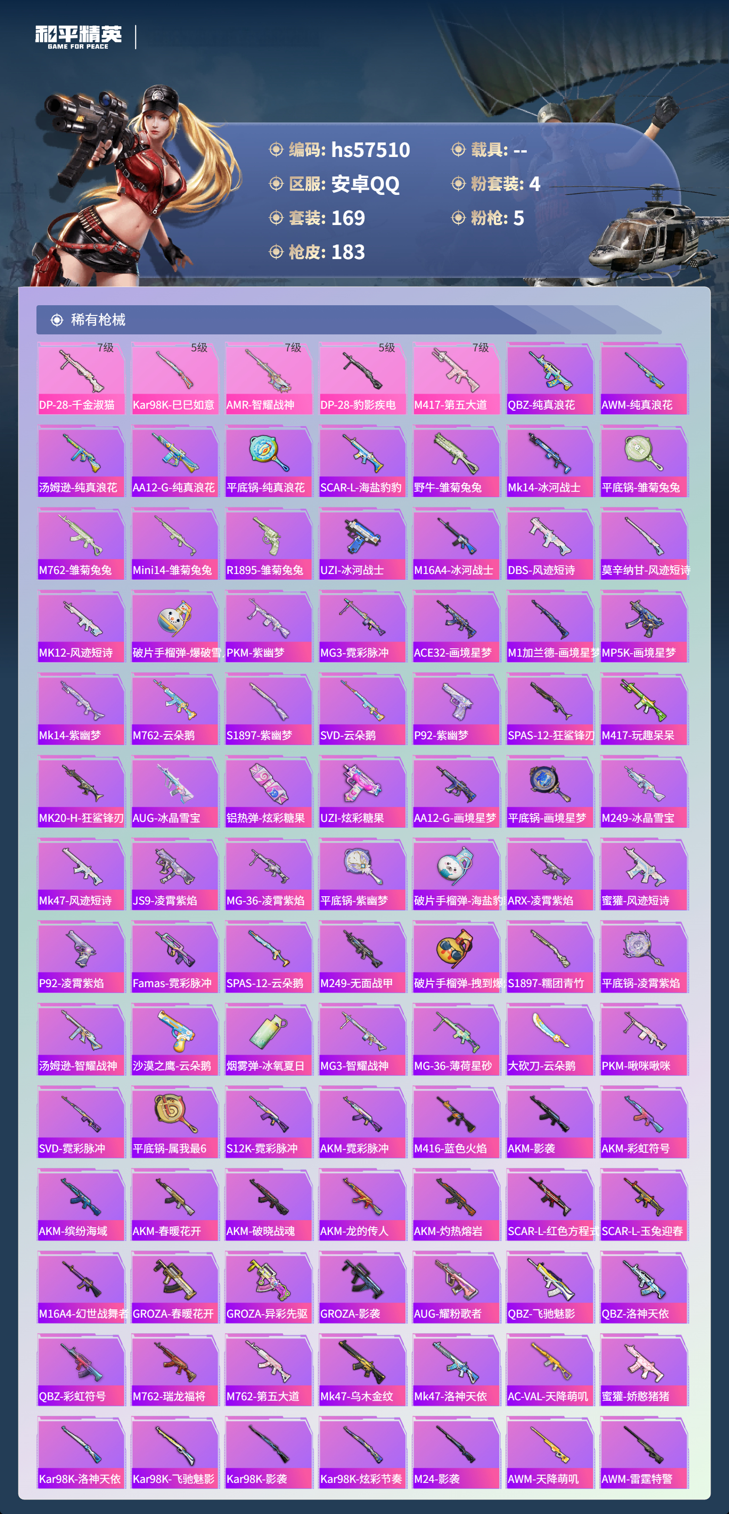 hs57510 安卓手q-13王牌印记-4粉装-5特效呛-60791热力值-169套装-183呛皮-6卓越印记-1传奇印记【4粉装】套装-蝶舞迷情角色-洛天依套装-第五大道角色-千金淑猫【5特效呛】kar98k-巳巳如意/5级amr-智耀战神/7级dp-28-豹影疾电/5级m417-第五大道/7级dp-28-千金淑猫/7级【5稀有紫装】都市猎人深海小丑鱼迅捷狂鲨小丑鱼