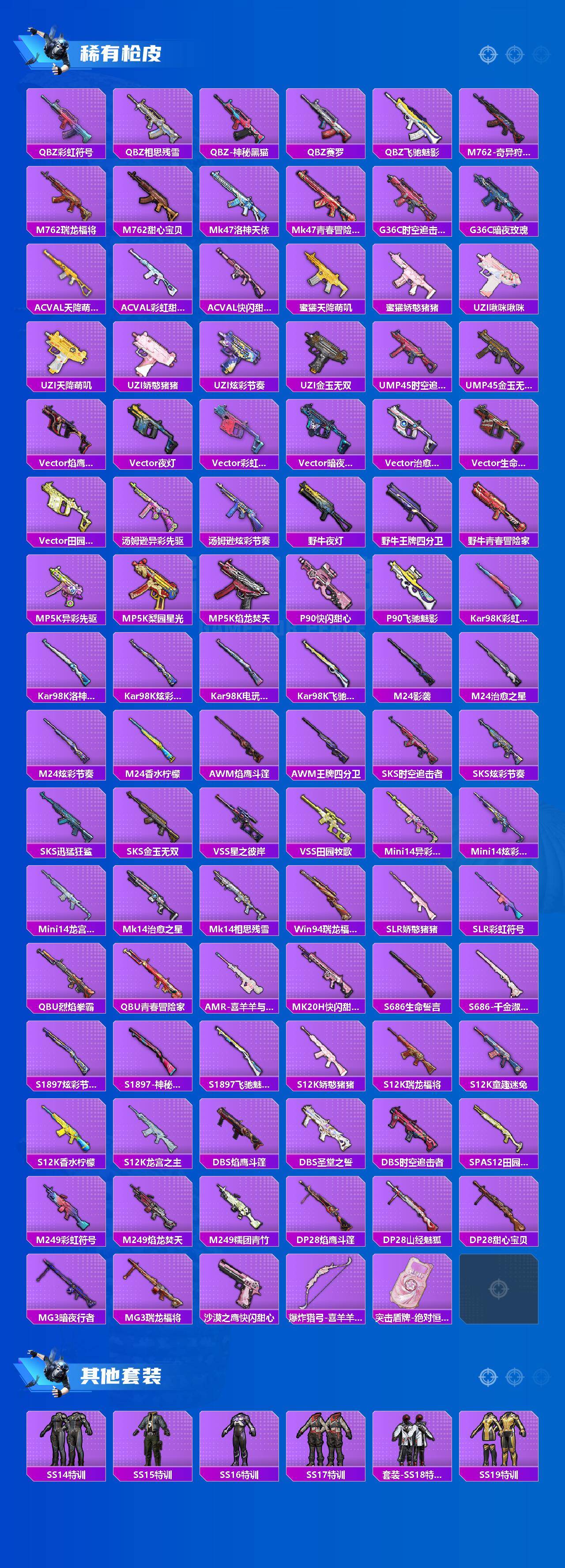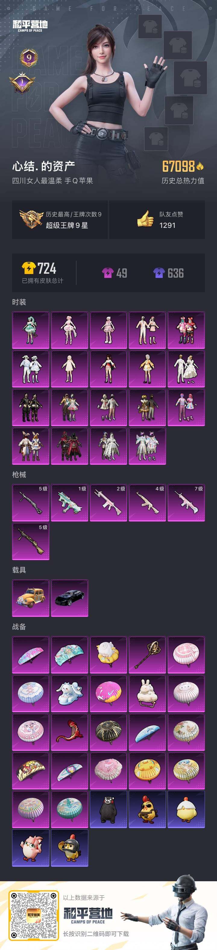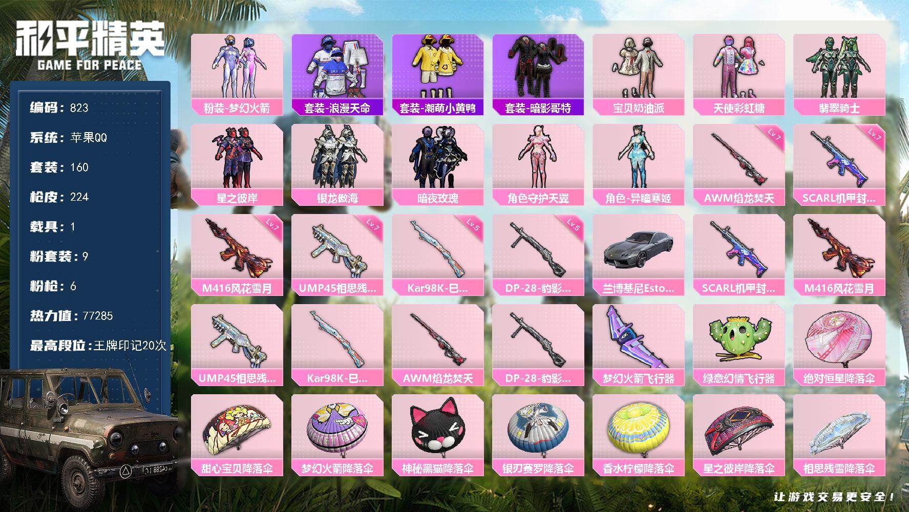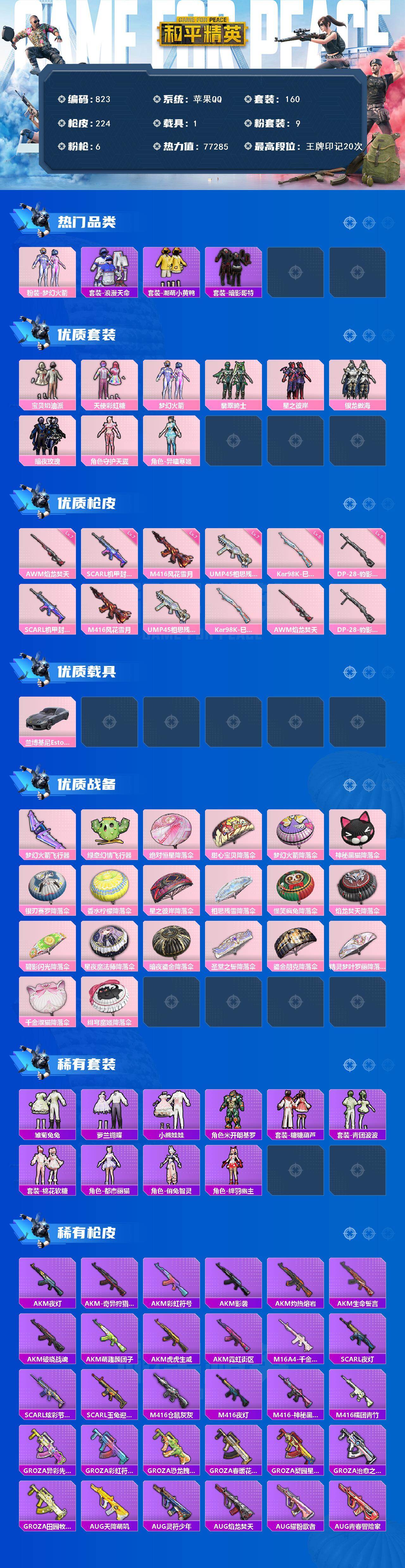 [15806703]苹果 手q-9粉装-6特效呛-1载具-3粉色飞行器-77285热力值-20王牌印记-160套装-224呛皮 【热门品类】:粉装-梦幻火箭,套装-浪漫天命,套装-潮萌小黄鸭,套装-暗影哥特 【粉色套装】:粉装-宝贝奶油派,粉装-天使彩虹糖,粉装-梦幻火箭,粉装-翡翠骑士,粉装-星之彼岸,粉装-银龙傲海,粉装-暗夜玫瑰,角色-守护天翼,角色-异瞳寒姬 【粉色呛皮等级】:scar-l-机甲封神七级,m416-风花雪月七级,ump45-相思残雪七级,kar98k-巳巳如意五级,awm-焰龙焚天七级,dp-28-豹影疾电五级 【粉色载具】:兰博基尼estoque(银翼灰) 【粉色呛皮】:scar-l-机甲封神,m416-风花雪月,ump45-相思残雪,kar98k-巳巳如意,awm-焰龙焚天,dp-28-豹影疾电 【粉色飞行器】:梦幻火箭飞行器,绿意幻情飞行器 【粉色降落伞】:绝对恒星降落伞,甜心宝贝降落伞,梦幻火箭降落伞,神秘黑猫降落伞,银刃赛罗降落伞,香水柠檬降落伞,星之彼岸降落伞,相思残雪降落伞,怪笑疯兔降落伞,焰龙焚天降落伞,碧影闪光降落伞,星夜魔法师降落伞,暗夜鎏金降落伞,圣堂之誓降落伞,鎏金朋克降落伞,精灵梦叶罗丽降落伞,千金淑猫降落伞,绯穹魔姬降落伞,炫彩糖果降落伞 【稀有套装】:套装-雪国风尚,套装-雏菊兔兔,套装-萝兰蝴蝶,套装-小熊娃娃,角色-米开朗基罗,套装-糖糖葫芦,套装-青团波波,套装-棉花软糖,角色-都市丽猫,角色-俏兔智灵,角色-绛羽幽主,套装-炫彩糖果 【稀有呛皮】:aug-冰晶雪宝,akm-夜灯,akm-奇异狩猎者,akm-彩虹符号,akm-影袭,akm-灼热熔岩,akm-生命誓言,akm-破晓战魂,akm-萌趣颜团子,akm-虎虎生威,akm-霓虹街区,m16a4-千金淑猫,scar-l-夜灯,scar-l-炫彩节奏,scar-l-玉兔迎春,m416-仓鼠灰灰,m416-夜灯,m416-神秘黑猫,m416-糯团青竹,groza-异彩先驱,groza-彩虹符号,groza-恐龙拽拽,groza-春暖花开,groza-梨园星光,groza-治愈之星,groza-田园牧歌,aug-天降萌叽,aug-灵符少年,aug-焰龙焚天,aug-耀粉歌者,aug-青春冒险家,q-彩虹符号,q-相思残雪,q-神秘黑猫,qb