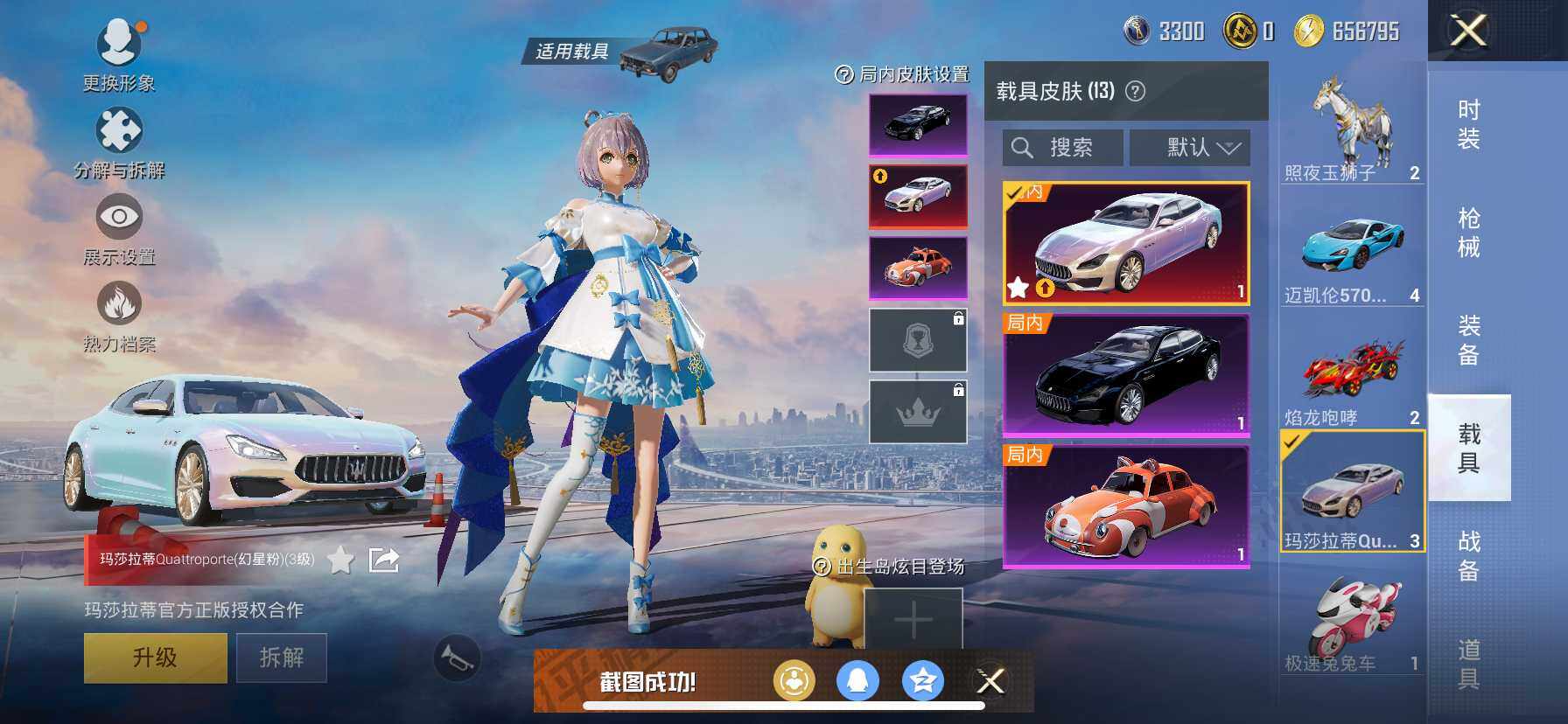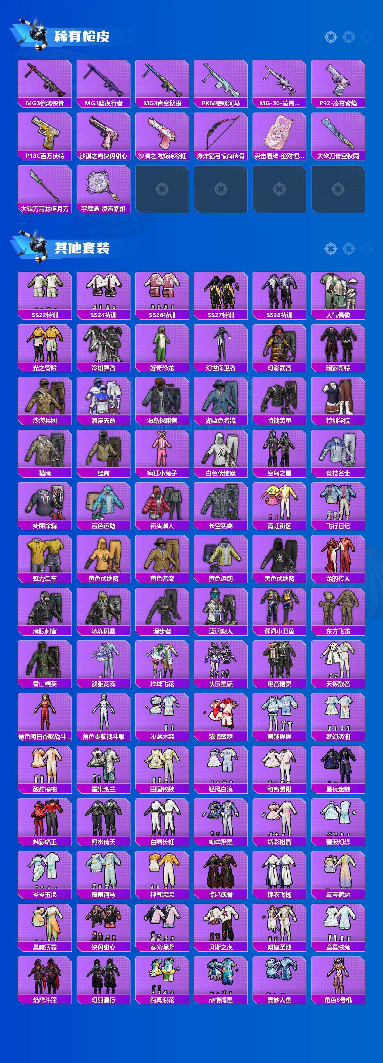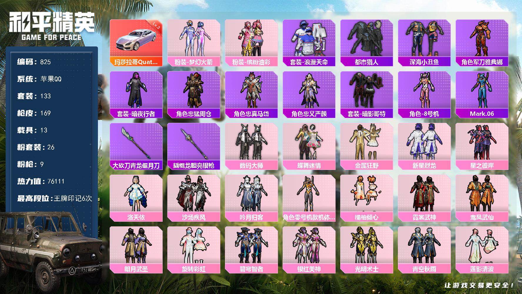 [15805713]苹果 手q-26粉装-9特效呛-13载具-2粉色飞行器-76111热力值-6王牌印记-133套装-169呛皮 【红色载具】:玛莎拉蒂quattropte(幻星粉)三级 【热门品类】:粉装-梦幻火箭,粉装-缤纷油彩,套装-浪漫天命,套装-都市猎人,套装-深海小丑鱼,角色-军刀雅典娜,套装-暗夜行者,角色-忠猛周仓,角色-忠真马岱,角色-忠义严颜,套装-暗影哥特,角色-8号机,角色-mark.06,大砍刀-青龙偃月刀,撬棍-龙胆亮银呛 【粉色套装】:粉装-数码大师,粉装-蝶舞迷情,粉装-梦幻火箭,粉装-金属狂野,粉装-缤纷油彩,粉装-新星烈龙,粉装-星之彼岸,角色-洛天依,粉装-沙场疾风,粉装-吟月归客,角色-零号机款机体服,粉装-橘柚倾心,粉装-霓裳武神,粉装-鸾凤武仙,粉装-朗月武圣,粉装-旋转彩虹,粉装-碧穹智者,粉装-银红美神,粉装-光明术士,粉装-青空秋雨,粉装-莲影清波,粉装-憨憨奶龙,角色-熔岩统帅,角色-冰炎战车,角色-紫钛骑兵,角色-初号机 觉醒ver. 【粉色呛皮等级】:akm-星际浪客五级,akm-绿萝繁花五级,groza-旋转彩虹六级,野牛-青空秋雨五级,m24-翩跹演武二级,awm-橘柚倾心三级,mk20-h-海螺星光二级,dp-28-豹影疾电五级,mg3-洛神天依七级 【粉色载具】:玛莎拉蒂mc20(星石白),玛莎拉蒂quattropte(幻星粉),玛莎拉蒂quattropte(夜幕蓝),玛莎拉蒂grecale(薄荷绿),迈凯伦570s(旭日黄),迈凯伦570s(天际蓝),焰龙咆哮,海龙奔腾,俏皮小熊猫,软萌羊咩咩,极速兔兔车,僚机-萌兔起飞,赤兔,照夜玉狮子 【粉色呛皮】:akm-星际浪客,akm-绿萝繁花,groza-旋转彩虹,野牛-青空秋雨,m24-翩跹演武,awm-橘柚倾心,mk20-h-海螺星光,dp-28-豹影疾电,mg3-洛神天依 【粉色飞行器】:翩跹演武飞行器 【粉色降落伞】:未来战士降落伞,梦幻火箭降落伞,星之彼岸降落伞,洛神天依降落伞,橘柚倾心降落伞,环太平洋降落伞,翩跹演武降落伞,旋转彩虹降落伞,桃夭倾城降落伞,青空秋雨降落伞,歌者泠鸢降落伞,暗夜鎏金降落伞,海螺星光降落伞,莲影清波降落伞,龙行天下降落伞,熔岩统帅降落伞,猪猪侠降落伞,辉耀战甲降落伞,创世·救赎降落伞