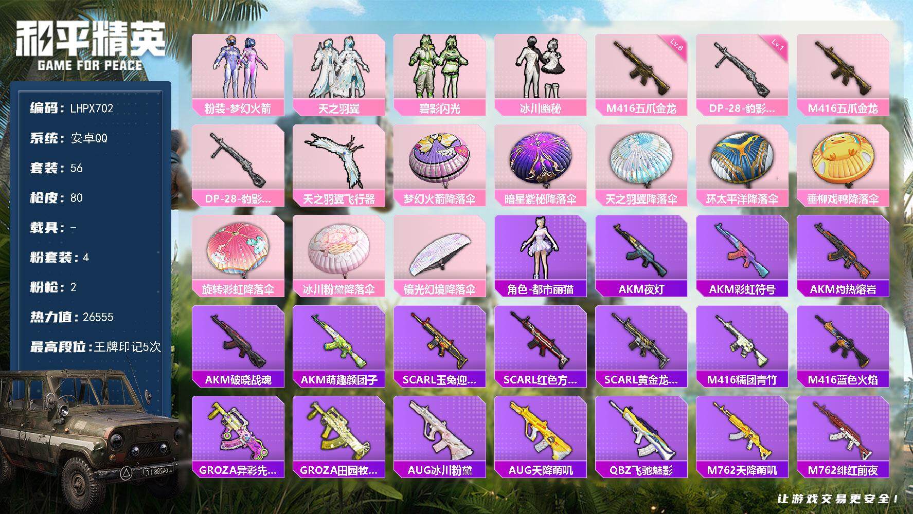 [15824876]【特价出售/店主推荐】安卓 手q-4粉装-2特效呛-0载具-1粉色飞行器-26555热力值-5王牌印记-56套装-80呛皮 【热门品类】:粉装-梦幻火箭 【粉色套装】:粉装-梦幻火箭,粉装-天之羽翼,粉装-碧影闪光,粉装-冰川幽秘 【粉色呛皮等级】:m416-五爪金龙六级,dp-28-豹影疾电一级 【粉色呛皮】:m416-五爪金龙,dp-28-豹影疾电 【粉色飞行器】:天之羽翼飞行器 【粉色降落伞】:梦幻火箭降落伞,暗星紫秘降落伞,天之羽翼降落伞,环太平洋降落伞,垂柳戏鸭降落伞,旋转彩虹降落伞,冰川粉黛降落伞,镜光幻境降落伞 【稀有套装】:角色-都市丽猫 【稀有呛皮】:akm-夜灯,akm-彩虹符号,akm-灼热熔岩,akm-破晓战魂,akm-萌趣颜团子,scar-l-玉兔迎春,scar-l-红色方程式,scar-l-黄金龙骨,m416-糯团青竹,m416-蓝色火焰,groza-异彩先驱,groza-田园牧歌,aug-冰川粉黛,aug-天降萌叽,q-飞驰魅影,m762-天降萌叽,m762-绯红前夜,mk47-天之羽翼,ac-val-天降萌叽,ac-val-快闪甜心,蜜獾-天降萌叽,蜜獾-娇憨猪猪,uzi-娇憨猪猪,ump45-夜灯,ump45-生命誓言,ump45-金玉无双,vect-田园牧歌,汤姆逊-异彩先驱,mp5k-异彩先驱,p90-快闪甜心,p90-筑梦精灵,p90-飞驰魅影,kar98k-彩虹符号,kar98k-影袭,kar98k-梦幻火箭,kar98k-飞驰魅影,m24-影袭,awm-垂柳戏鸭,sks-天之羽翼,sks-炫彩节奏,sks-焦糖拿铁,vss-田园牧歌,vss-碧影闪光,mini14-异彩先驱,mini14-梦幻火箭,slr-娇憨猪猪,莫辛纳甘-炙焰牛王,mk20-h-快闪甜心,s686-生命誓言,s686-千金淑猫,s1897-炫彩节奏,s1897-碧影闪光,s1897-飞驰魅影,s12k-娇憨猪猪,dbs-暗星紫秘,spas-12-田园牧歌,m249-糯团青竹,沙墨之鹦-快闪甜心,沙墨之鹦-旋转彩虹 【其他套装】:套装-ss14特训,套装-ss15特训,套装-ss18特训,套装-ss19特训,套装-ss20特训,套装-ss21特训,套装-ss22特训,套装-ss23特训,套装-ss26特训,套装-人气偶像,套装-冷焰舞者