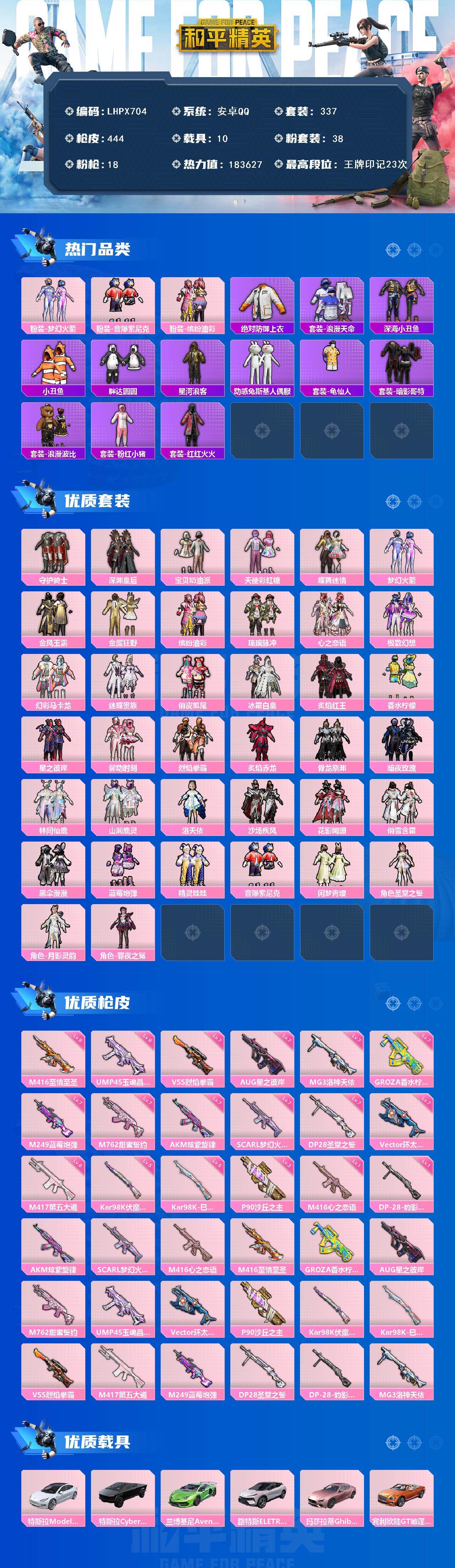 [15824879]【特价出售/店主推荐】安卓 手q-38粉装-18特效呛-10载具-1僚机-13粉色飞行器-183627热力值-23王牌印记-337套装-444呛皮 【热门品类】:粉装-梦幻火箭,粉装-音爆索尼克,粉装-缤纷油彩,绝对防御上衣,套装-浪漫天命,套装-深海小丑鱼,套装-小丑鱼,套装-胖达圆圆,套装-星河浪客,套装-动感兔斯基人偶服,套装-龟仙人,套装-暗影哥特,套装-浪漫波比,套装-粉红小猪,套装-红红火火 【粉色套装】:粉装-守护骑士,粉装-深渊皇后,粉装-宝贝奶油派,粉装-天使彩虹糖,粉装-蝶舞迷情,粉装-梦幻火箭,粉装-金风玉露,粉装-金属狂野,粉装-缤纷油彩,粉装-琉璃脉冲,粉装-心之恋语,粉装-极致幻想,粉装-幻彩马卡龙,粉装-迷蝶贵族,粉装-俏皮狐尾,粉装-冰霜白皇,粉装-炙焰红王,粉装-香水柠檬,粉装-星之彼岸,粉装-馨动时刻,粉装-烈焰拳霸,粉装-炙焰赤龙,粉装-骨龙祭渊,粉装-暗夜玫瑰,粉装-林间仙鹿,粉装-山涧鹿灵,角色-洛天依,粉装-沙场疾风,粉装-花影阑珊,粉装-俏雪含霜,粉装-黑伞漫漫,粉装-蓝莓炮弹,粉装-精灵娃娃,粉装-音爆索尼克,粉装-闲梦青缨,角色-圣堂之誓,角色-月影灵韵,角色-罪夜之冕 【粉色呛皮等级】:akm-炫紫旋律七级,scar-l-梦幻火箭七级,m416-心之恋语一级,m416-至情至圣九级,groza-香水柠檬七级,aug-星之彼岸七级,m762-甜蜜誓约七级,ump45-玉魂晶魄九级,vect-环太平洋七级,p90-沙丘之主三级,kar98k-伏魔团五级,kar98k-巳巳如意五级,vss-烈焰拳霸七级,m417-第五大道六级,m249-蓝莓炮弹七级,dp-28-圣堂之誓七级,dp-28-豹影疾电一级,mg3-洛神天依七级 【粉色载具】:特斯拉model 3(珍珠白),特斯拉cybertruck(极昼黑),兰博基尼aventad svj(翡翠绿),路特斯eletre(花绽灰),玛莎拉蒂ghibli(粉),宾利欧陆gt敞篷(火焰橘),合金龙骨(绿),杜卡迪 panigale v4(星耀白),鬼马风驰,空客h135-蔚蓝之翼,快艇-塞莎kl27(深潜蓝) 【粉色呛皮】:akm-炫紫旋律,scar-l-梦幻火箭,m416-心之恋语,m416-至情