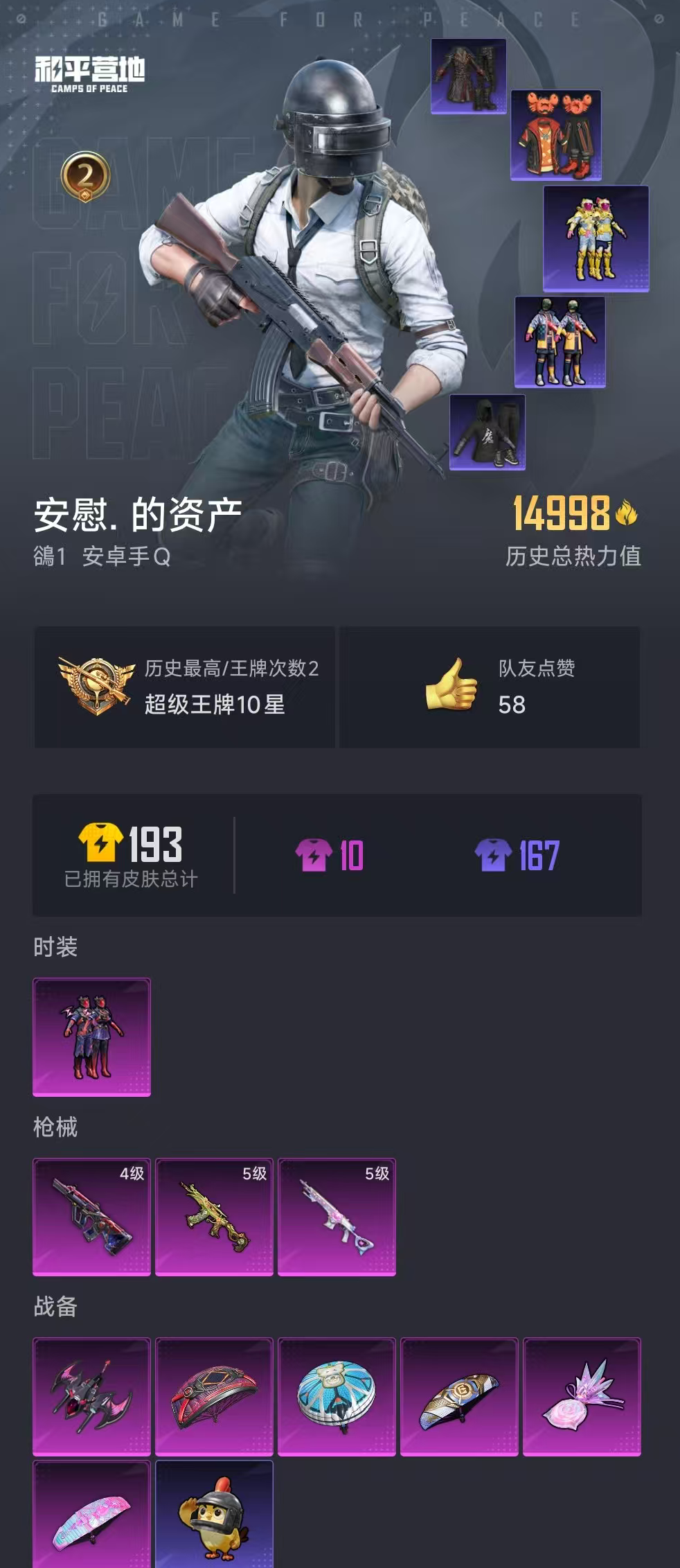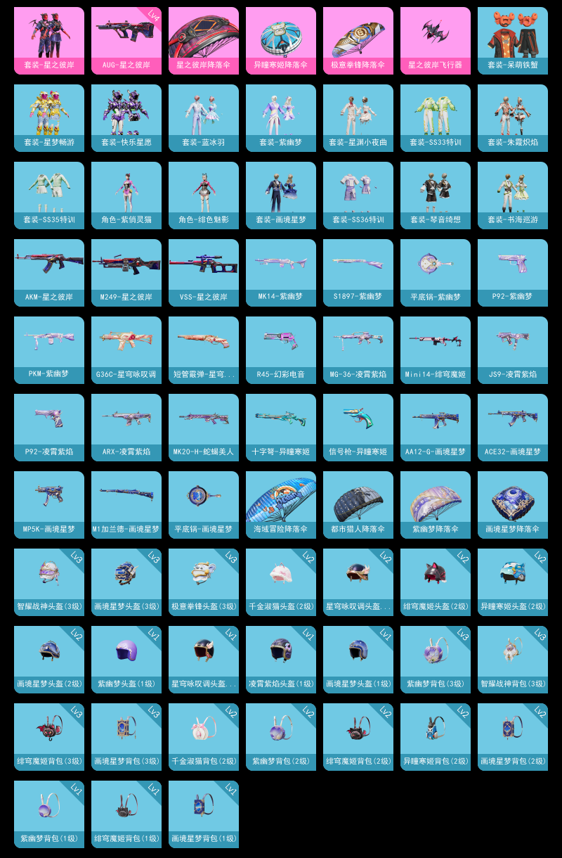 【和平精英】【lyhp20328】1粉装,3特效呛,0载具,历史最高段位:超级王牌10星 王牌印记2次 热力值:14998,31套装,57呛械,65装备,29战备;套装:套装-星之彼岸,套装-黑色伏地魔,套装-竞技名士,套装-长空猛禽,套装-战地督导,套装-魅力单车,套装-呆萌铁蟹,套装-破蛋小黄鸡,套装-快乐星愿,套装-星梦畅游,套装-柠萌假日,套装-街头风暴,角色-绯色魅影,角色-紫俏灵猫,套装-紫幽梦,套装-ss33特训,套装-ss32特训,套装-青翼流星,套装-蓝冰羽,套装-狂鲨锋刃,套装-星渊小夜曲,套装-炫彩糖果,套装-ss34特训,套装-朱霞炽焰,套装-ss35特训,套装-琴音绮想,套装-画境星梦,套装-书海巡游,套装-ss36特训,套装-荧光像素,套装-雪国风尚;呛皮:蜜獾-乌木金纹,g36c-星穹咏叹调,m416-蓝色火焰,m416-红色方程式,scar-l-红色方程式,scar-l-夜灯,scar-l-绿洲时空,ace32-画境星梦,ace32-冰晶雪宝,4级aug-星之彼岸,aug-冰晶雪宝,akm-破晓战魂,akm-星之彼岸,arx-凌霄紫焰,m762-天降萌叽,win94-乌木金纹,m24-天降萌叽,5级mk14-甜梦熊击,mk14-紫幽梦,mk12-乌木金纹,mk20-h-狂鲨锋刃,mk20-h-蛇蝎美人,vss-星之彼岸,mini14-绯穹魔姬,m1加兰德-画境星梦,5级aks-74u-森灵之息,aks-74u-荧光像素,aks-74u-乌木金纹,ump45-生命誓言,ump45-海盐豹豹,mp5k-画境星梦,js9-凌霄紫焰,uzi-炫彩糖果,s1897-紫幽梦,s12k-破晓战魂,aa12-g-画境星梦,spas-12-狂鲨锋刃,mg-36-凌霄紫焰,mg-36-薄荷星砂,pkm-紫幽梦,pkm-荧光像素,mg3-幻世战舞者,mg3-霓彩脉冲,m249-破晓战魂,m249-星之彼岸,m249-冰晶雪宝,p92-紫幽梦,p92-凌霄紫焰,短管霰弹-星穹咏叹调,信号呛-异瞳寒姬,r45-幻彩电音,平底锅-紫幽梦,平底锅-画境星梦,撬棍-冰晶雪宝,破片手留单-爆破雪人,十子怒-异瞳寒姬,铝热弹-炫彩糖果;降落伞:星之彼岸飞行器,炫彩糖果飞行器,狂鲨锋刃飞行器,破刃行动尾迹,登顶巅峰飞行器; 详情看图1粉装3特效呛 星之彼岸 4级星之彼岸aug