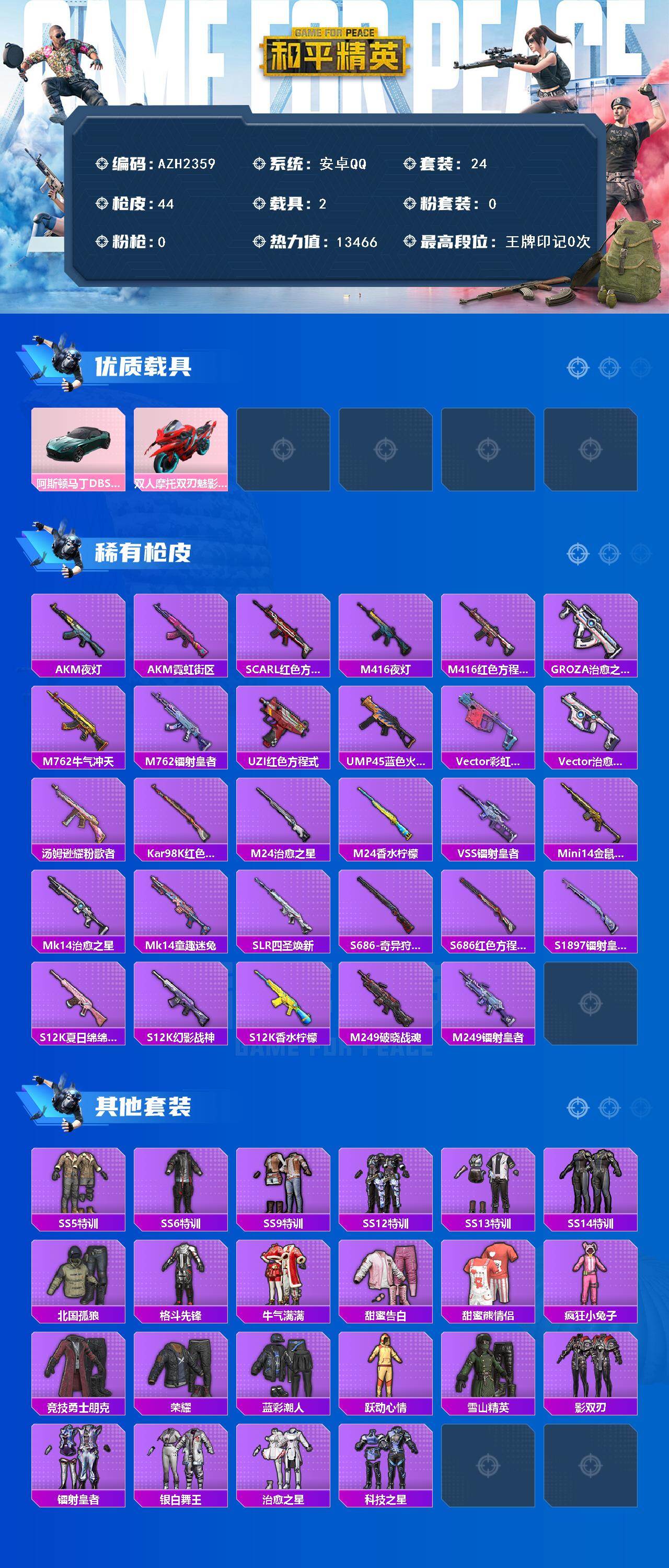 2载具-24套装-44呛皮-【azh2359】安卓 手q【2载具 阿斯顿马丁(绿) 双人摩托-双刃魅影(红)】0粉装-0特效呛-2载具-0粉色飞行器-13466热力值-2王牌印记-24套装-44呛皮 【粉色载具】:阿斯顿马丁dbs(绿),双人摩托-双刃魅影(红) 【稀有呛皮】:akm-夜灯,akm-霓虹街区,scar-l-红色