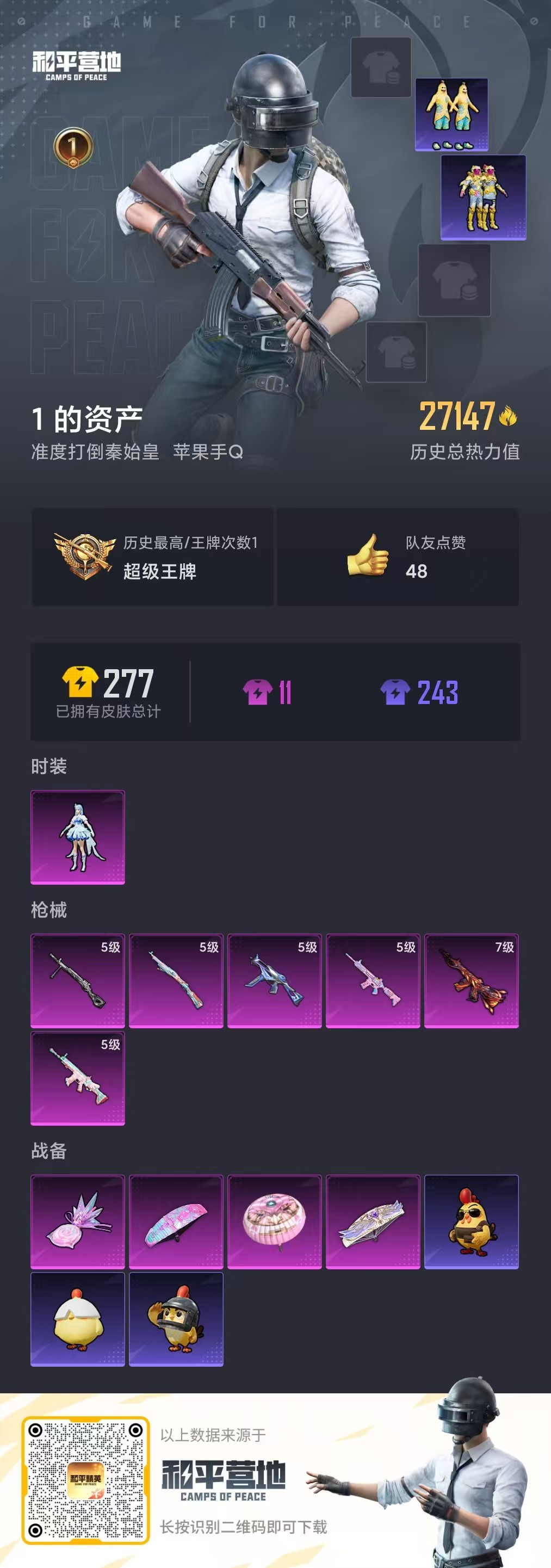 【和平精英】【txhp5593】1粉装,6特效呛,0载具,历史最高段位:超级王牌 王牌印记1次 热力值:27147,56套装,86呛械,89装备,35战备;套装:角色-美琪,套装-红色运动,套装-黄色运动,套装-蓝色运动,套装-白色伏地魔,套装-黑色伏地魔,套装-竞技名士,套装-湖蓝色名流,套装-长空猛禽,套装-漫步者,套装-海岛探路者,套装-鹰眼刺客,套装-幻影武者,套装-魅力单车,套装-森林游猎者,套装-夏日倾情,套装-青涩时光,套装-缤纷果语,套装-alan walker,套装-破蛋小黄鸡,套装-鹤鸣,套装-战术大师,套装-曼妙人鱼,套装-热情海星,套装-纯真浪花,套装-星梦畅游,套装-龟仙人,套装-ss26特训,套装-快闪甜心,套装-春光漫游,套装-空岛之星,套装-贝斯之夜,套装-焰鹰斗篷,套装-幻羽潜行,套装-ss27特训,套装-老实芭蕉,套装-ss28特训,角色-mark.06,套装-街头风暴,套装-海盐绵绵冰,套装-蝶变,套装-ss29特训,角色-紫俏灵猫,套装-ss31特训,套装-ss33特训,套装-ss32特训,套装-大橘大利,套装-星渊小夜曲,套装-炫彩糖果,套装-元气之梦,套装-ss34特训,套装-ss35特训,套装-午间小调,套装-风迹短诗,套装-ss36特训,套装-雪国风尚;呛皮:5级scar-l-锦绣绵绵,scar-l-夜灯,scar-l-海盐豹豹,7级m416-风花雪月,5级m416-电玩时刻,m416-蓝色火焰,m416-红色方程式,m416-糯团青竹,akm-破晓战魂,akm-霓虹街区,akm-涂鸦街区,akm-彩虹符号,akm-龙的传人,akm-霓彩脉冲,akm-绿洲时空,mk47-乌木金纹,mk47-风迹短诗,m762-天降萌叽,aug-冰晶雪宝,aug-紫晶流影,famas-乌木金纹,m16a4-幻世战舞者,m16a4-冰河战士,蜜獾-风迹短诗,蜜獾-乌木金纹,groza-影袭,q-纯真浪花,ac-val-快闪甜心,m200-乌木金纹,莫辛纳甘-乌木金纹,莫辛纳甘-风迹短诗,awm-天降萌叽,awm-焰鹰斗篷,awm-纯真浪花,win94-乌木金纹,5级kar98k-巳巳如意,amr-乌木金纹,m24-奇异狩猎者,mk20-h-快闪甜心,mk20-h-乌木金纹,mini14-鸡智如我,sks-糯团青竹,mk12-风迹短诗,mk12-乌木金纹,mk14-电糖天使,mk14-薄荷星砂,mp5k-乌木金纹,aks-74u-鸡智如我,aks-74u-乌木金纹,uzi-冰河战士,uzi-啾咪啾咪,uzi-炫彩糖果,汤姆逊-纯真浪花,5级ump45-量子极限,ump45-夜灯,ump45-生命誓言,ump45-海盐豹豹,p90-快闪甜心,p90-玩趣呆呆,p90-巳巳如意,p90-乌木金纹,vect-焰鹰斗篷,dbs-焰鹰斗篷,dbs-巴啦啦小魔仙,dbs-创世·救赎,dbs-风迹短诗,dbs-乌木金纹,aa12-g-纯真浪花,s1897-精灵梦叶罗丽,s12k-夜灯,s12k-守护天翼,s12k-霓彩脉冲,spas-12-狂鲨锋刃,s686-生命誓言,m249-无面战甲,5级dp-28-豹影疾电,dp-28-焰鹰斗篷,mg3-幻世战舞者,沙墨之鹦-快闪甜心,信号呛-异瞳寒姬,平底锅-快闪甜心,平底锅-焰鹰斗篷,平底锅-纯真浪花,十子怒-异瞳寒姬,破片手留单-呆爆全场,铝热弹-炫彩糖果;降落伞:炫彩糖果飞行器,空岛之星尾迹,狂鲨锋刃飞行器,登顶巅峰飞行器; 详情看图1王牌印记-2.7w热力值-1粉-6特 美琪 满级风花雪月m4