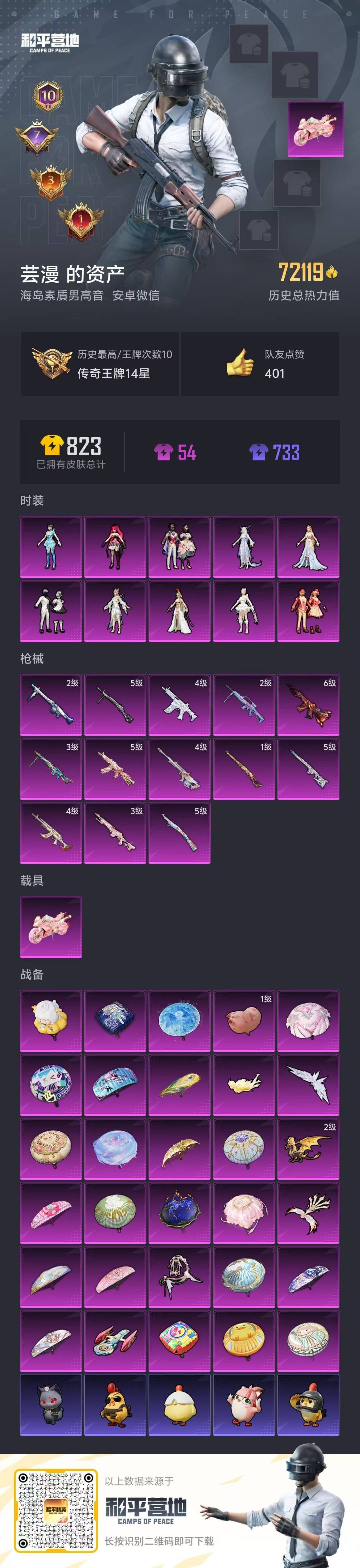 [15834217]10粉装 13特效呛 1载具 10印记 可二次 可修改实名 安全保护中 【热门装扮】:萨利娅月影灵韵千金淑猫绯穹魔姬异瞳寒姬智耀战神幻海仙踪星穹咏叹调妙趣可丽冰川幽秘 【载具】:盛世惊鸿摩托车 【稀有呛皮】:mk14-盛世惊鸿m762-鬼刀kar98k-圣域龙灵amr-智耀战神aks-74u-星穹咏叹调svd-月影灵韵kar98k-巳巳如意mg3-辉羽雀灵dp-28-豹影疾电蜜獾-荧海星豚mg-36-幻彩电音m416风花雪月mg3洛神天依 【六级特效呛】:六级m416-风花雪月 【五级特效呛】:五级svd-月影灵韵五级kar98k-巳巳如意五级dp-28-豹影疾电五级aks-74u-星穹咏叹调 【四级特效呛】:四级m762-鬼刀四级蜜獾-荧海星豚四级amr-智耀战神 【三级特效呛】:三级mk14-盛世惊鸿三级mg3-辉羽雀灵 【二级特效呛】:二级mg-36-幻彩电音二级mg3-洛神天依 【一级特效呛】:一级kar98k-圣域龙灵 【紫色装扮】:ss34特训套装凌霄紫焰朱霞炽焰擎苍青焰ss33特训套装香榭午后霓虹热舞ss30特训套装ss31特训套装云朵鹅彩虹兔雪绒豹幻世战舞者幻影武者战地督导探宝勇士帅气教官极速红龙柠萌假日完美偶像人气偶像冷焰舞者千禧之恋吉莉礼服夏日音浪电音精灵天籁歌者ss17特训异彩先驱ss18特训豚鼠丹丹夏雨游龙娇憨猪猪萌趣咩咩ss21特训飞驰魅影醇脆可可音速流光极速竞梦ss19特训粉团憨憨香草威化甜心亚梦虚音幻奏猎梦纪元ss20特训无面战甲漫游都市美羊羊薄荷星砂黄色名流魅力单车黄色伏地魔黑色伏地魔冰河战士蝶变香桃花海元气之梦风迹短诗午间小调秘语星愿ss35特训紫俏灵猫萌鸡速递霓虹极客甜蜜告白特战装甲猛禽白色伏地魔破晓战魂破蛋小黄鸡牛气满满深蓝色名流湖蓝色名流牛气冲天灰色格斗者灼焰舞者炫蓝之夏酒红色名流都市魅力长空猛禽街头潮人缤纷果语绮丽涂鸦耀眼新星蓝彩潮人星途旅人青团波波棉花软糖ss29特训粉日山川小熊娃娃雏菊兔兔萝兰蝴蝶糖糖葫芦ss28特训海琴烟风玲辉光之湖巳巳如意竞技名士摩登魅猫街头风