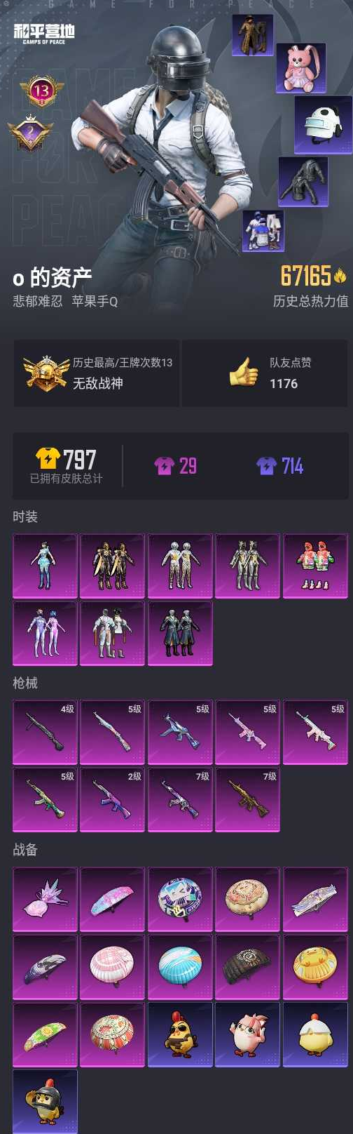 【和平精英】【lyhp18756】地铁满天赋 无敌战神 8粉9特效呛 梦幻火箭 绚金战神 千面幻镜 智能音符 都市猎人 西部牛仔 多呛型 满级m4金龙 满级akm星际 国宝头盔 粉熊背包 【战神框被收回介意勿拍】 8粉装,9特效呛,0载具,历史最高段位:无敌战神 王牌印记13次 热力值:67165,183套装,207呛械,252装备,118战备;套装:套装-梦幻火箭,套装-智能音符,套装-绚金战神,套装-千面幻镜,套装-青空秋雨,套装-炫光之旅,套装-创世·救赎,角色-异瞳寒姬,套装-特训学院,套装-猎鹰,套装-青年教官,套装-橘黑制服,套装-红色运动,套装-黄色运动,套装-蓝色运动,套装-黄色伏地魔,套装-白色伏地魔,套装-黑色伏地魔,套装-竞技名士,套装-深蓝色名流,套装-酒红色名流,套装-湖蓝色名流,套装-黄色名流,套装-边境牛仔,套装-猛禽,套装-长空猛禽,套装-漫步者,套装-蓝色守护者,套装-海岛探路者,套装-雨林探路者,套装-旭日情侣,套装-冷焰舞者,套装-灼焰舞者,套装-都市猎人,套装-西部牛仔,套装-浪漫天命,套装-特战装甲,套装-黄色格斗者,套装-活力之心,套装-战地名士,套装-春日漫步,套装-冰冻风暴,套装-冷酷挑战者,套装-完美偶像,套装-人气偶像,套装-幻影武者,套装-特战英豪,套装-街头潮人,套装-蓝彩潮人,套装-千禧之恋,套装-魅力单车,套装-绮丽涂鸦,套装-狂战萌兔,套装-竞技达人朋克,套装-夜莺强袭者,套装-都市漫游者,套装-野性战心,套装-狂沙舞者,套装-破晓战魂,套装-都市魅力,套装-风行保卫者,套装-热血青春,套装-派对绅士,套装-雪山精英,套装-极地朋克,套装-幻世战舞者,套装-血色贵族,套装-暗影哥特,套装-呆萌铁蟹,套装-夏日倾情,套装-缤纷果语,套装-滨海厨神,套装-alan walker,套装-龙魂突击队,套装-风暴特警,套装-灿烂千阳,套装-元素星魂,套装-胖达团团,套装-格斗先锋,套装-旷野奇兵,套装-麻辣教官,套装-小丑鱼,套装-疯狂小兔子,套装-阳光火鸡,套装-军械专家,套装-格斗专家,套装-鹤鸣,套装-霓虹街区,套装-隐空刺,套装-动感兔斯基人偶服,套装-夏日音浪,套装-nv战队服,套装-牛气满满,套装-战术大师,套装-牛气冲天,套装-ss18特训,套装-耀粉歌者,套装-飞行日记,套装-热情海星,套装-纯真浪花,套装-暴风机械师,套装-智慧隐士,角色-军刀雅典娜,套装-异彩先驱,套装-霓虹极客,套装-ss19特训,套装-极速竞梦,套装-飞驰魅影,套装-音速流光,套装-炫蓝之夏,套装-ss20特训,套装-甜心亚梦,套装-虚音幻奏,套装-ss21特训,套装-萌趣咩咩,套装-娇憨猪猪,套装-夏雨游龙,套装-梦幻奶油,套装-玉兔迎春,套装-ss22特训,套装-和煦暖阳,套装-田园牧歌,套装-轻风白浪,套装-熠彩粉晶,套装-光之冒险,套装-绯格组合,套装-ss23特训,套装-龙舌兰冰茶,套装-神气柴柴,套装-懵萌河马,套装-妙红点点,套装-幻彩翩翩,套装-王牌教练,套装-柠萌假日,套装-青玉碎影,套装-ss24特训,套装-龟仙人,套装-涂山之恋,套装-ss25特训,套装-惊鸿侠骨,套装-锦衣飞扬,套装-元气发射,套装-冰河战士,套装-ss26特训,套装-快闪甜心,套装-春光漫游,套装-空岛之星,套装-无暇誓言,套装-萌趣绒叽,套装-贝斯之夜,套装-ss27特训,套装-老实芭蕉,套装-ss28特训,角色-8号机,角色-mark.06,套装-海盐绵绵冰,套装-蝶变,套装-湖畔霞光,套装-ss29特训,角色-紫俏灵猫,套装-异域银装,角色-都市丽猫,套装-ss30特训,套装-绒宝小鹅,套装-ss31特训,套装-智谋强哥,套装-ss33特训,套装-云朵鹅,套装-巳巳如意,套装-ss32特训,套装-彩虹兔,套装-顶瓜瓜,套装-雪绒豹,套装-大橘大利,套装-星渊小夜曲,套装-炫彩糖果,套装-ss34特训,套装-朱霞炽焰,套装-游乐,套装-薄荷星砂,套装-ss35特训,套装-粉黛兰香,套装-萌鸡速递;呛皮:5级scar-l-锦绣绵绵,scar-l-生命誓言,scar-l-未来战士,scar-l-炫彩节奏,scar-l-碧影闪光,scar-l-玉兔迎春,scar-l-星途旅人,scar-l-海盐豹豹,scar-l-冷漠罗丽,scar-l-乌木金纹,蜜獾-娇憨猪猪,蜜獾-天降萌叽,蜜獾-精灵梦叶罗丽,蜜獾-乌木金纹,2级akm-梦之光华,7级akm-星际浪客,5级akm-绿萝繁花,akm-影袭,akm-奇异狩猎者,akm-乌木金纹,m16a4-甜心亚梦,m16a4-幻世战舞者,m16a4-冰河战士,7级m416-五爪金龙,5级m416-电玩时刻,m416-蓝色火焰,m416-红色方程式,m416-暗夜行者,m416-糯团青竹,aug-幻影战神,aug-诡面斩,aug-耀粉歌者,aug-天降萌叽,aug-异域银装,aug-紫晶流影,m762-牛气冲天,m762-彩虹符号,m762-天降萌叽,m762-云朵鹅,ac-val-甜心亚梦,ac-val-乌木金纹,ac-val-天降萌叽,ac-val-快闪甜心,q-神秘黑猫,q-彩虹符号,q-飞驰魅影,q-纯真浪花,groza-影袭,groza-异彩先驱,groza-田园牧歌,groza-懵萌河马,groza-海盐豹豹,mk47-乌木金纹,mk47-妙红点点,arx-凌霄紫焰,g36c-懵萌河马,famas-乌木金纹,svd-云朵鹅,5级kar98k-巳巳如意,kar98k-影袭,kar98k-幻影战神,kar98k-梦幻火箭,kar98k-彩虹符号,kar98k-炫彩节奏,kar98k-飞驰魅影,m24-未来战士,m24-仲夏莫吉托,m24-乌木金纹,amr-暗夜行者,amr-妙红点点,amr-鬼刀,amr-乌木金纹,莫辛纳甘-乌木金纹,莫辛纳甘-懵萌河马,awm-垂柳戏鸭,awm-音爆索尼克,awm-圣堂之誓,awm-纯真浪花,m200-惊鸿侠骨,m200-乌木金纹,win94-乌木金纹,vss-未来战士,vss-碧影闪光,vss-田园牧歌,vss-绿野极光,mk20-h-墨染幽兰,mk20-h-快闪甜心,mk20-h-乌木金纹,mk14-乌木金纹,mk14-冰河战士,mk14-电糖天使,mk14-薄荷星砂,mini14-梦幻火箭,mini14-异彩先驱,slr-娇憨猪猪,slr-霓彩脉冲,sks-金玉无双,sks-炫彩节奏,sks-糯团青竹,m417-惊鸿侠骨,m417-玩趣呆呆,vect-生命誓言,vect-金玉无双,vect-风花雪月,vect-田园牧歌,uzi-