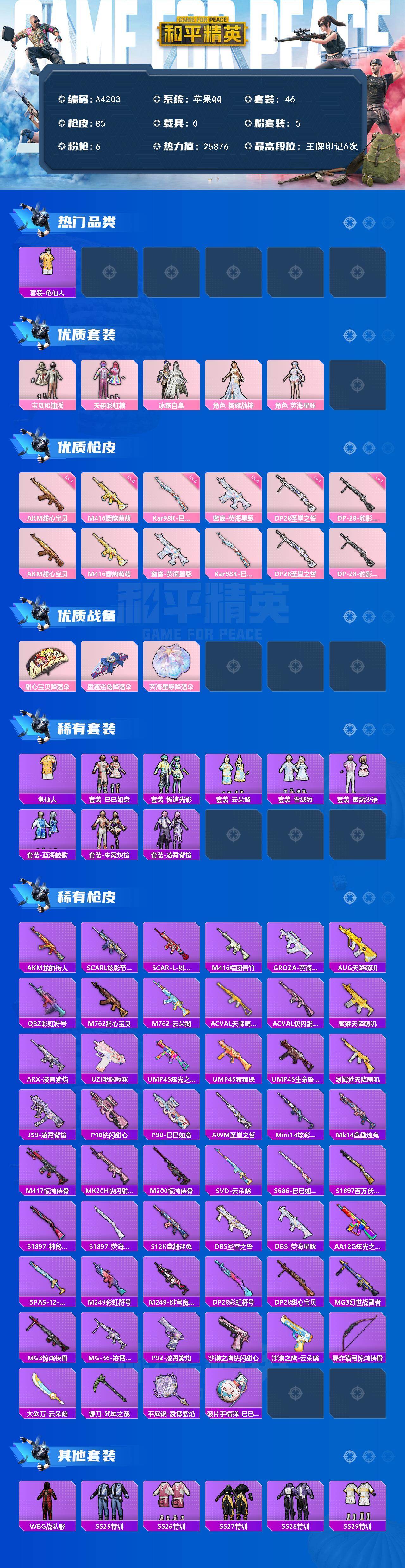 [15835505]苹果 【公主号 龟仙人/宝贝奶油派/天使彩虹糖/akm-甜心宝贝七级】手q-5粉装-6特效呛-0载具-0粉色飞行器-25876热力值-6王牌印记-46套装-85呛皮 【热门品类】:套装-龟仙人 【粉色套装】:粉装-宝贝奶油派,粉装-天使彩虹糖,粉装-冰霜白皇,角色-智耀战神,角色-荧海星豚 【粉色呛皮等级】:akm-甜心宝贝七级,m416-暖熊萌萌六级,蜜獾-荧海星豚四级,kar98k-巳巳如意五级,dp-28-圣堂之誓一级,dp-28-豹影疾电一级 【粉色呛皮】:akm-甜心宝贝,m416-暖熊萌萌,蜜獾-荧海星豚,kar98k-巳巳如意,dp-28-圣堂之誓,dp-28-豹影疾电 【粉色降落伞】:甜心宝贝降落伞,童趣迷兔降落伞,荧海星豚降落伞,炫彩糖果降落伞 【稀有套装】:套装-龟仙人,套装-巳巳如意,套装-极速光影,套装-云朵鹅,套装-雪绒豹,套装-蜜露汐语,套装-蓝海鲸歌,套装-朱霞炽焰,套装-凌霄紫焰 【稀有呛皮】:akm-龙的传人,scar-l-炫彩节奏,scar-l-绯月迷踪,m416-糯团青竹,groza-荧海星豚,aug-天降萌叽,q-彩虹符号,m762-甜心宝贝,m762-云朵鹅,ac-val-天降萌叽,ac-val-快闪甜心,蜜獾-天降萌叽,arx-凌霄紫焰,uzi-啾咪啾咪,ump45-炫光之旅,ump45-猪猪侠,ump45-生命誓言,汤姆逊-天降萌叽,js9-凌霄紫焰,p90-快闪甜心,p90-巳巳如意,awm-圣堂之誓,mini14-炫彩节奏,mk14-童趣迷兔,m417-惊鸿侠骨,mk20-h-快闪甜心,m200-惊鸿侠骨,svd-云朵鹅,s686-巳巳如意,s1897-百万伏特,s1897-神秘黑猫,s1897-荧海星豚,s12k-童趣迷兔,dbs-圣堂之誓,dbs-荧海星豚,aa12-g-炫光之旅,spas-12-云朵鹅,m249-彩虹符号,m249-绯穹魔姬,dp-28-彩虹符号,dp-28-甜心宝贝,mg3-幻世战舞者,mg3-惊鸿侠骨,mg-36-凌霄紫焰,p92-凌霄紫焰,沙墨之鹦-快闪甜心,沙墨之鹦-云朵鹅,爆炸猎弓-惊鸿侠骨,大砍刀-云朵鹅,镰刀-咒蚀之裁,平底锅-凌霄紫焰,破片手留单-巳巳如意 【其他套装】:套装-wbg战队服,套装-ss25特训,套装-ss26特训,套装-ss27特