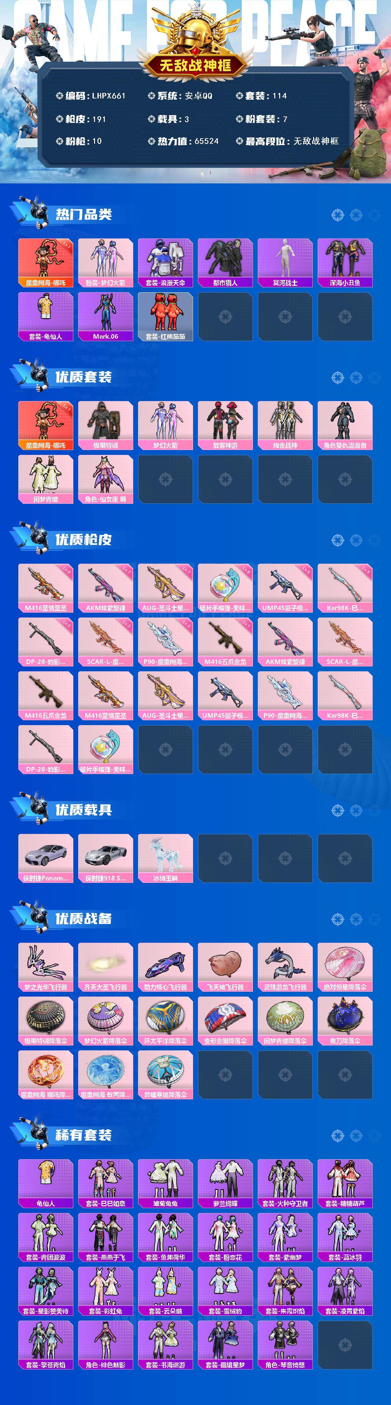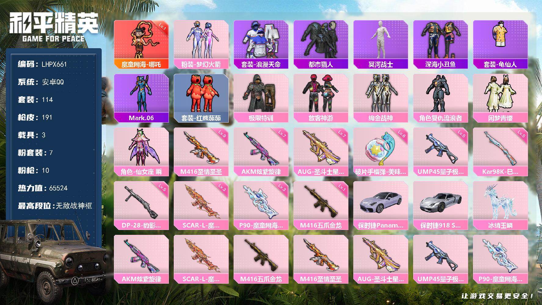 [15835574]【特价出售/店主推荐】安卓 手q-无敌战神框-1神装-7粉装-10特效呛-3载具-8粉色飞行器-65524热力值-11王牌印记-114套装-191呛皮 【红色神装等级】:魔童闹海-哪吒一级 【红色角色神装】:魔童闹海-哪吒 【热门品类】:粉装-梦幻火箭,套装-浪漫天命,套装-都市猎人,套装-冥河战士,套装-深海小丑鱼,套装-龟仙人,角色-mark.06,套装-红熊茄茄 【粉色套装】:粉装-极限特训,粉装-梦幻火箭,粉装-放客神游,粉装-绚金战神,角色-复仇流浪者,粉装-闲梦青缨,角色-仙女座 瞬 【粉色呛皮等级】:akm-炫紫旋律七级,scar-l-魔童闹海 哪吒三级,m416-五爪金龙一级,m416-至情至圣九级,aug-圣斗士星矢七级,ump45-量子极限五级,p90-魔童闹海 敖丙三级,kar98k-巳巳如意五级,dp-28-豹影疾电五级,破片手留单-美味星星糖六级 【粉色载具】:保时捷panamera(星辰紫),保时捷918 sper(液态银),冰绡玉鳞 【粉色呛皮】:akm-炫紫旋律,scar-l-魔童闹海 哪吒,m416-五爪金龙,m416-至情至圣,aug-圣斗士星矢,ump45-量子极限,p90-魔童闹海 敖丙,kar98k-巳巳如意,dp-28-豹影疾电,破片手留单-美味星星糖 【粉色飞行器】:梦之光华飞行器,齐天大圣飞行器,动力核心飞行器,飞天猪飞行器,灵珠游龙飞行器 【粉色降落伞】:绝对恒星降落伞,极限特训降落伞,梦幻火箭降落伞,环太平洋降落伞,变形金刚降落伞,闲梦青缨降落伞,鬼刀降落伞,魔童闹海 哪吒降落伞,魔童闹海 敖丙降落伞,异瞳寒姬降落伞 【稀有套装】:套装-龟仙人,套装-巳巳如意,套装-雏菊兔兔,套装-萝兰蝴蝶,套装-火种守卫者,套装-糖糖葫芦,套装-青团波波,套装-燕燕于飞,套装-鱼渊荷华,套装-粉恋花,套装-紫幽梦,套装-蓝冰羽,套装-星影赞美诗,套装-彩虹兔,套装-云朵鹅,套装-雪绒豹,套装-朱霞炽焰,套装-凌霄紫焰,套装-擎苍青焰,角色-绯色魅影,套装-书海巡游,套装-画境星梦,套装-琴音绮想 【稀有呛皮】:akm-环太平洋,akm-缤纷海域,akm-霓虹街区,akm-龙的传人,m16a4-冥河战士,m16a4-莲影清波,scar-l-夜灯,scar-l-炫彩节奏,scar-l