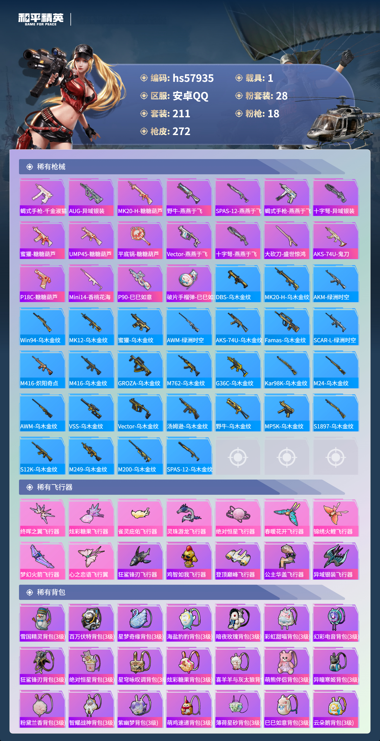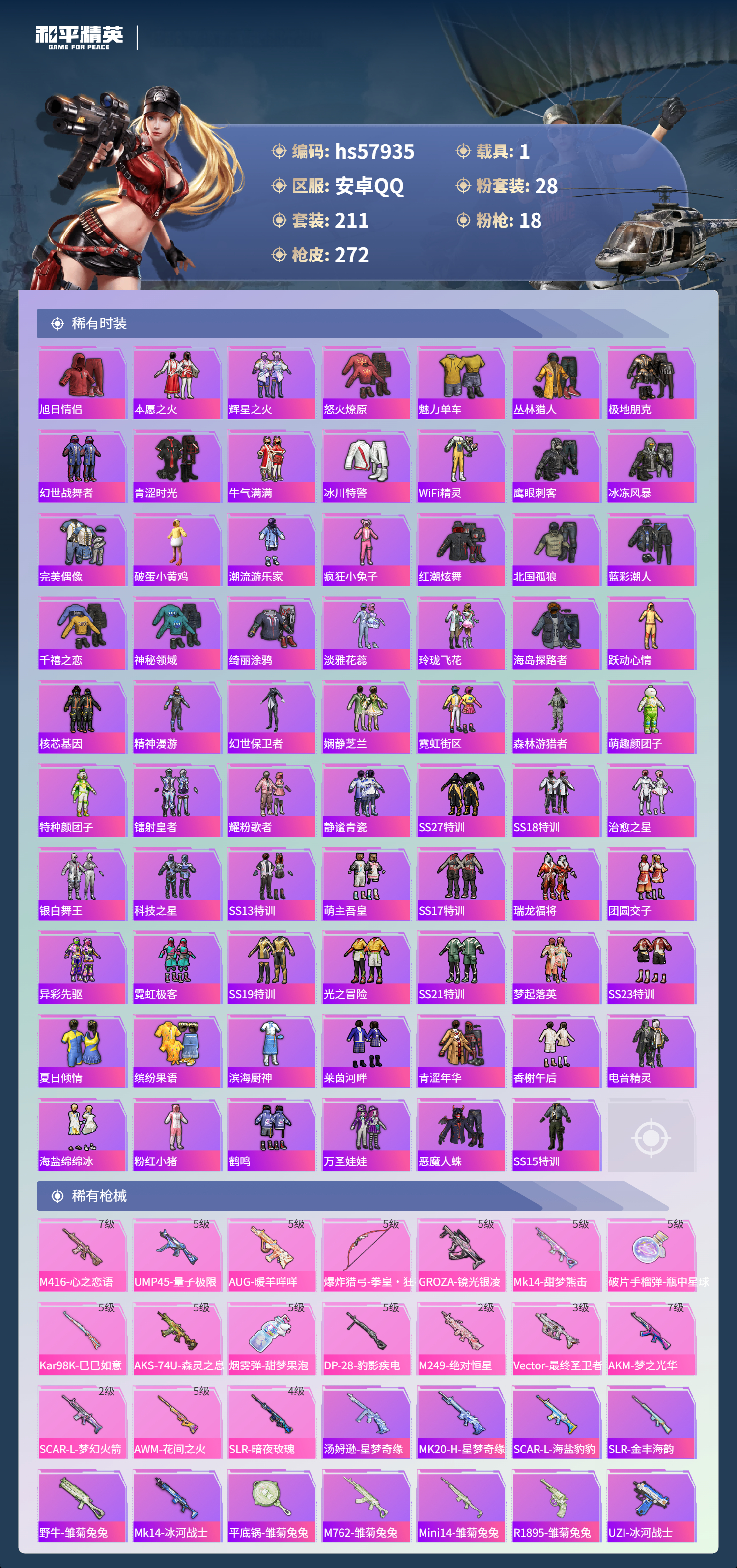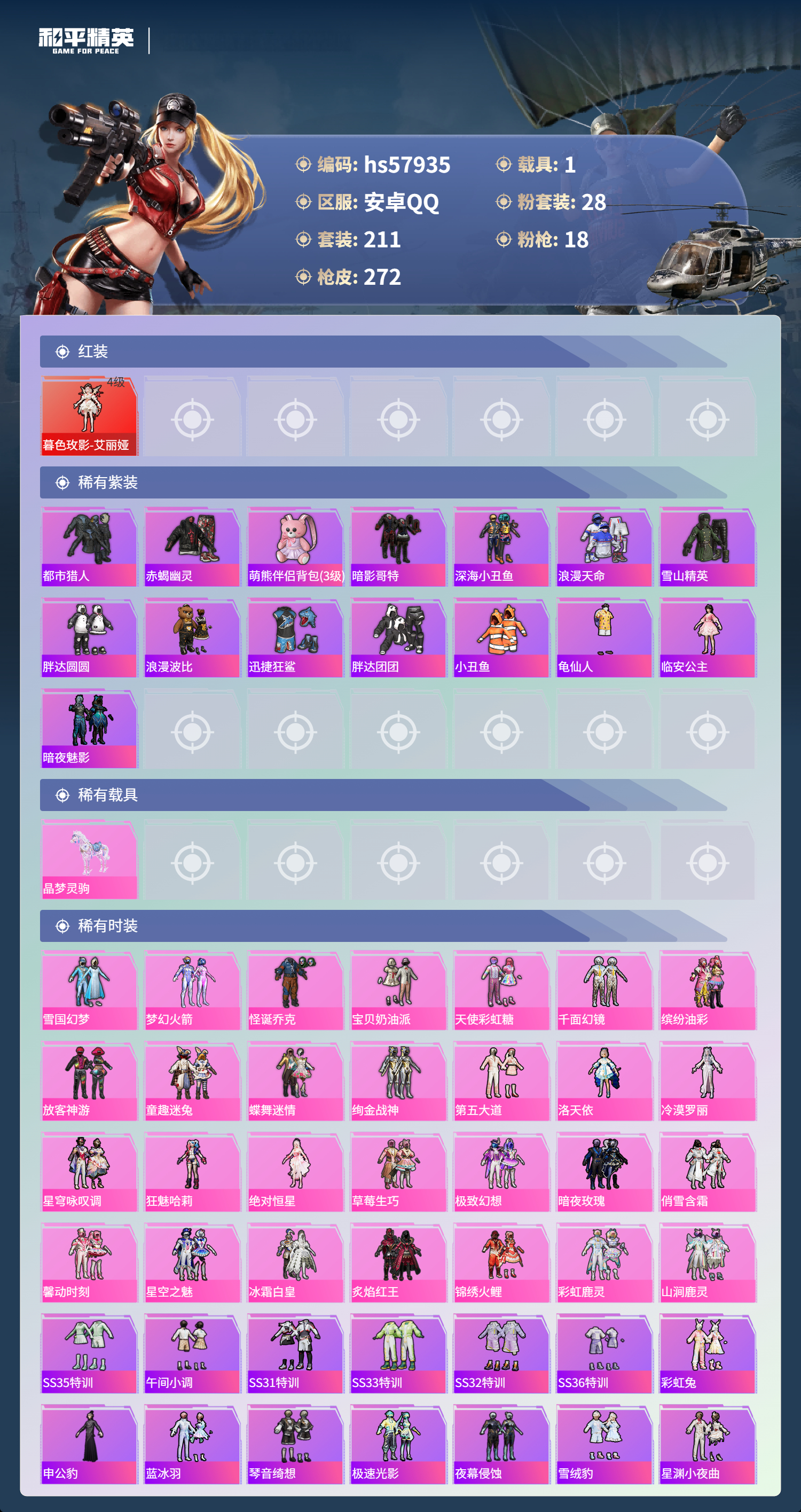 hs57935 安卓手q-15王牌印记-1红装-28粉装-18特效呛-1载具-热力值-211套装-272呛皮-4卓越印记-1传奇印记【1红装】暮色玫影-艾丽娅/4级【28粉装】套装-雪国幻梦套装-极致幻想套装-童趣迷兔套装-蝶舞迷情套装-山涧鹿灵角色-绝对恒星套装-彩虹鹿灵套装-暗夜玫瑰套装-冰霜白皇套装-缤纷油彩套装-怪诞乔克套装-宝贝奶油派角色-冷漠罗