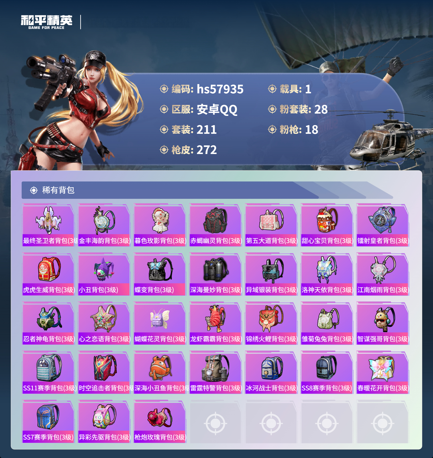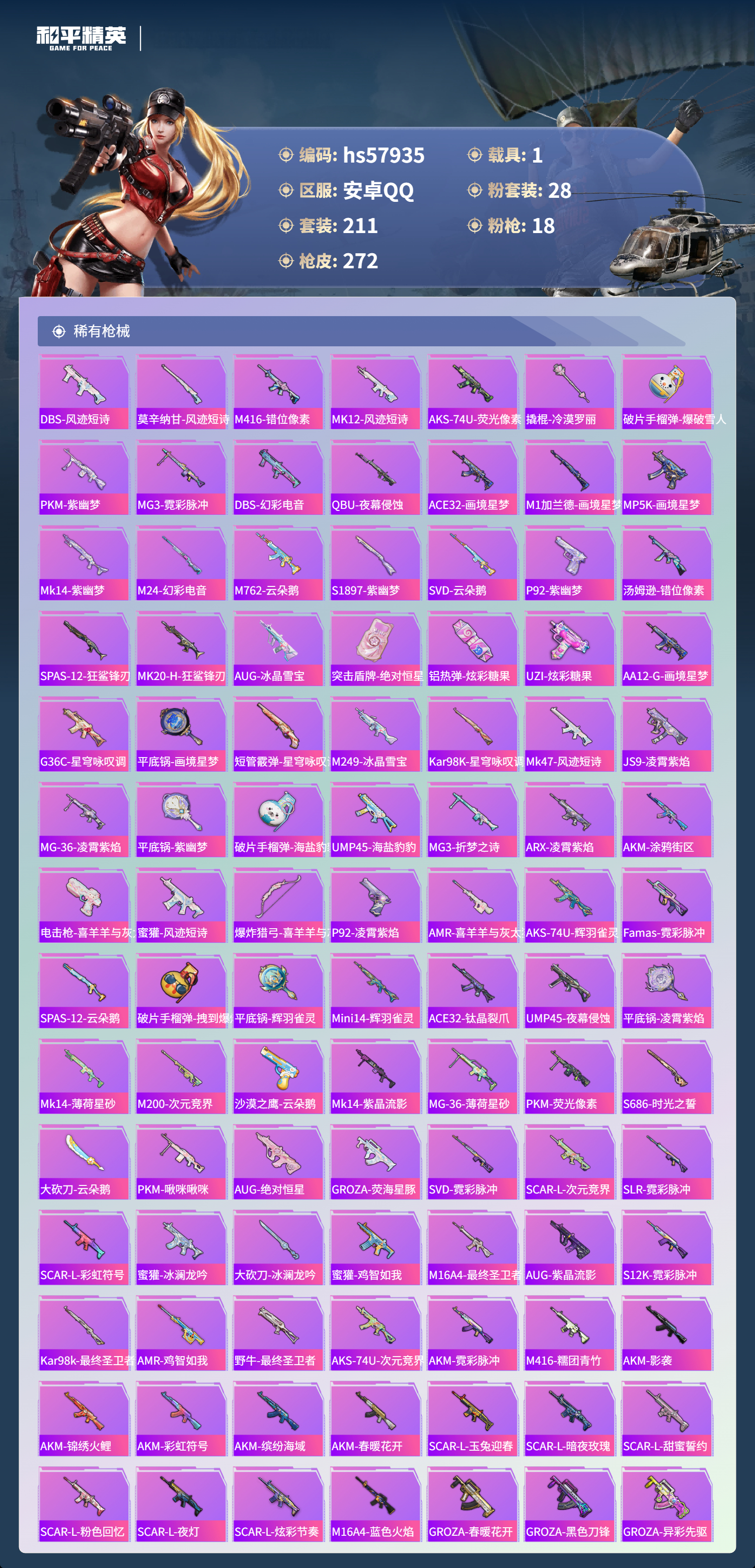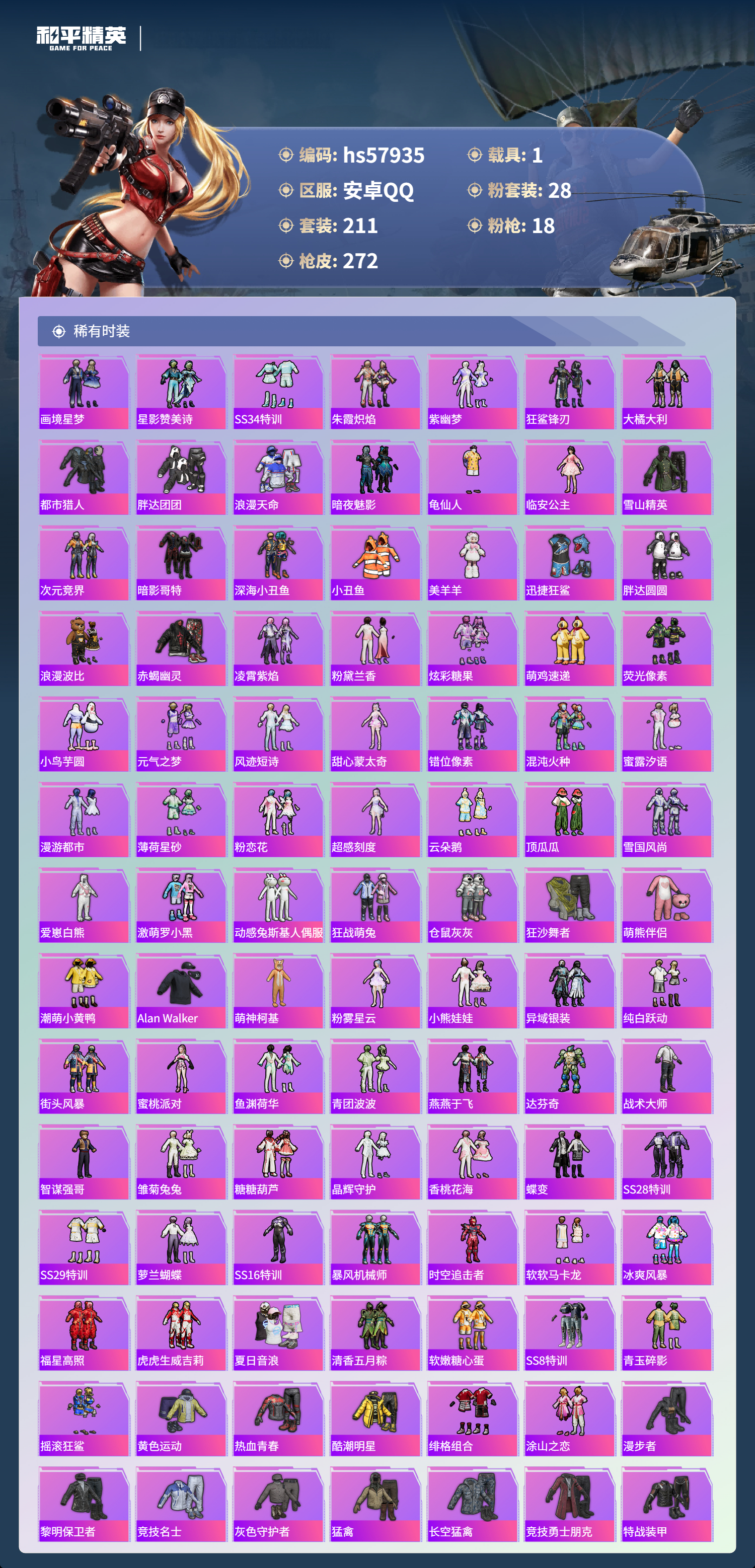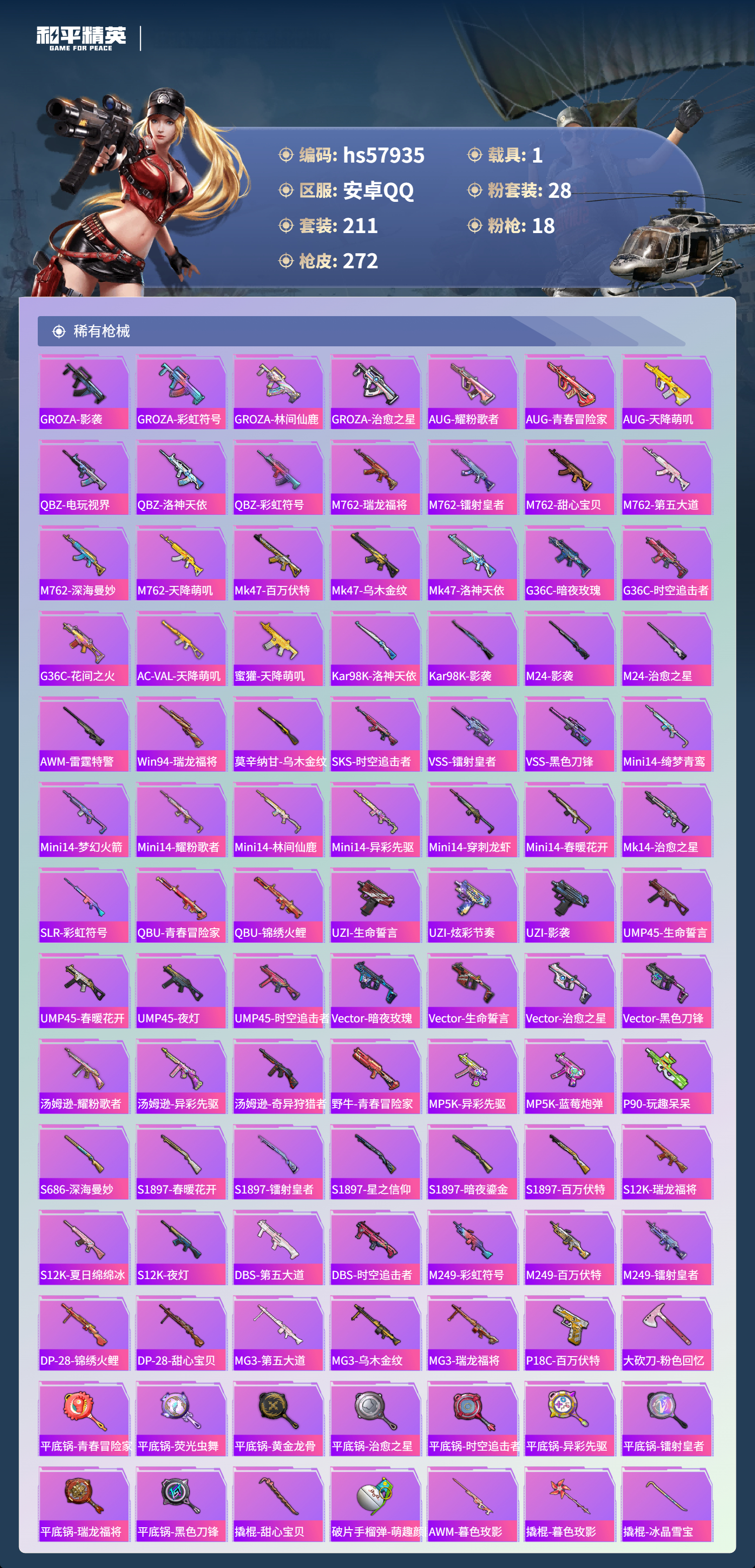 hs57935 安卓手q-15王牌印记-1红装-28粉装-18特效呛-1载具-热力值-211套装-272呛皮-4卓越印记-1传奇印记【1红装】暮色玫影-艾丽娅/4级【28粉装】套装-雪国幻梦套装-极致幻想套装-童趣迷兔套装-蝶舞迷情套装-山涧鹿灵角色-绝对恒星套装-彩虹鹿灵套装-暗夜玫瑰套装-冰霜白皇套装-缤纷油彩套装-怪诞乔克套装-宝贝奶油派角色-冷漠罗