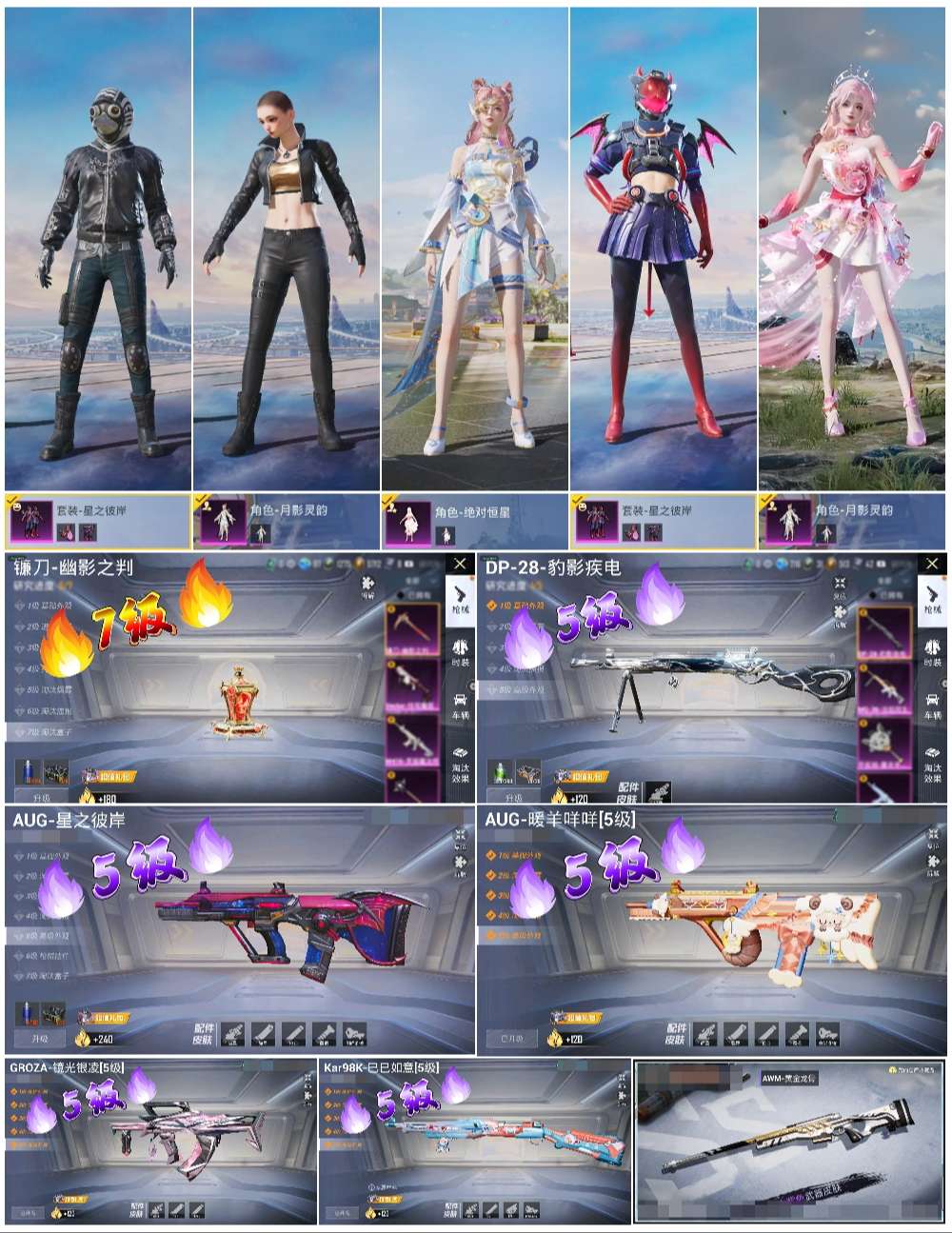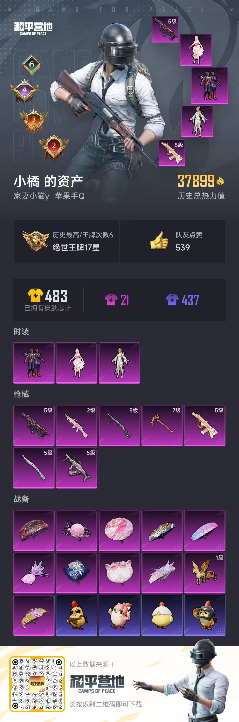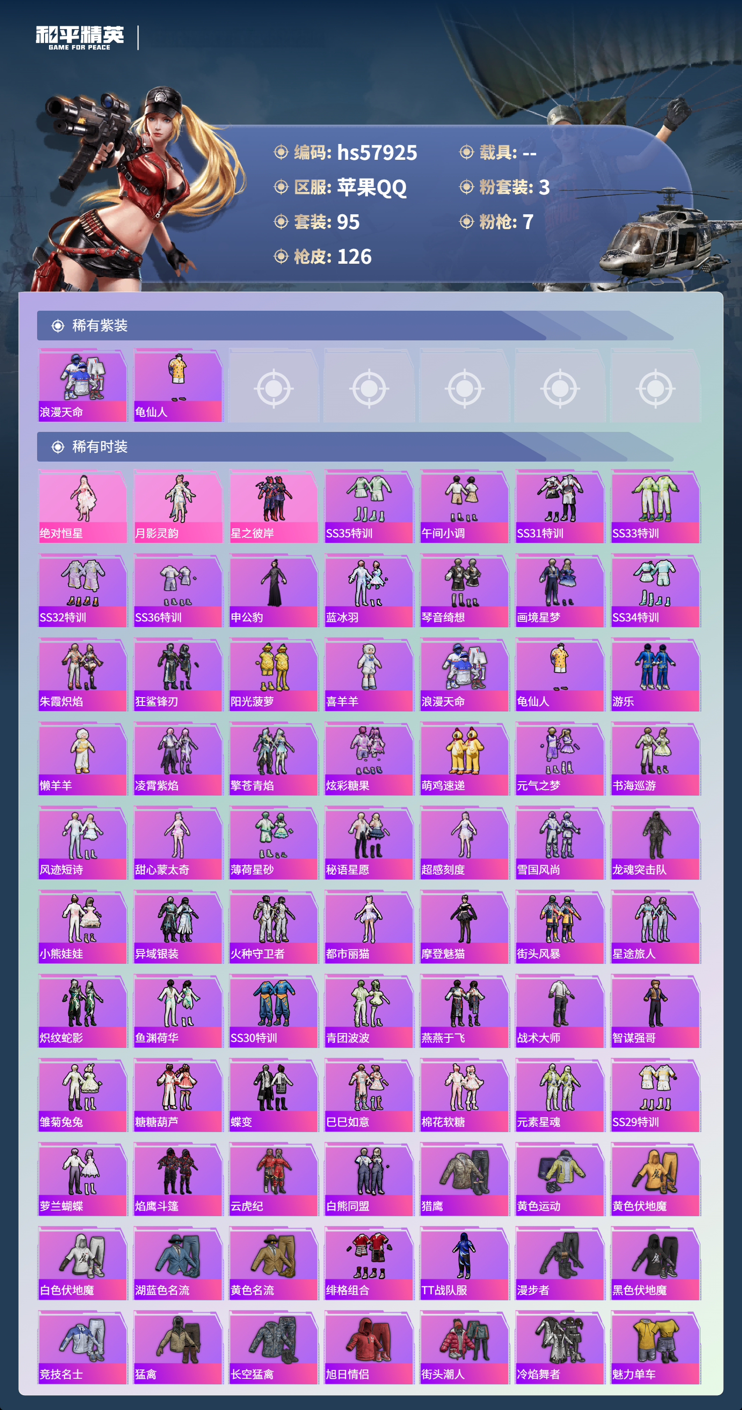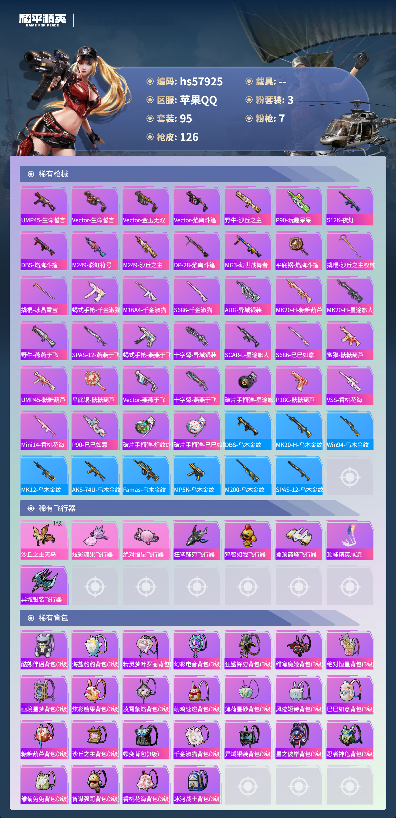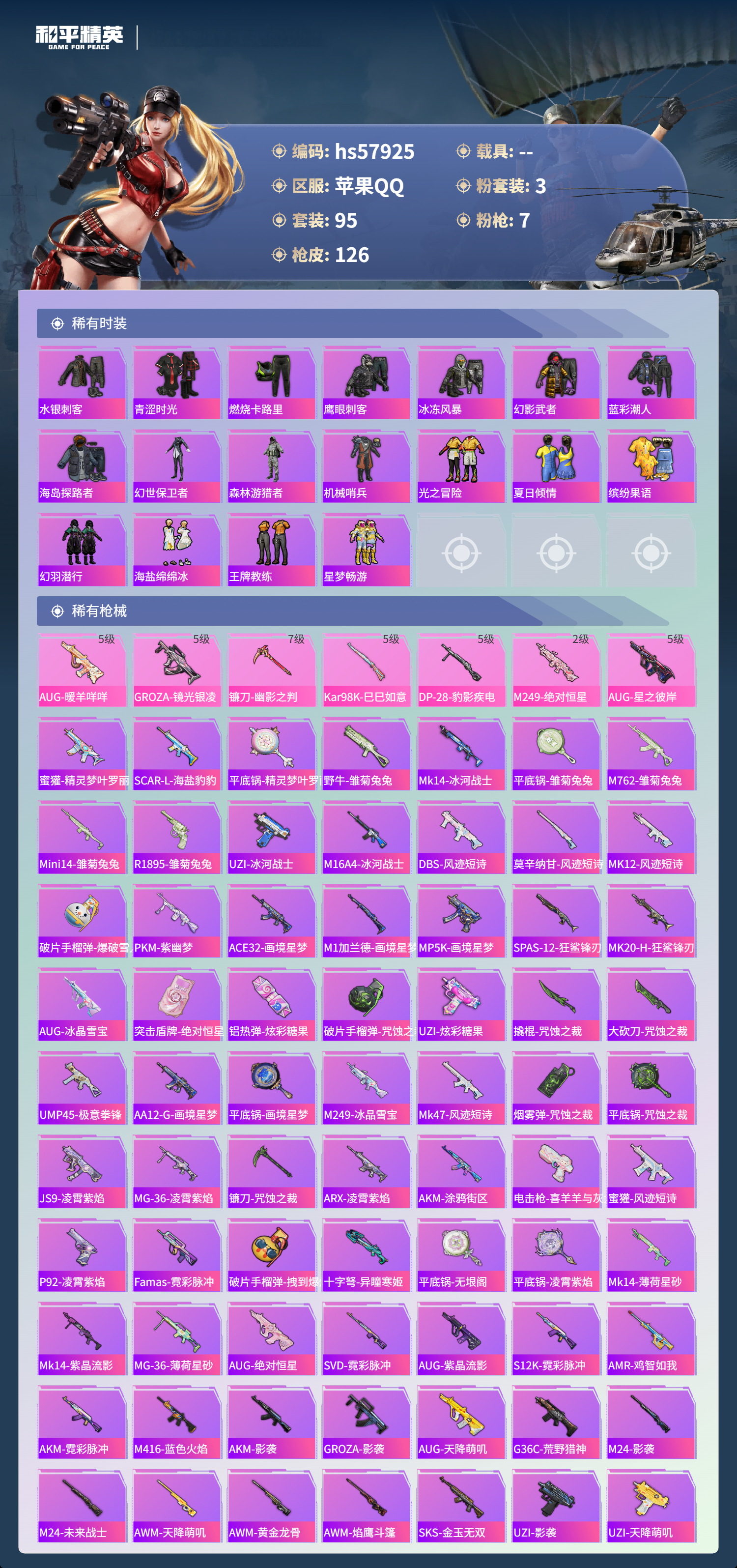 hs57925 苹果手q-6王牌印记-3粉装-7特效呛-37923热力值-95套装-126呛皮-4卓越印记-3传奇印记【3粉装】角色-月影灵韵套装-星之彼岸角色-绝对恒星【7特效呛】aug-星之彼岸/5级kar98k-巳巳如意/5级镰刀-幽影之判/7级m249-绝对恒星/2级dp-28-豹影疾电/5级groza-镜光银凌/5级aug-暖羊咩咩/5级【2稀有紫装】浪漫天命龟