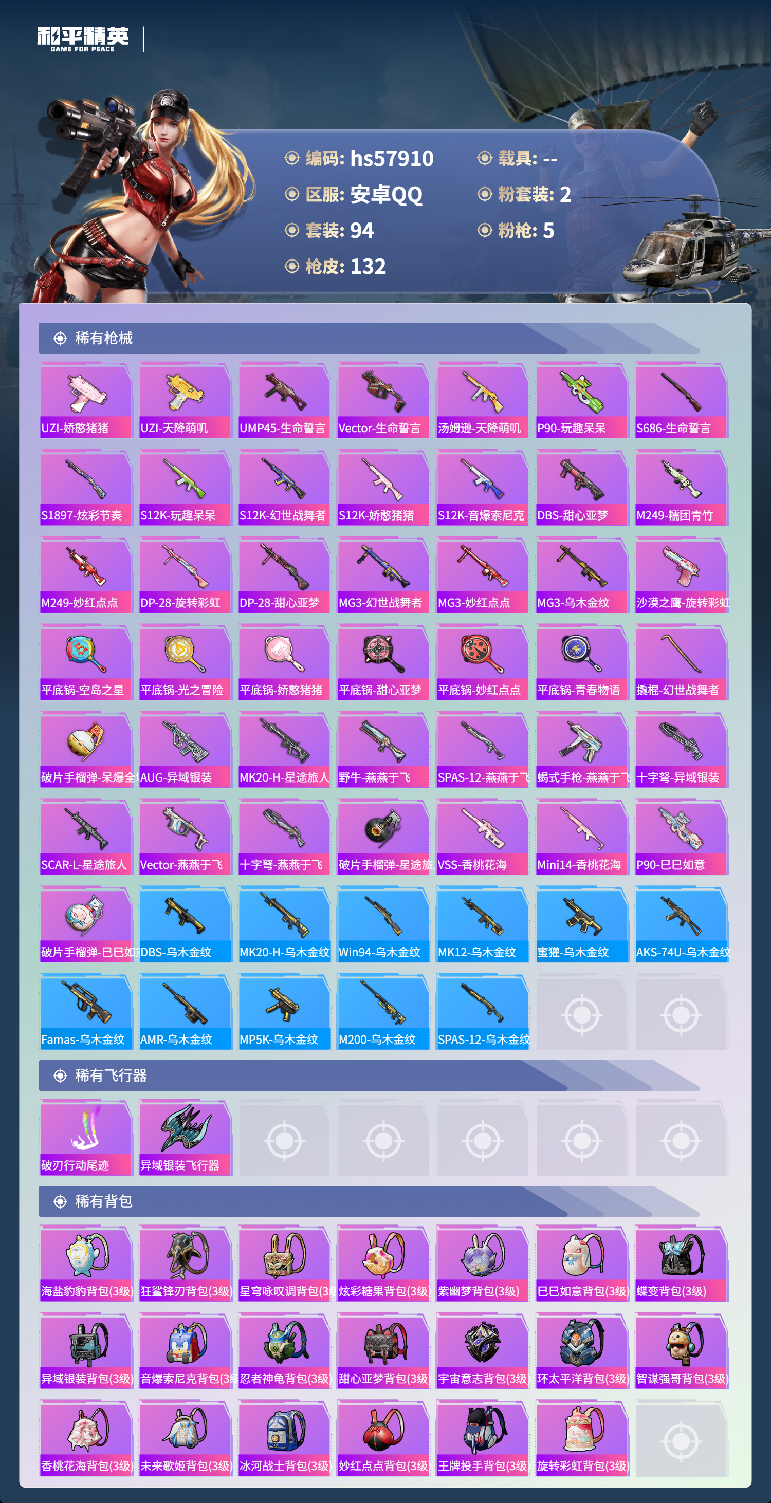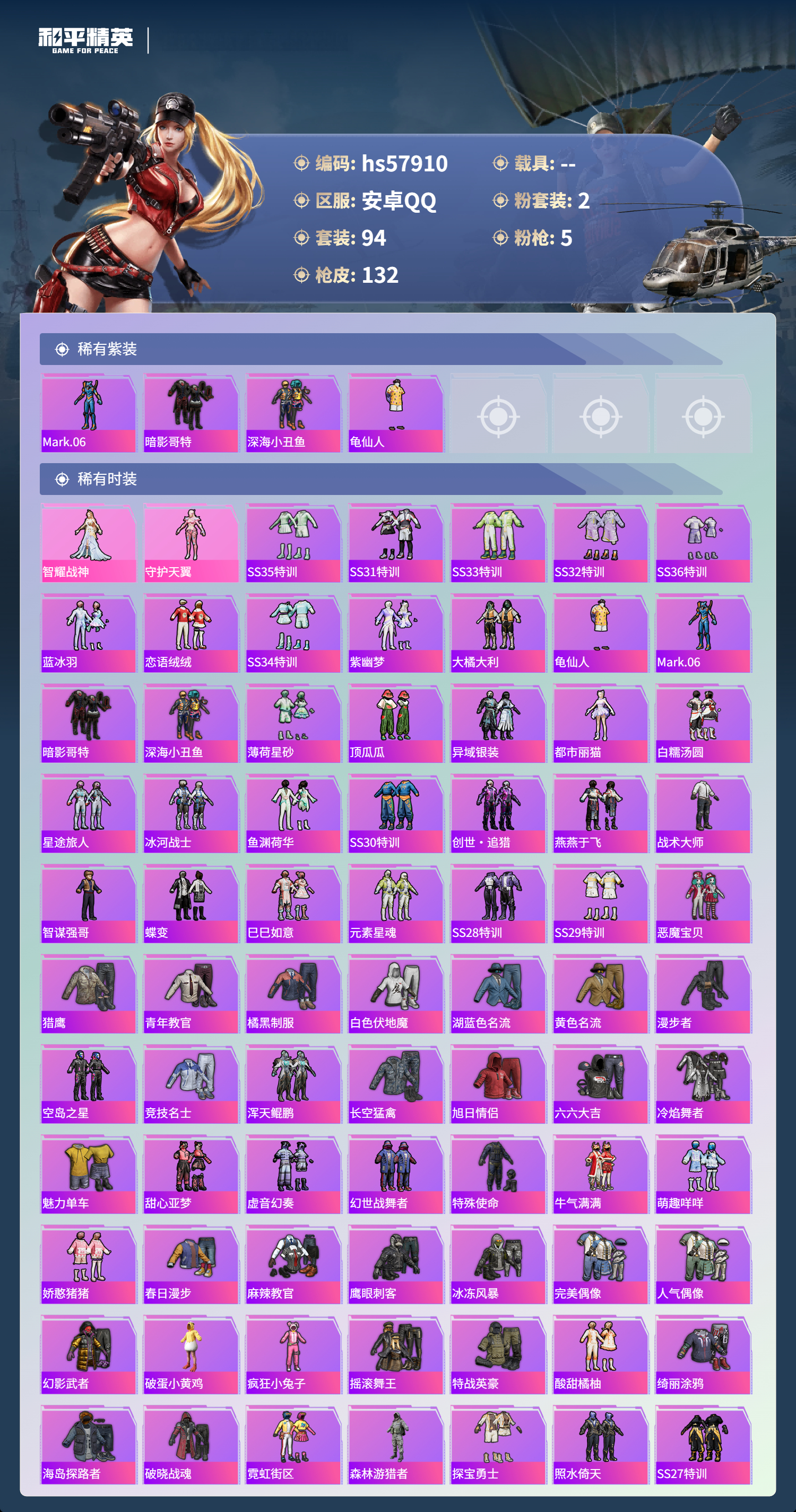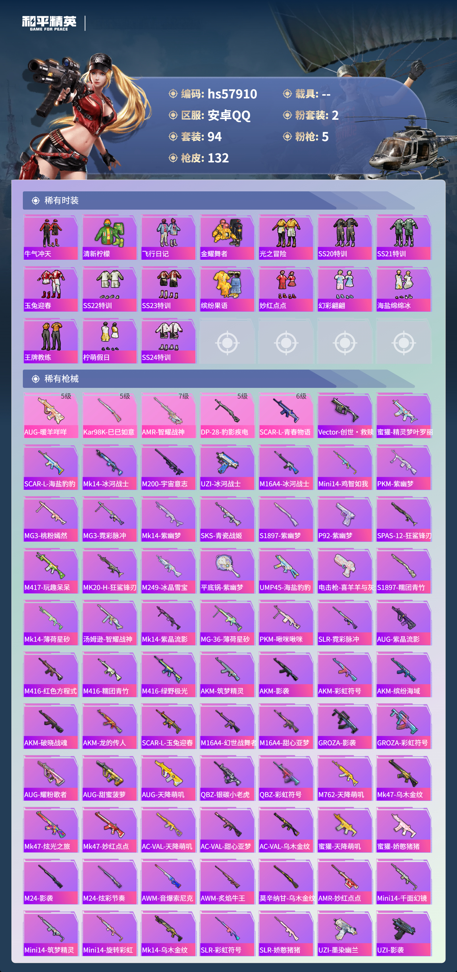 hs57910 安卓手q-7王牌印记-2粉装-5特效呛-37791热力值-94套装-132呛皮【2粉装】角色-守护天翼角色-智耀战神【5特效呛】scar-l-青春物语/6级amr-智耀战神/7级kar98k-巳巳如意/5级dp-28-豹影疾电/5级aug-暖羊咩咩/5级【4稀有紫装】mark.06暗影哥特深海小丑鱼龟仙人【94稀有时装】智耀战神ss35特训ss31特训