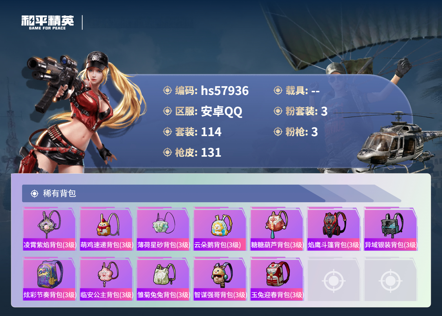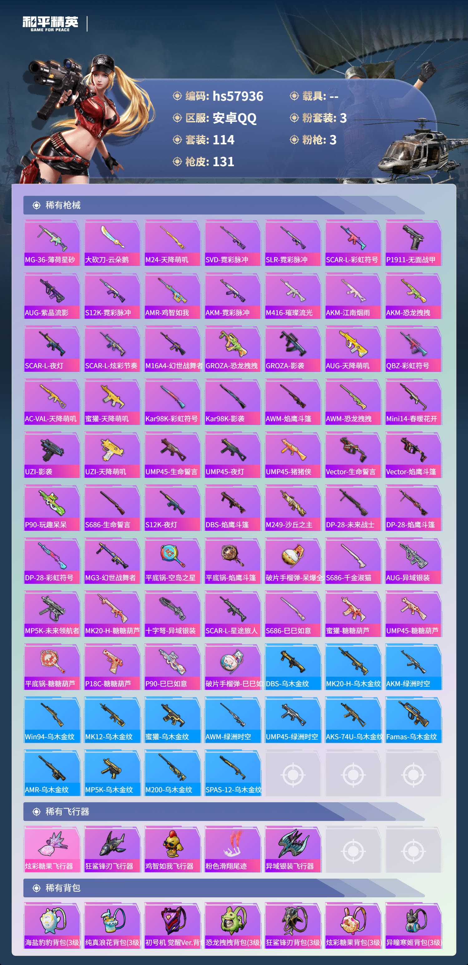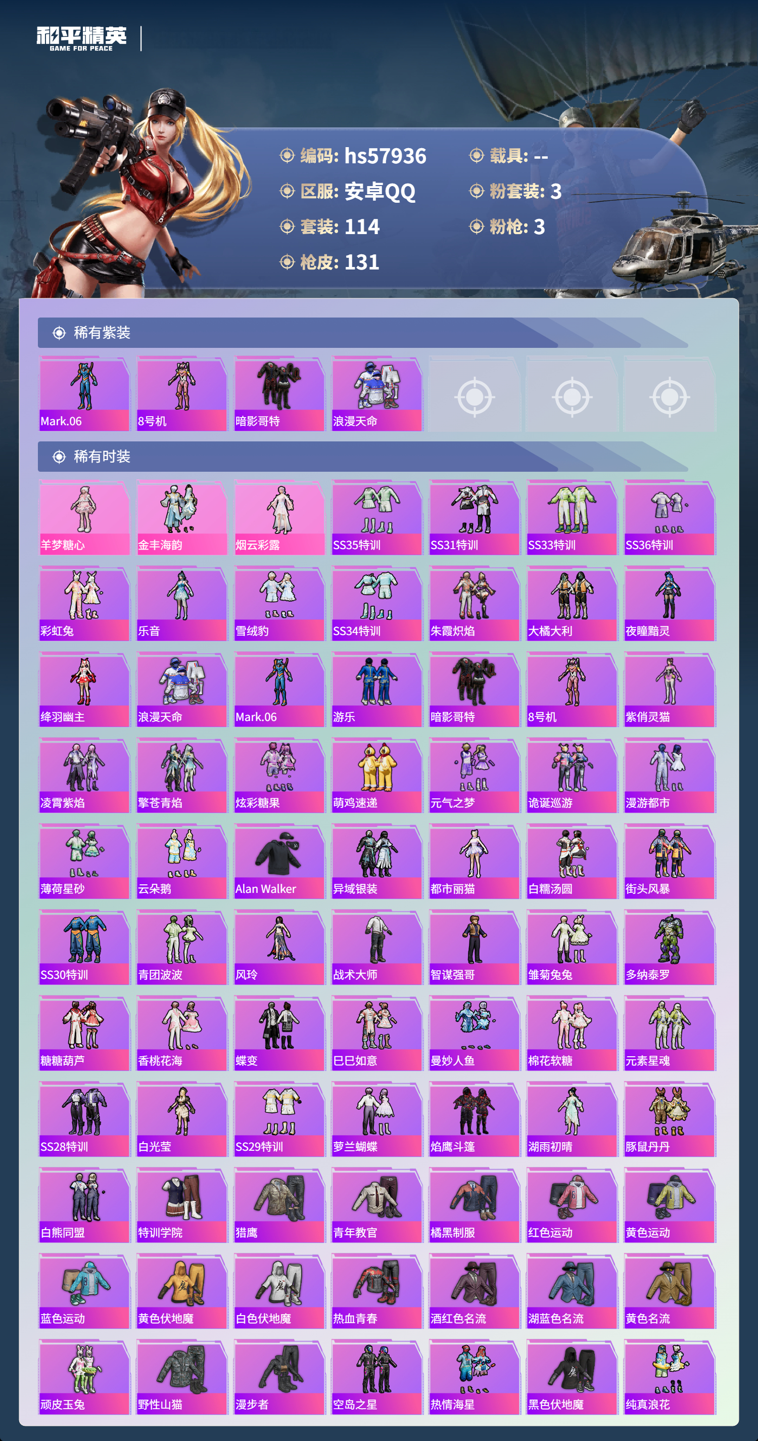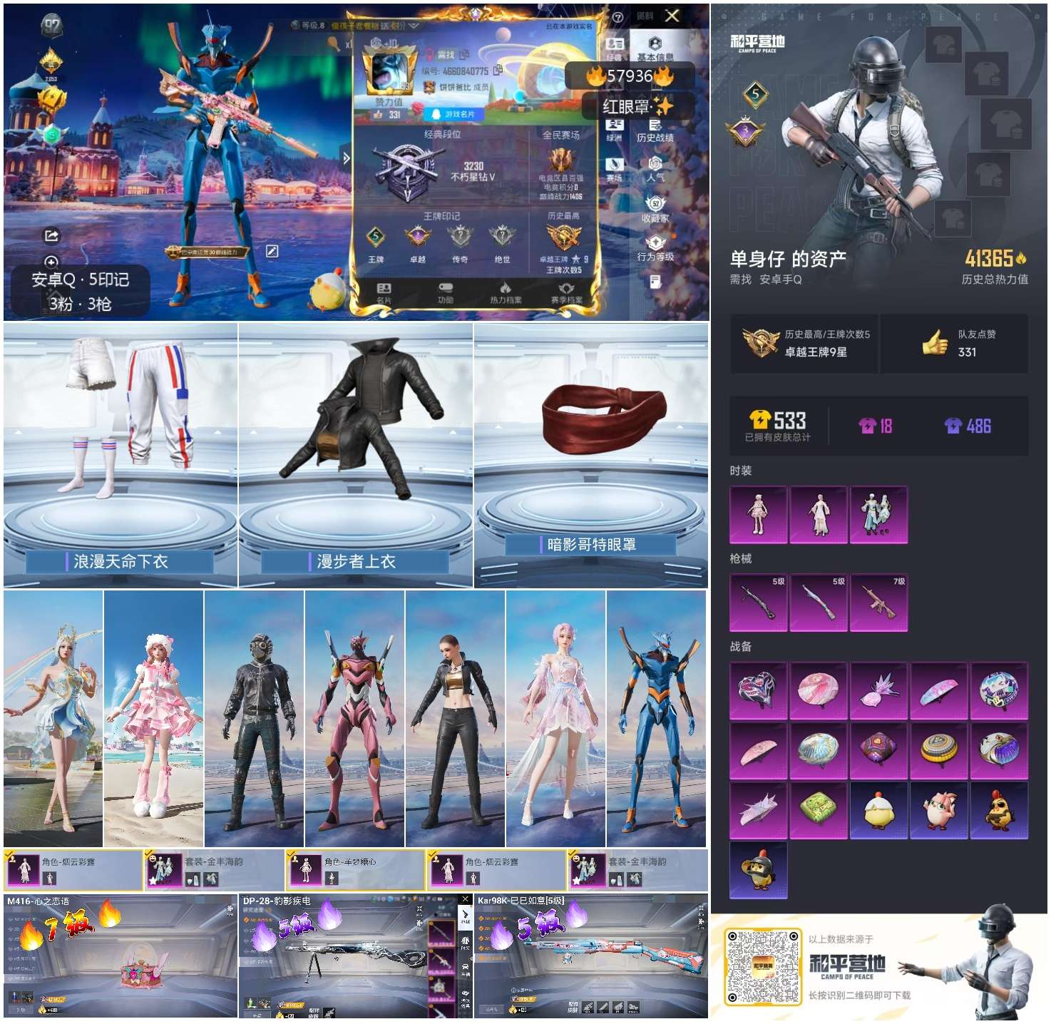 hs57936 安卓手q-5王牌印记-3粉装-3特效呛-41365热力值-114套装-131呛皮-3卓越印记【3粉装】角色-羊梦糖心角色-烟云彩露套装-金丰海韵【3特效呛】dp-28-豹影疾电/5级m416-心之恋语/7级kar98k-巳巳如意/5级【4稀有紫装】mark.068号机暗影哥特浪漫天命【114稀有时装】羊梦糖心ss35特训ss31特训ss33特训ss3