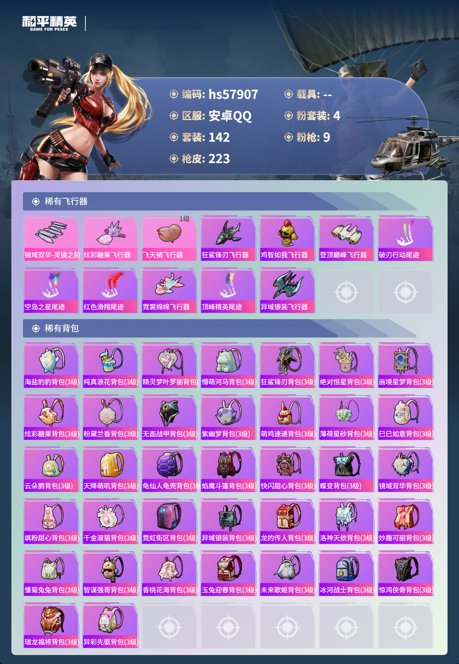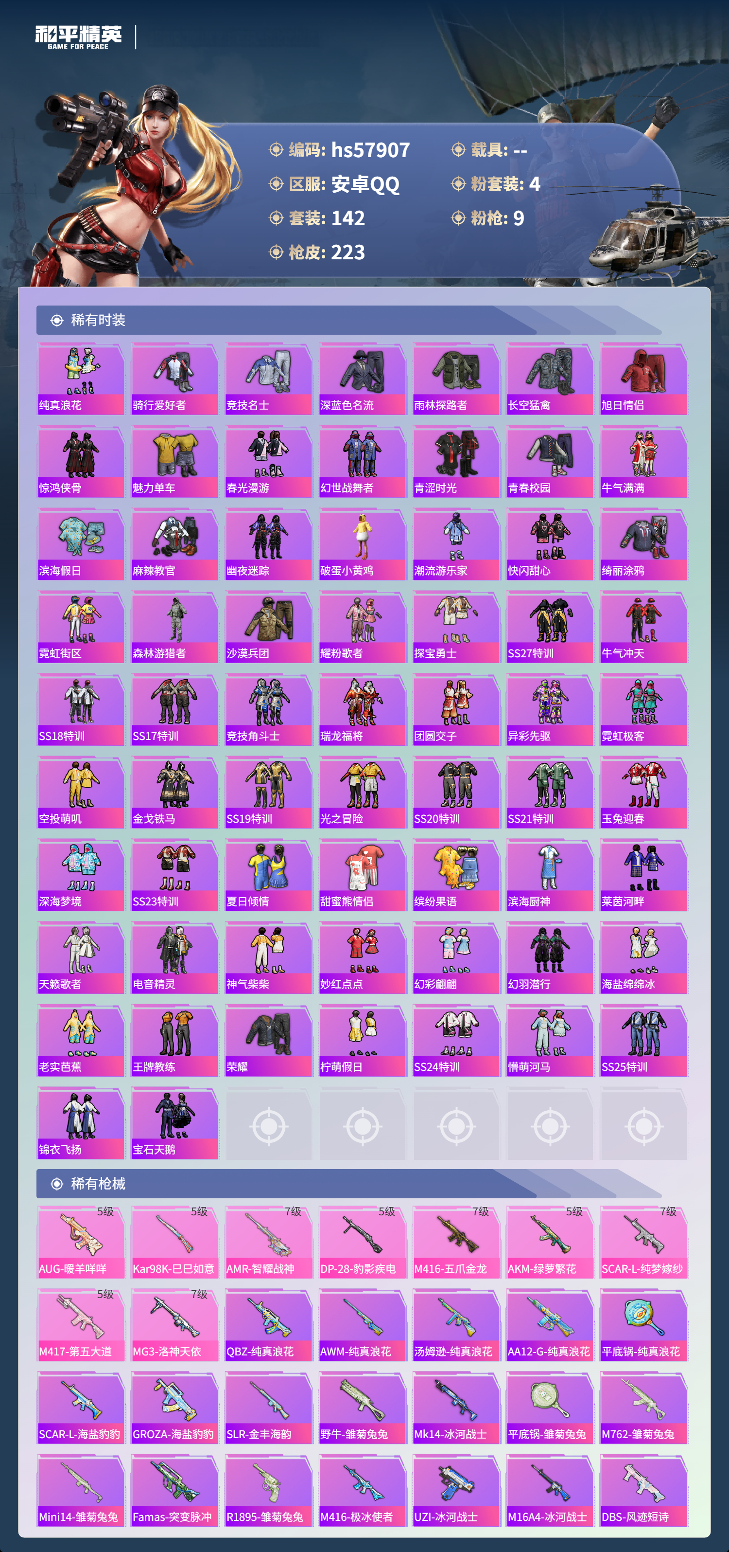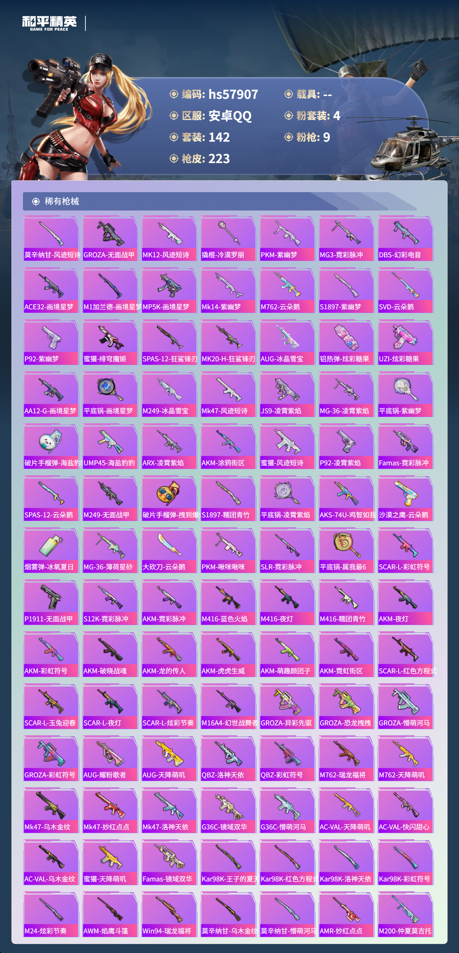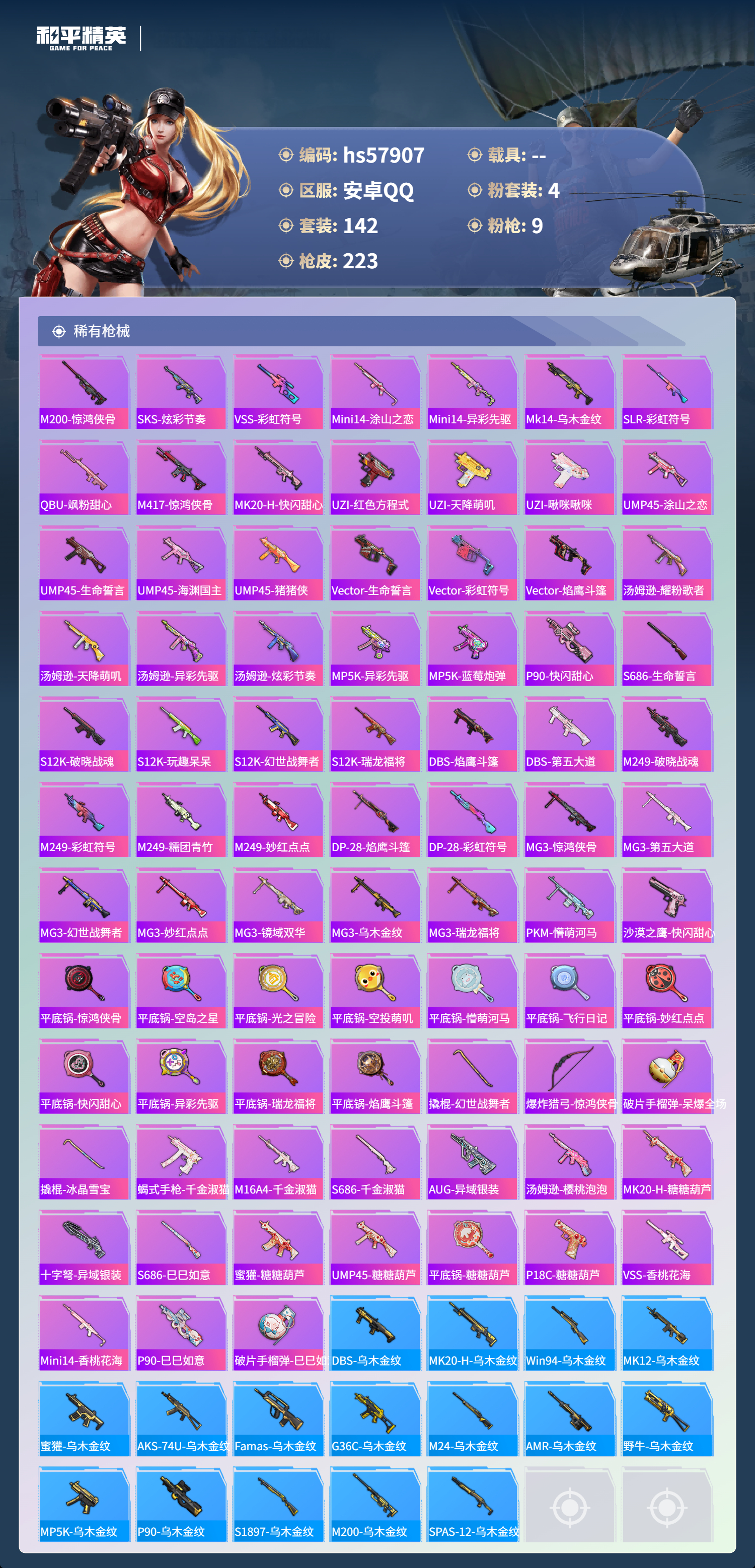 hs57907 安卓手q-15王牌印记-有战神框-4粉装-9特效呛-69466热力值-142套装-223呛皮-3卓越印记-3传奇印记【4粉装】玩偶服-猪猪侠套装-雪月幻音角色-圣堂之誓角色-洛天依【9特效呛】amr-智耀战神/7级mg3-洛神天依/7级m417-第五大道/5级scar-l-纯梦嫁纱/7级dp-28-豹影疾电/5级m416-五爪金龙/7级akm-绿萝繁花/5级