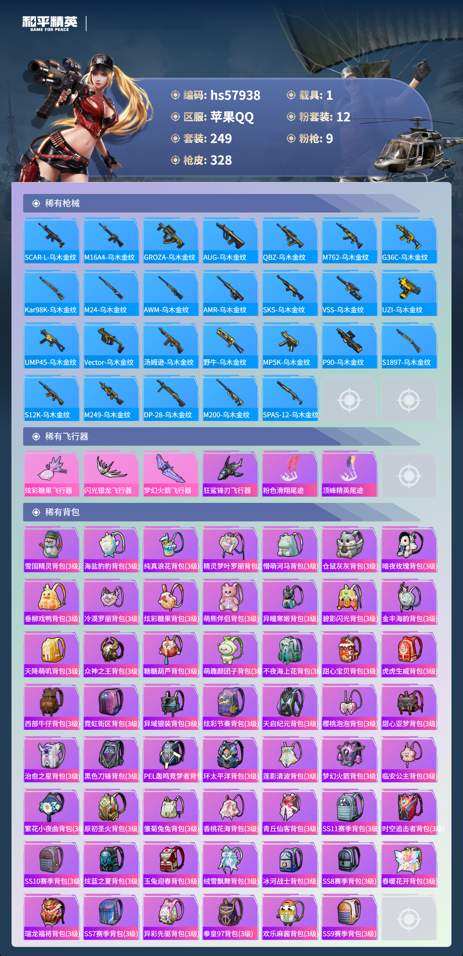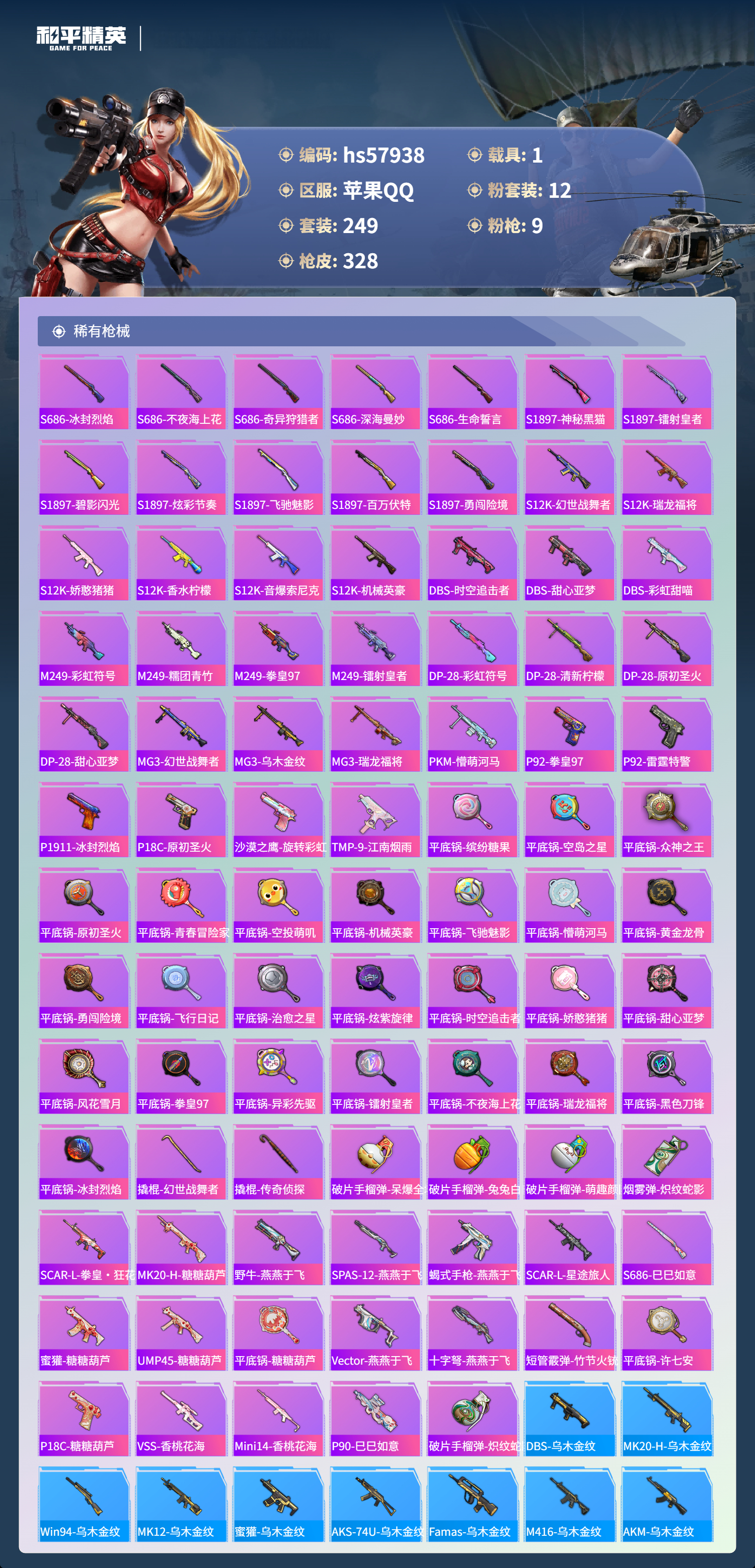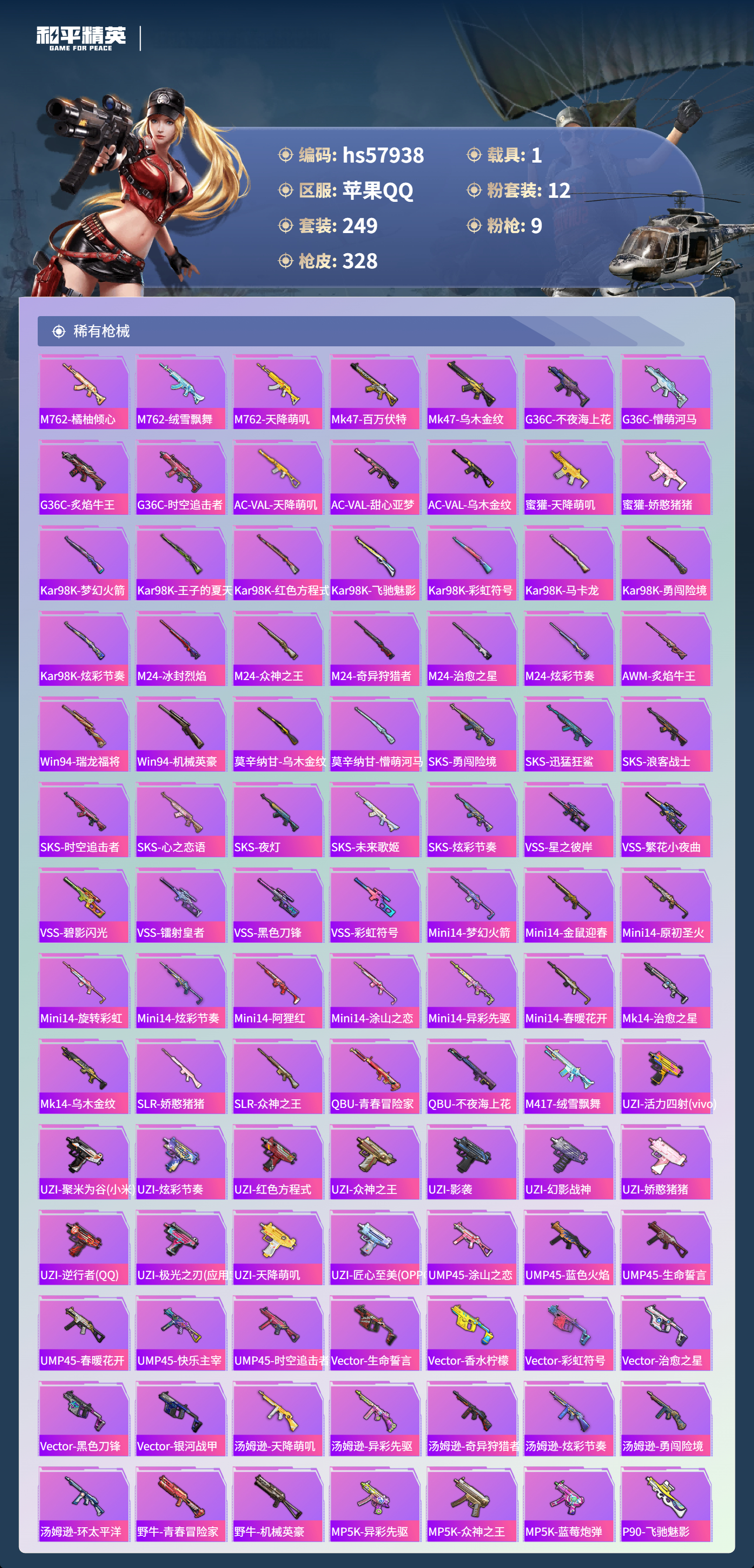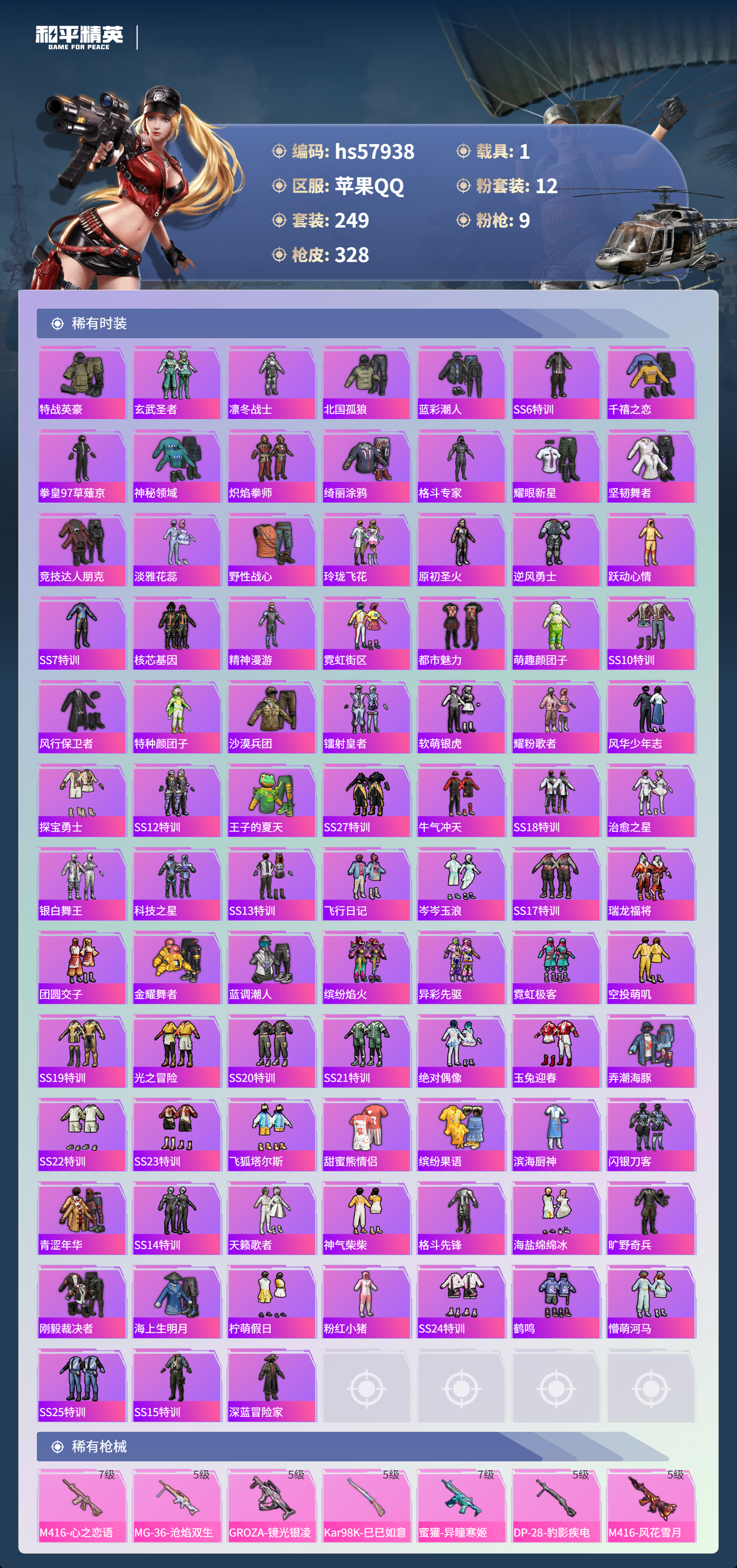 hs57938 苹果手q-22王牌印记-12粉装-9特效呛-1载具-热力值-249套装-328呛皮-1卓越印记【12粉装】套装-暗夜玫瑰角色-千金淑猫套装-霁雪冰心套装-缤纷油彩套装-彩虹鹿灵套装-傲雪凌霜套装-幻彩马卡龙套装-雪国幻梦套装-荒漠赏金套装-梦幻火箭套装-粉色回忆套装-未来歌姬【9特效呛】kar98k-巳巳如意/5级m416-心之恋语/7级