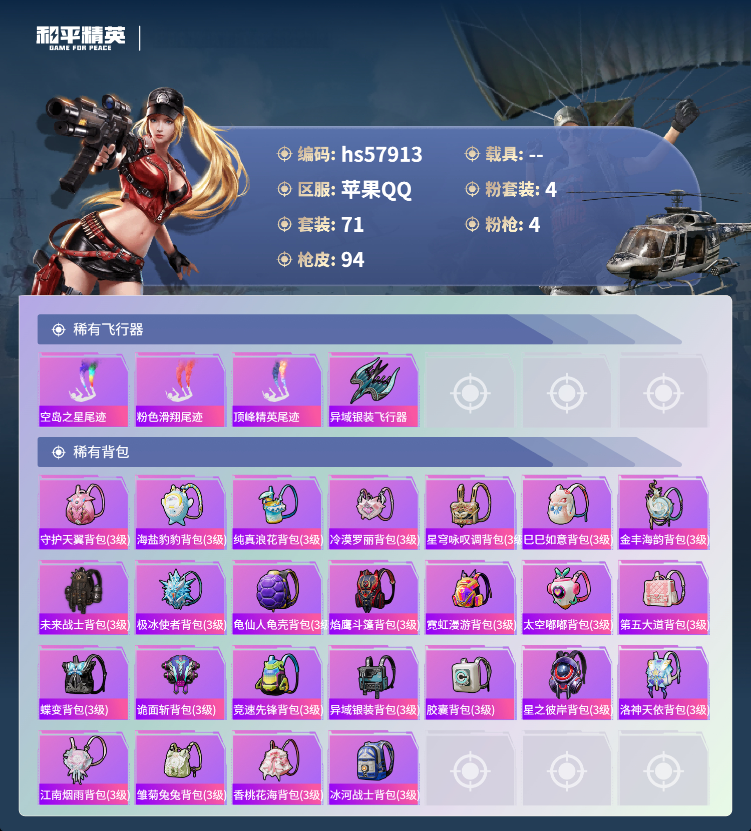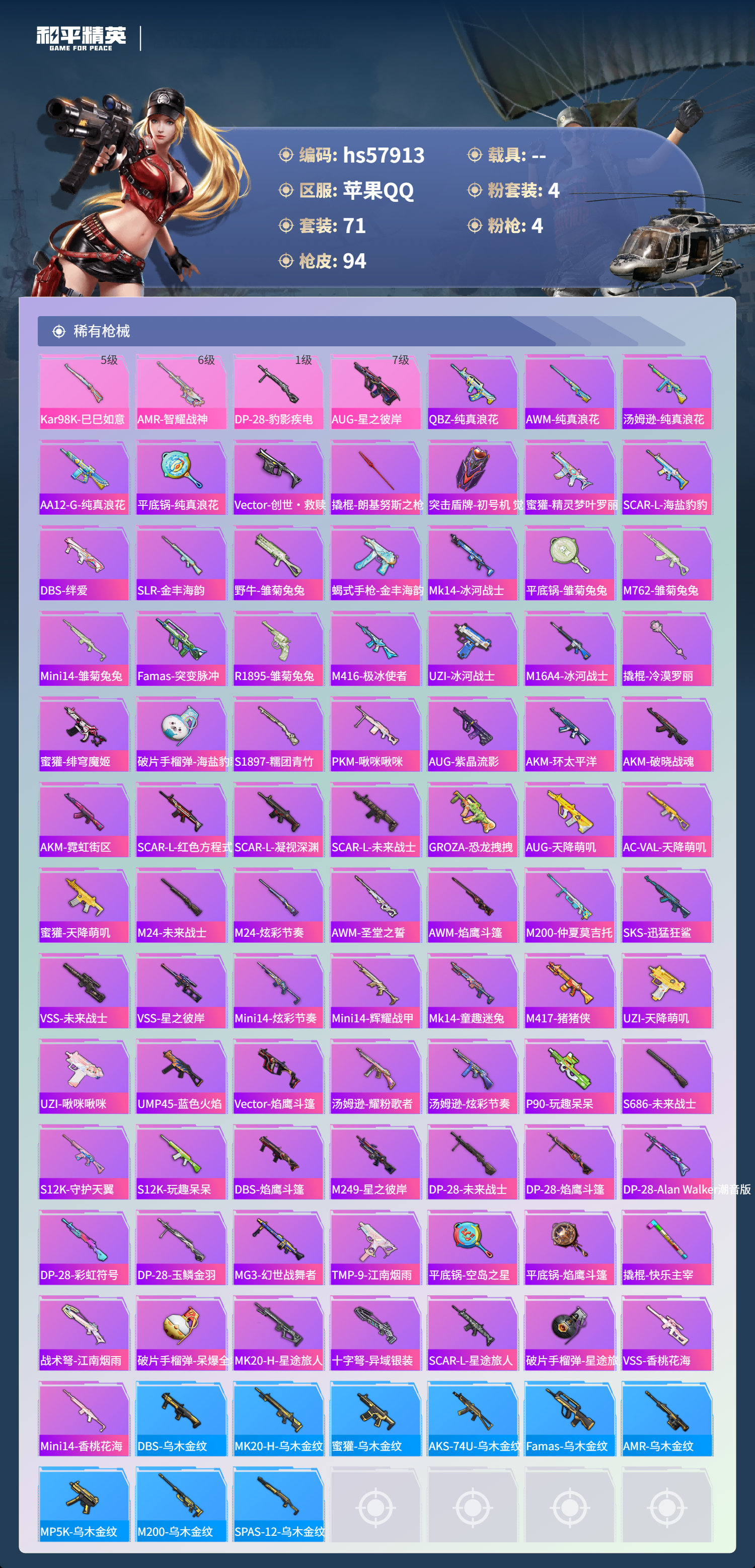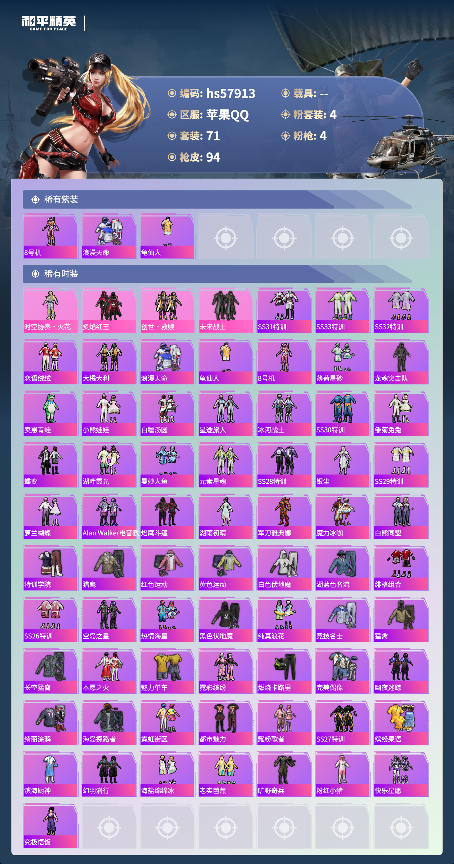 hs57913 苹果手q-4王牌印记-4粉装-4特效呛-29576热力值-71套装-94呛皮【4粉装】套装-创世·救赎套装-炙焰红王时空协奏·火花套装-未来战士【4特效呛】aug-星之彼岸/7级dp-28-豹影疾电/1级amr-智耀战神/6级kar98k-巳巳如意/5级【3稀有紫装】8号机浪漫天命龟仙人【71稀有时装】ss31特训ss33特训ss32特训恋语绒绒大