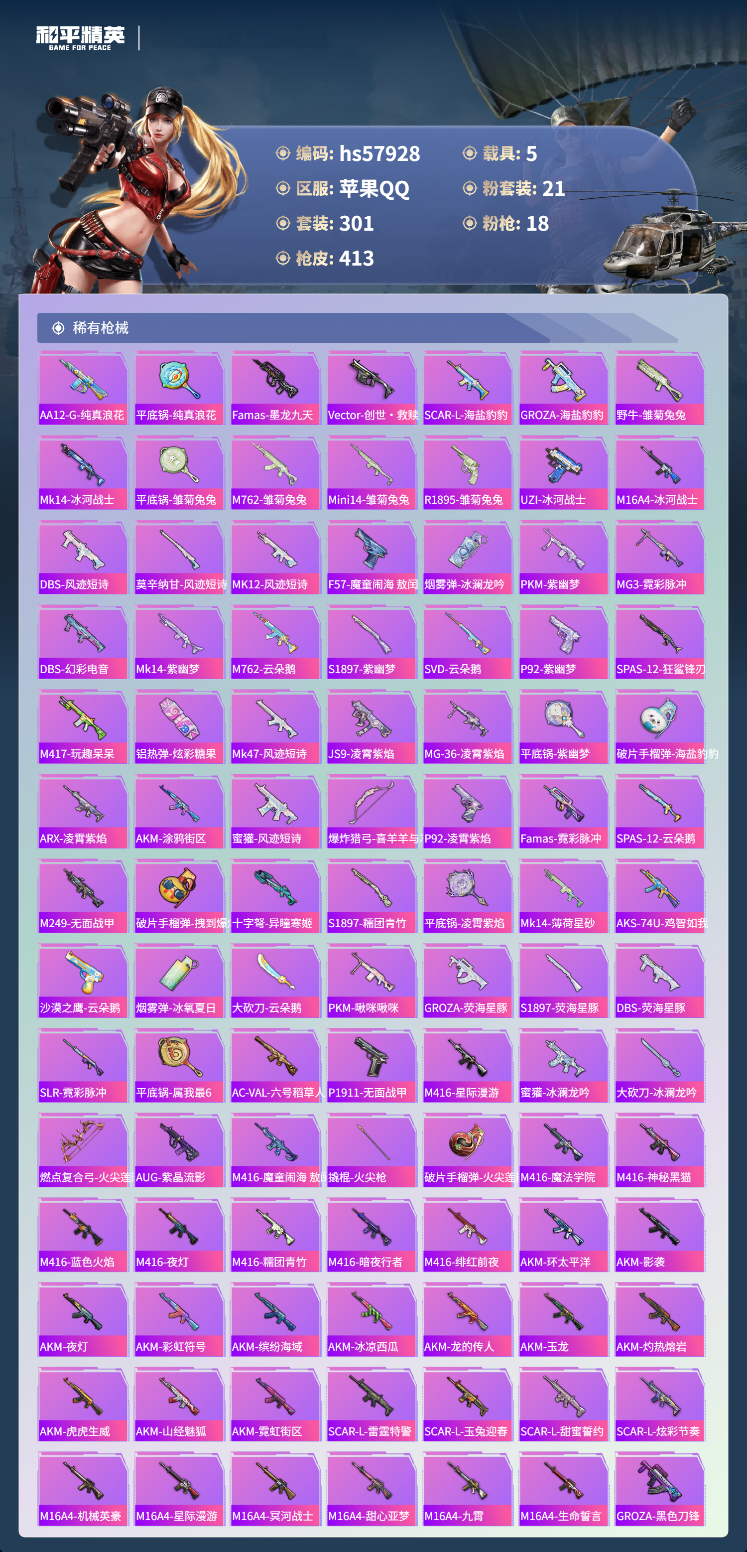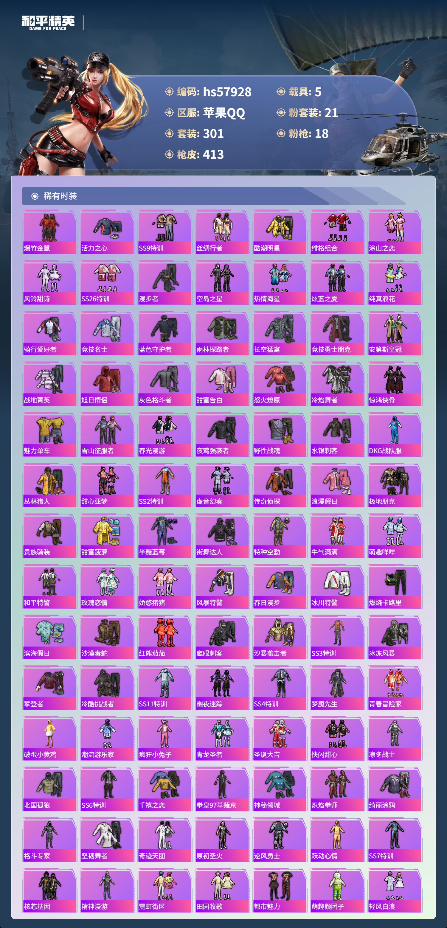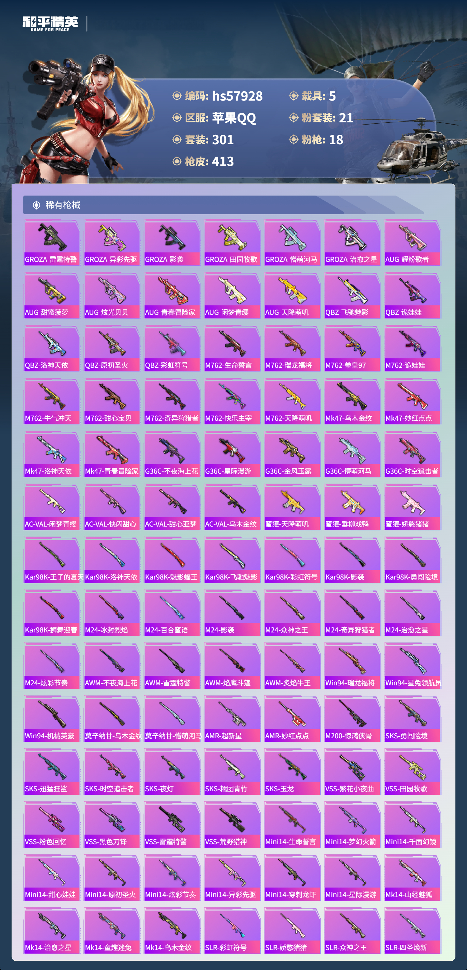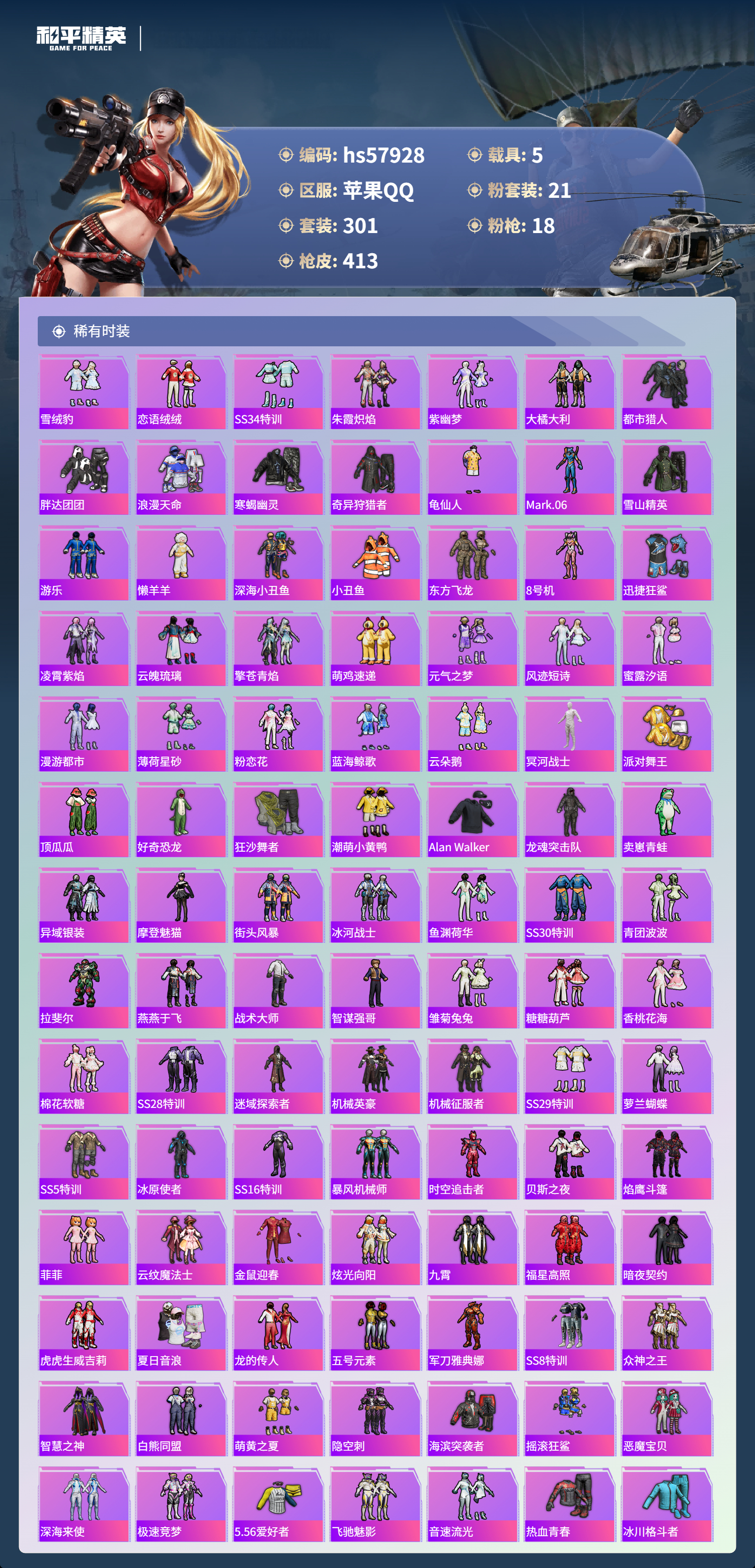 hs57928 苹果手q-28王牌印记-有战神框-1红装-21粉装-18特效呛-5载具-热力值-301套装-413呛皮-13卓越印记-13传奇印记【1红装】魔童闹海-哪吒/1级【21粉装】角色-洛天依套装-缤纷油彩套装-宝贝奶油派角色-白勺歌姬角色-星渊角色-异瞳寒姬套装-幻彩电音套装-第五大道套装-放客神游套装-怪诞乔克套装-蝶舞迷情套装-新星烈龙套装-