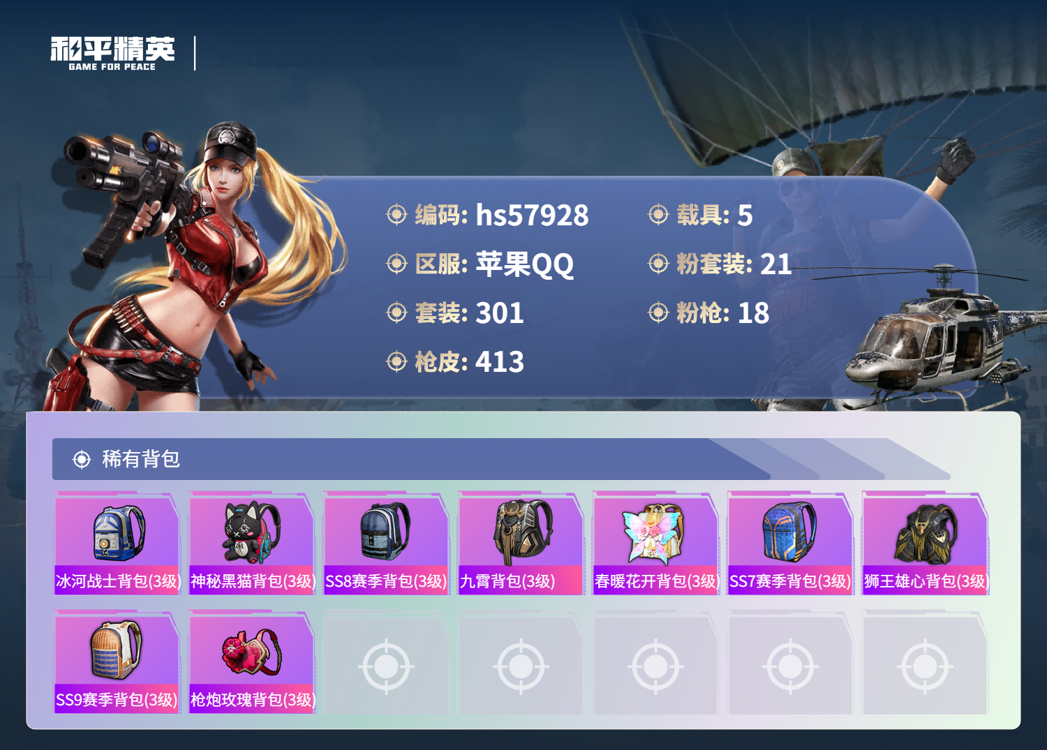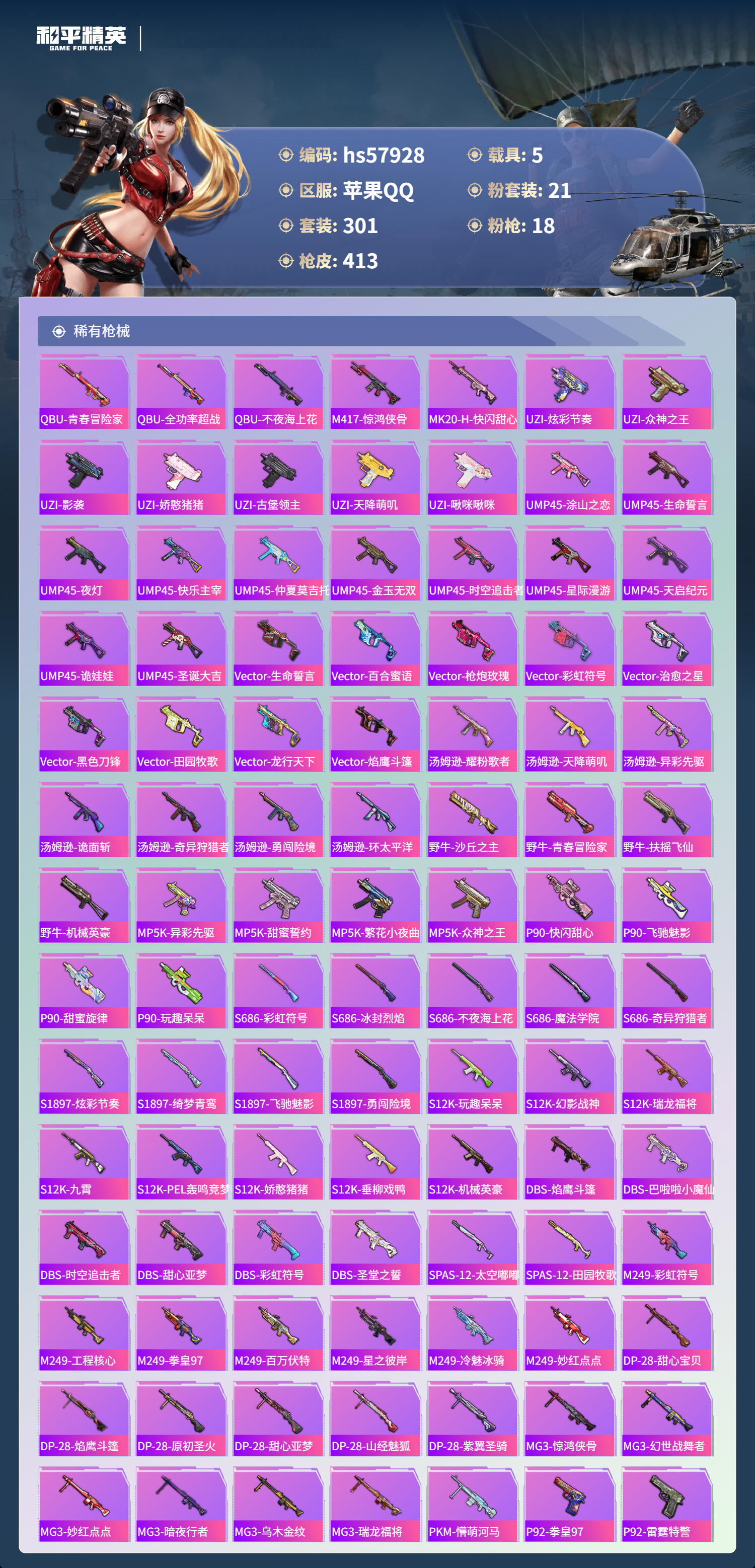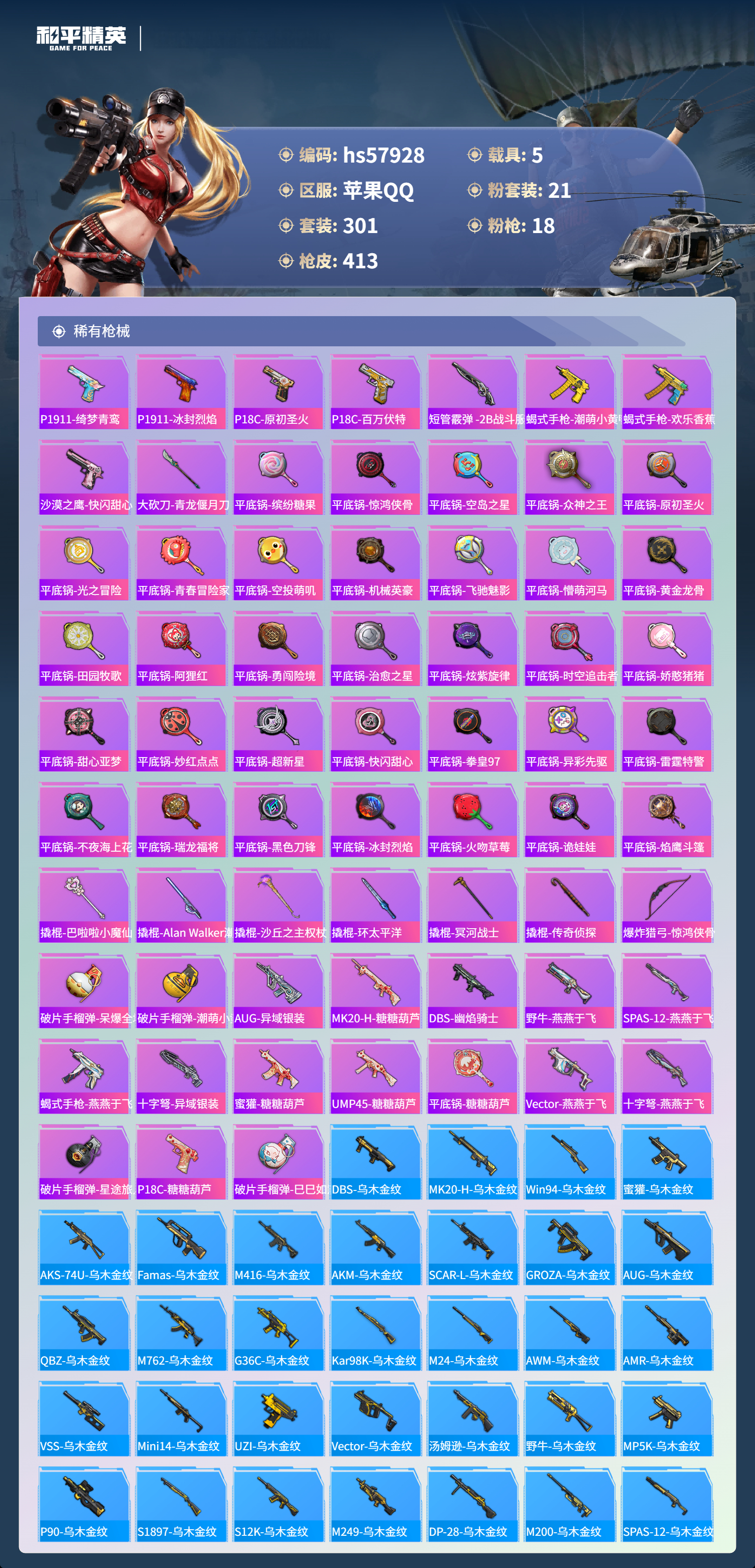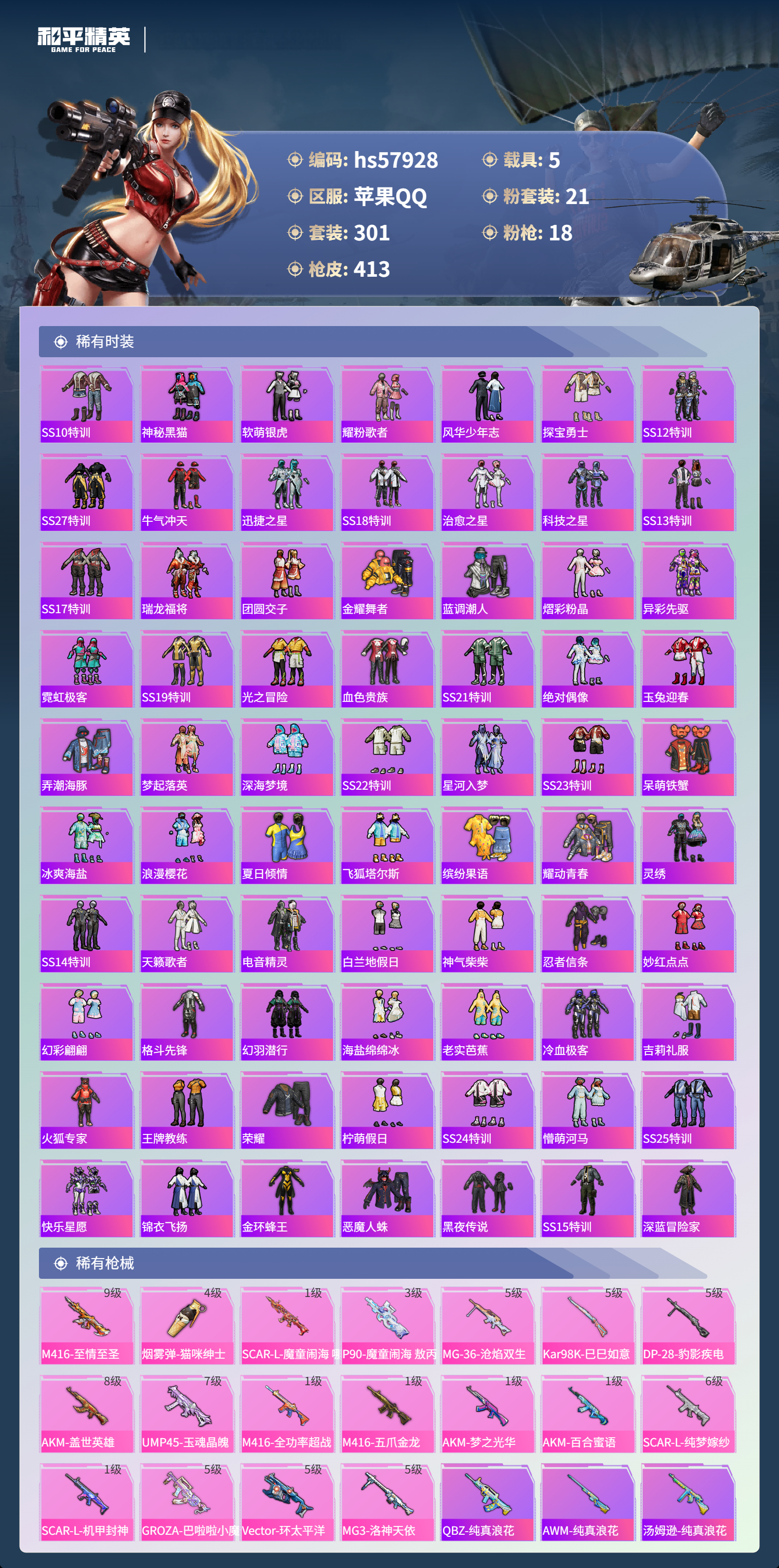 hs57928 苹果手q-28王牌印记-有战神框-1红装-21粉装-18特效呛-5载具-热力值-301套装-413呛皮-13卓越印记-13传奇印记【1红装】魔童闹海-哪吒/1级【21粉装】角色-洛天依套装-缤纷油彩套装-宝贝奶油派角色-白勺歌姬角色-星渊角色-异瞳寒姬套装-幻彩电音套装-第五大道套装-放客神游套装-怪诞乔克套装-蝶舞迷情套装-新星烈龙套装-