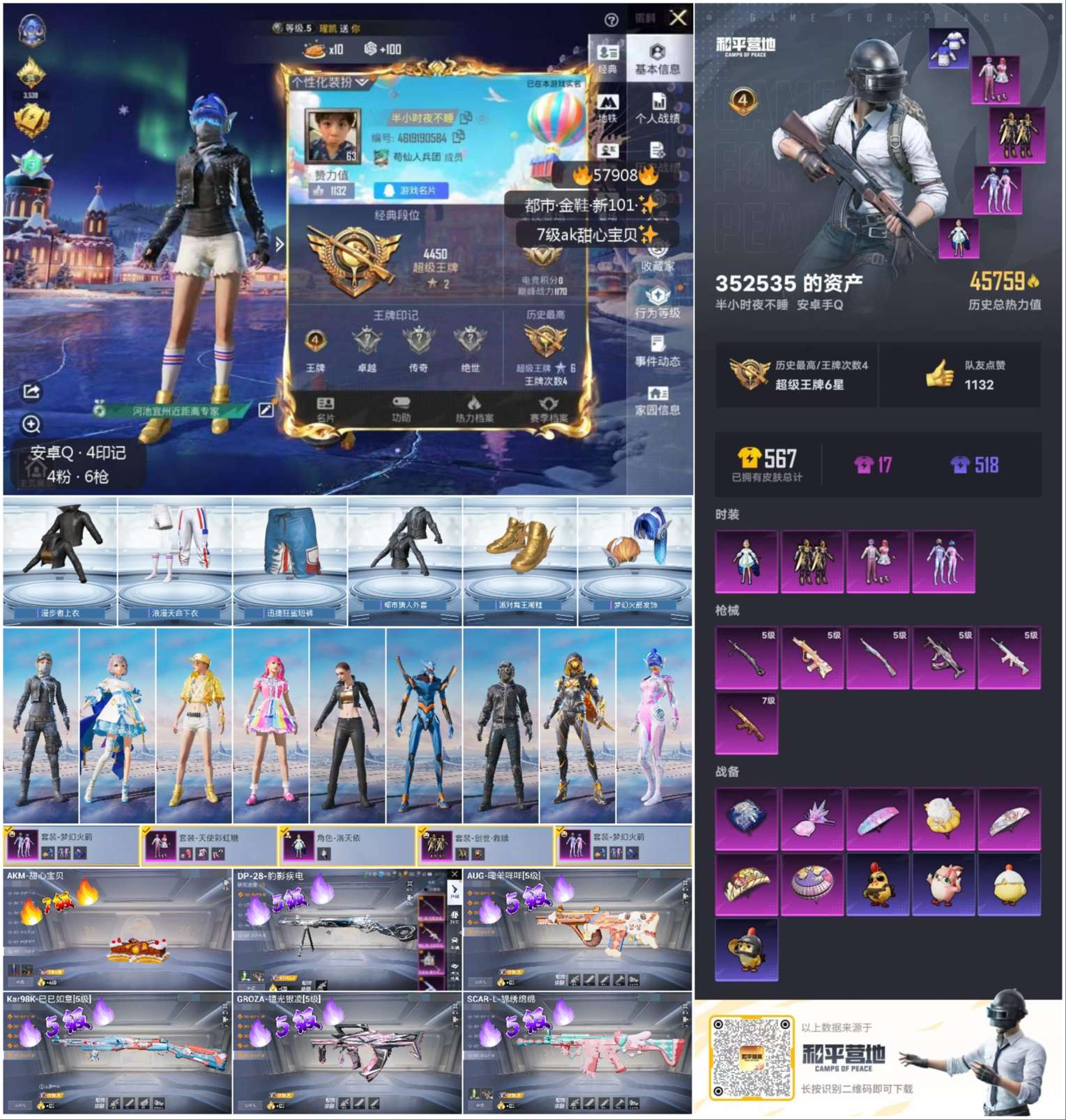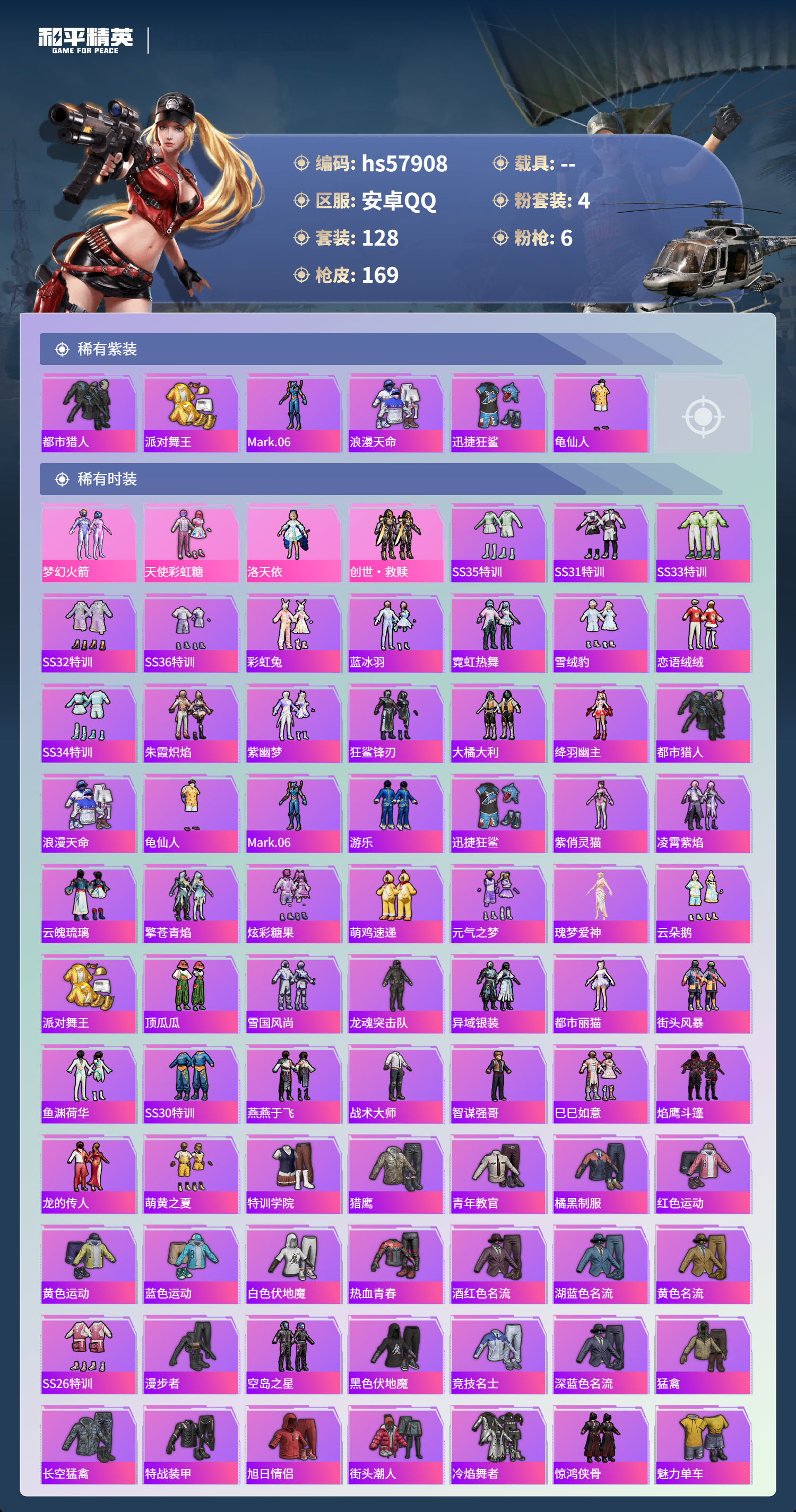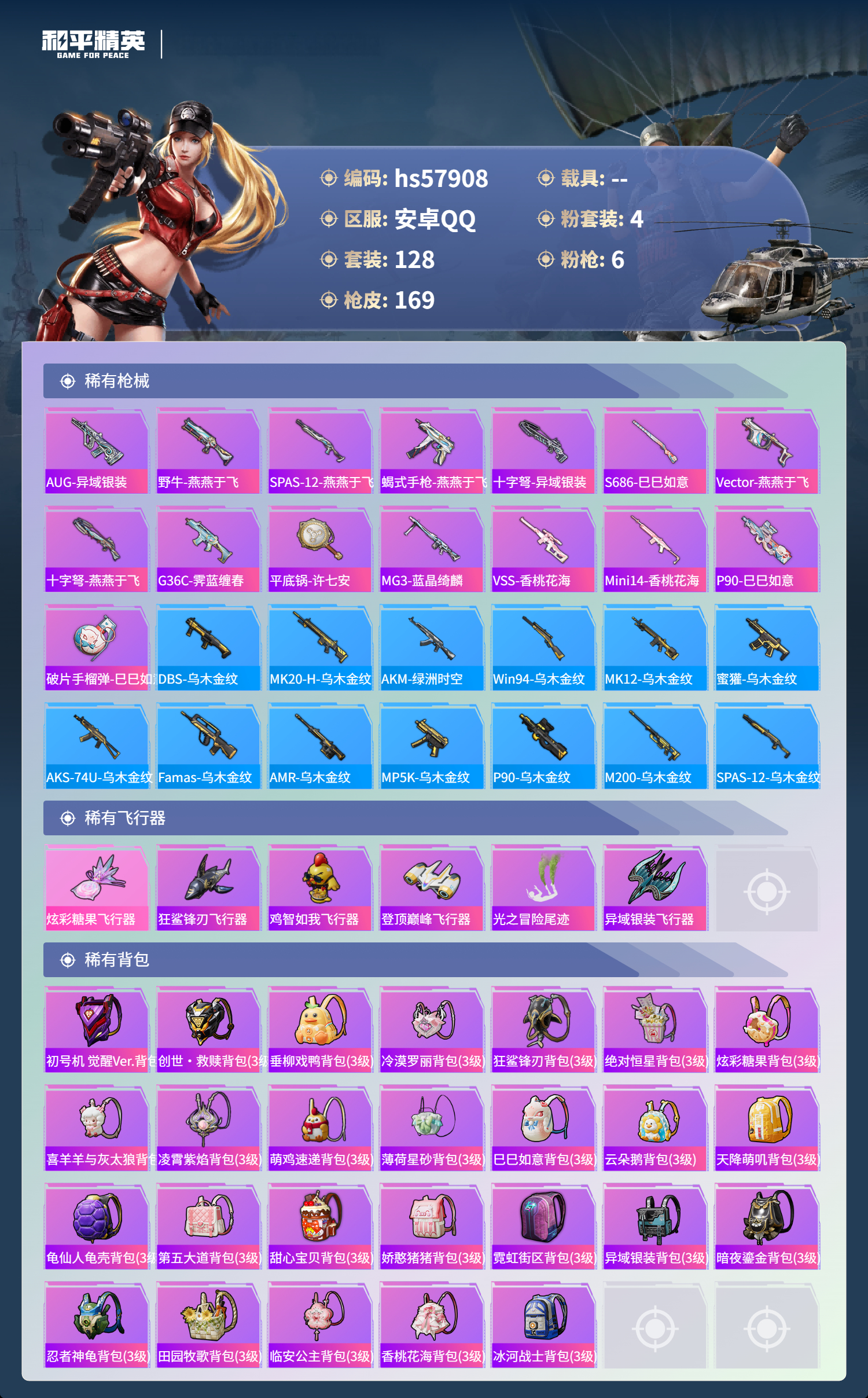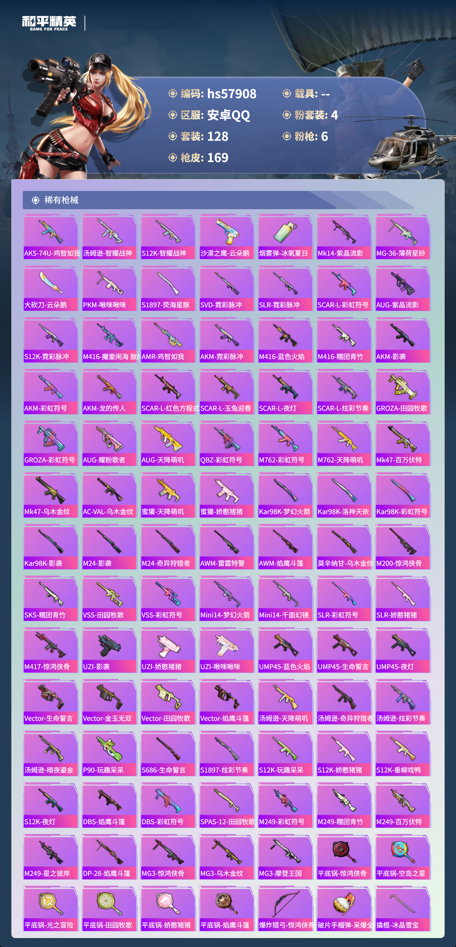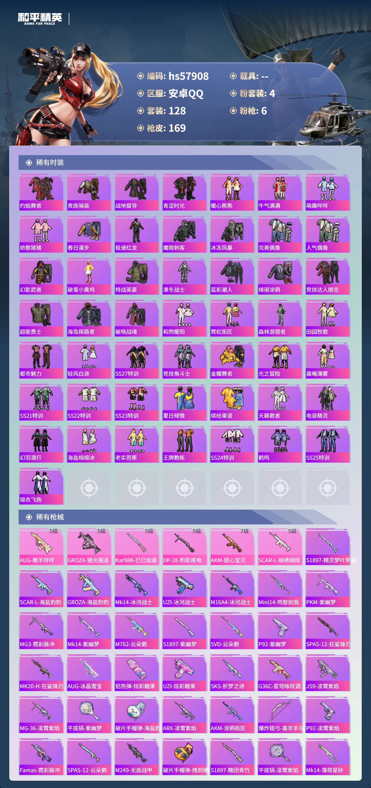 hs57908 安卓手q-4王牌印记-4粉装-6特效呛-46043热力值-128套装-169呛皮【4粉装】套装-梦幻火箭套装-天使彩虹糖角色-洛天依套装-创世·救赎【6特效呛】aug-暖羊咩咩/5级scar-l-锦绣绵绵/5级akm-甜心宝贝/7级dp-28-豹影疾电/5级kar98k-巳巳如意/5级groza-镜光银凌/5级【6稀有紫装】都市猎人派对舞王mark.06