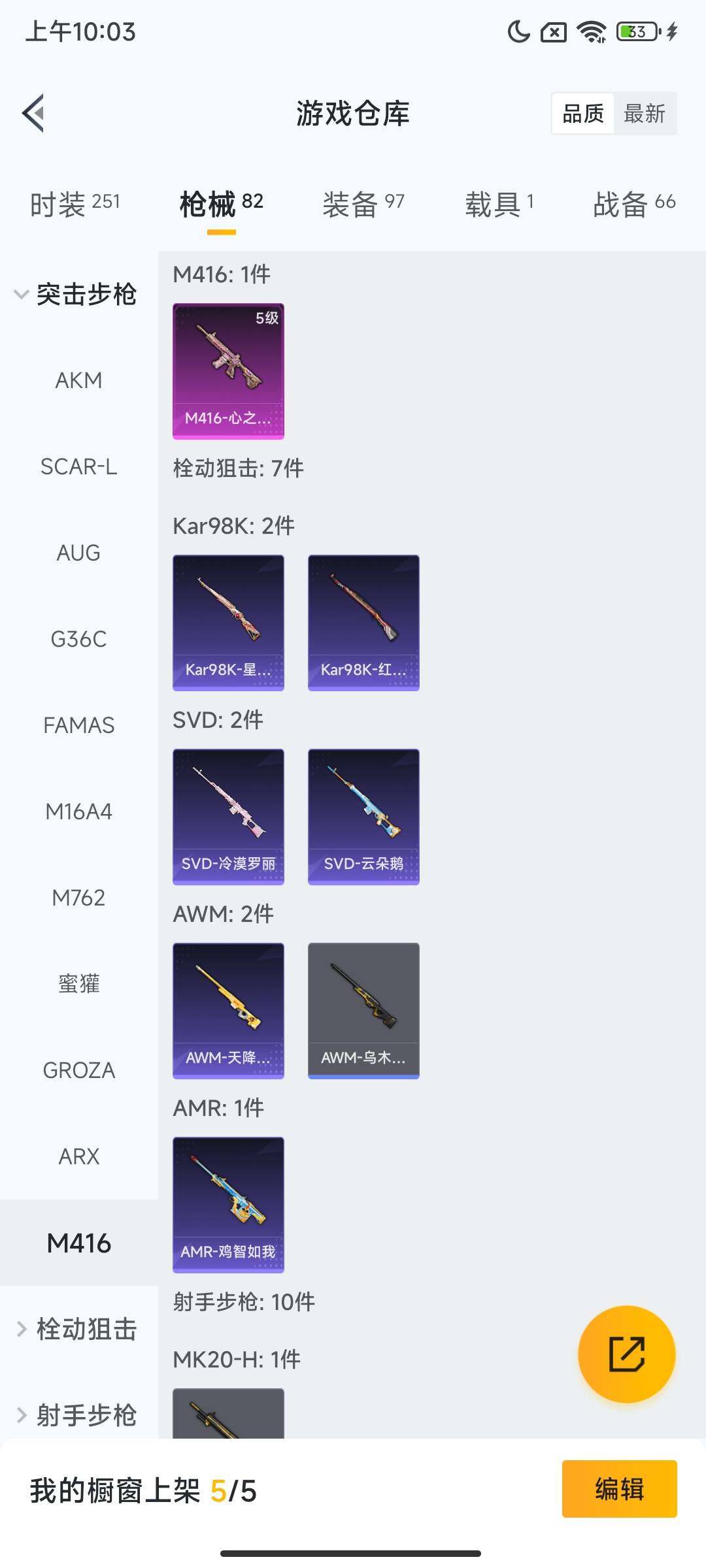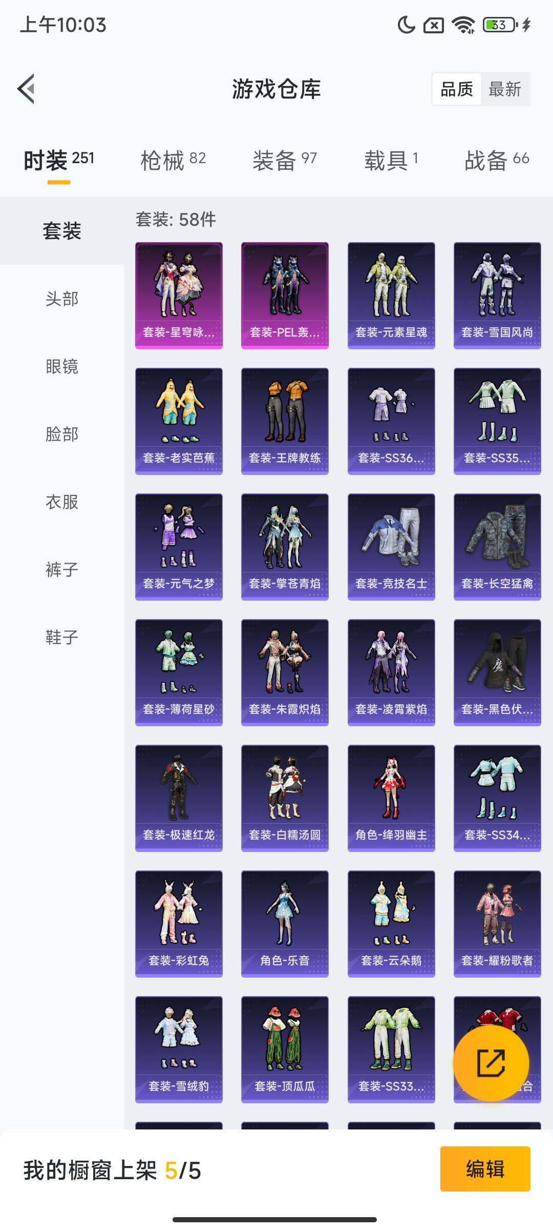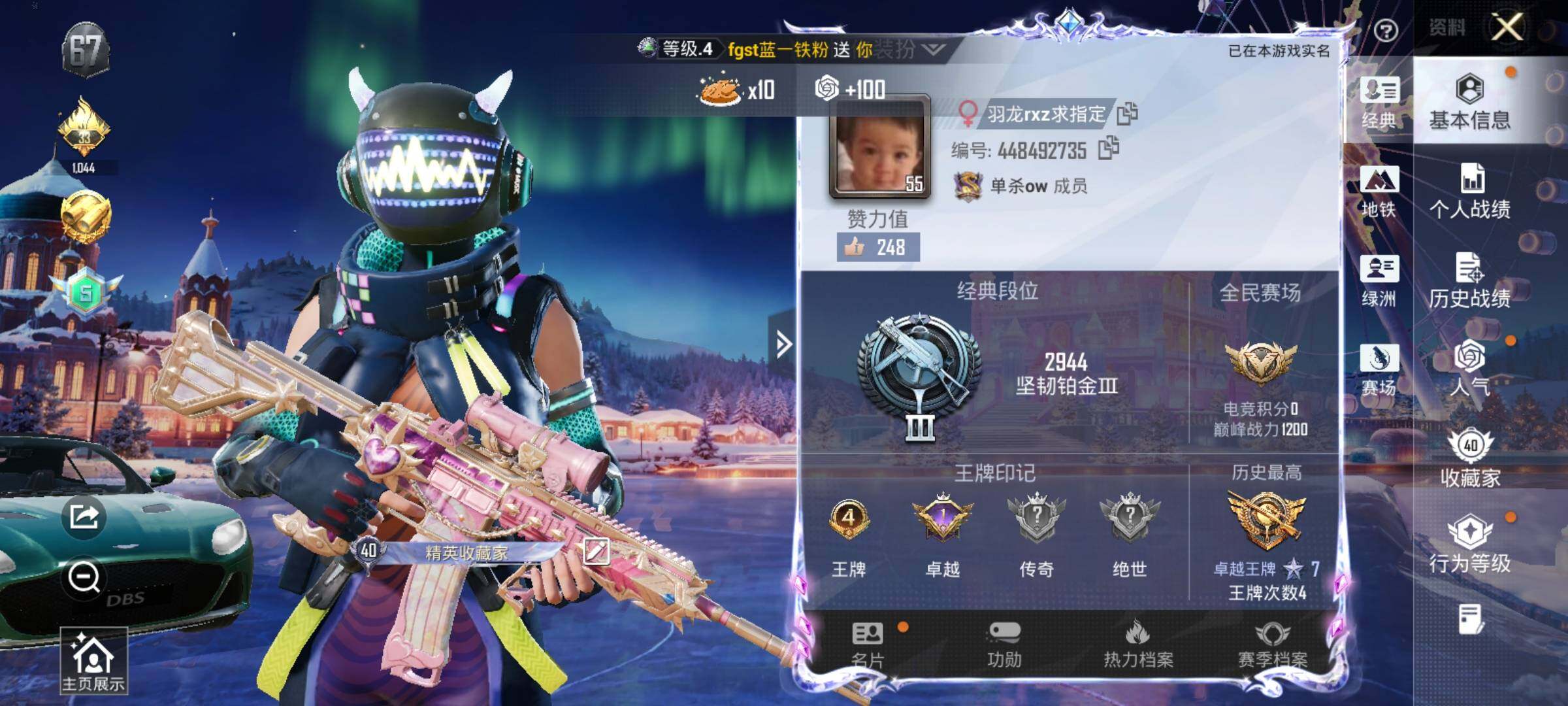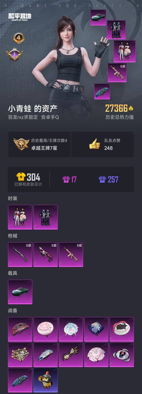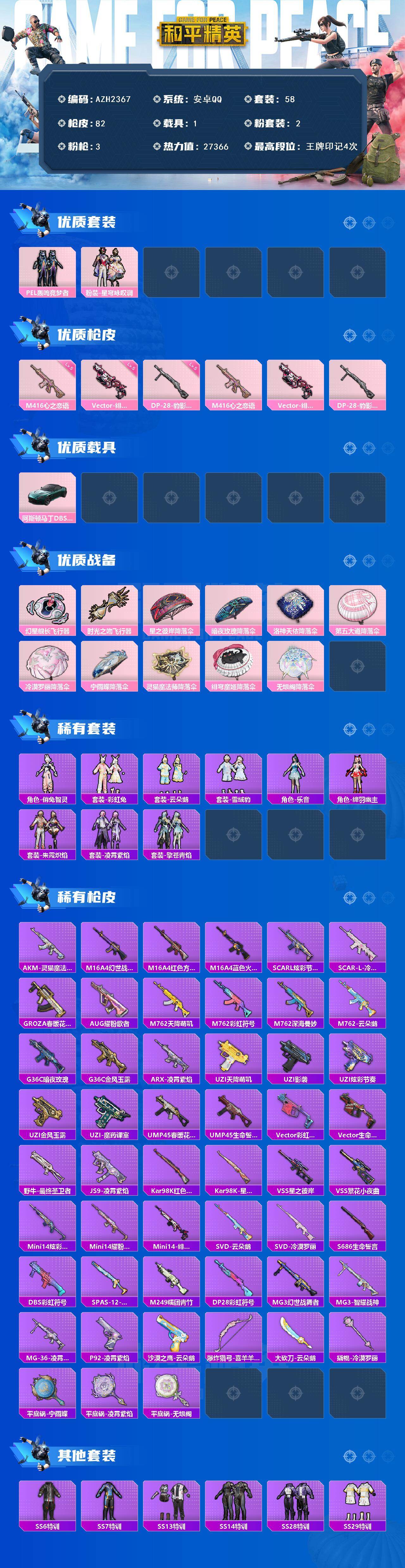 1载具-58套装-82呛皮-安卓 手q【pel轰鸣竞梦者 心之恋语m4绯穹魔姬vect 1载具】2粉装-3特效呛-1载具-2粉色飞行器-27366热力值-4王牌印记-58套装-82呛皮 【粉色套装】:粉装-pel轰鸣竞梦者,粉装-星穹咏叹调 【粉色呛皮等级】:m416-心之恋语五级,vect-绯穹魔姬五级,dp-28-豹影疾电五级 【粉色载具】:阿斯顿马丁dbs(绿) 【粉色呛皮】:m416-心之恋语
