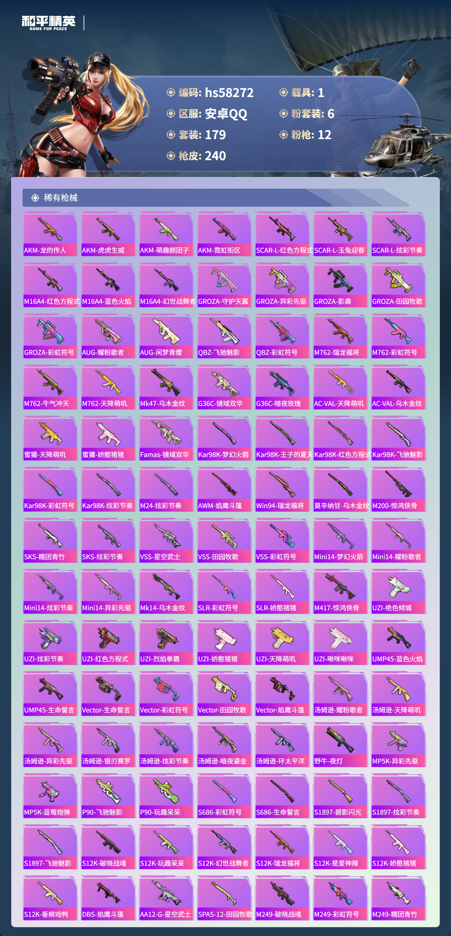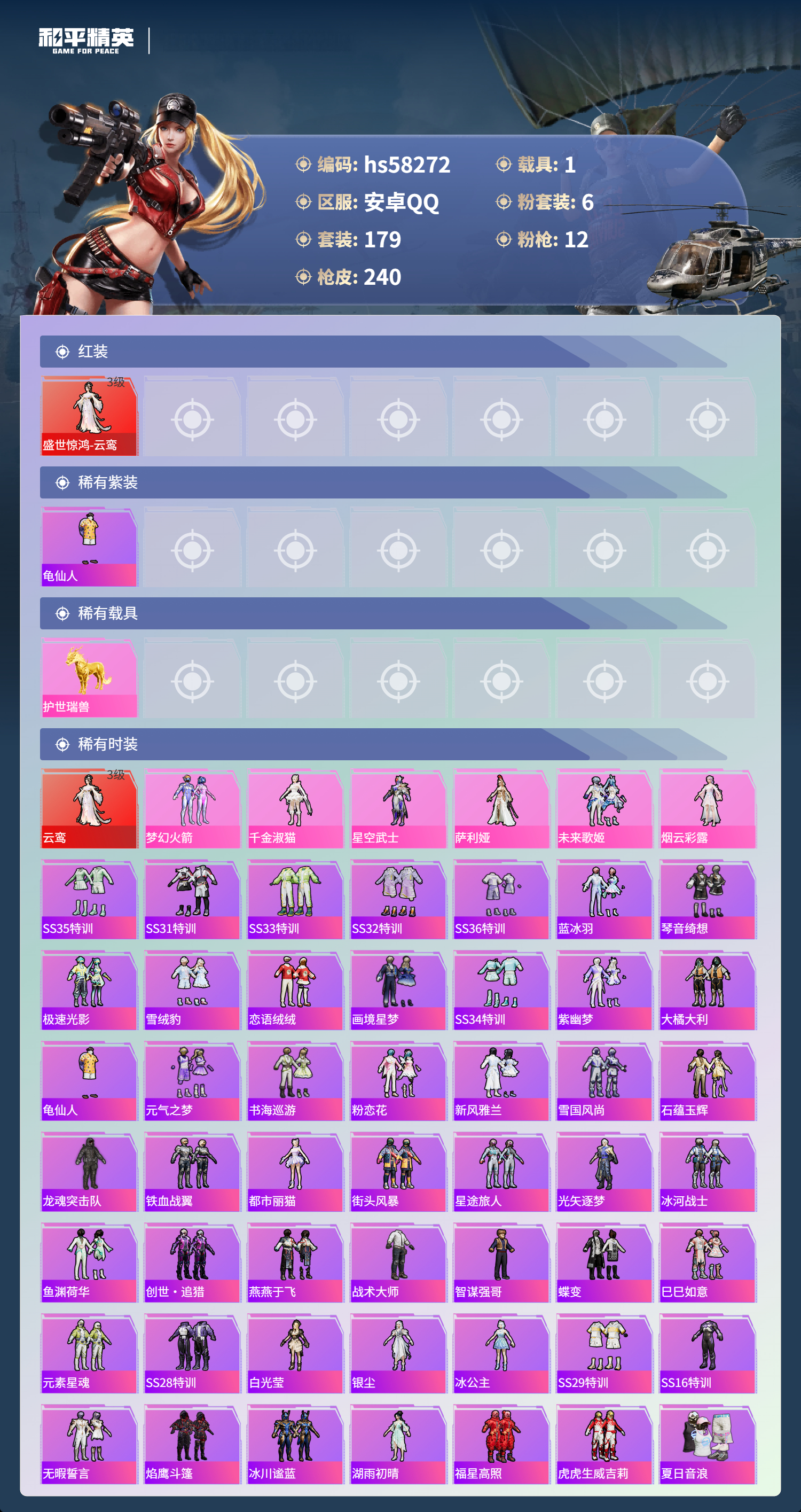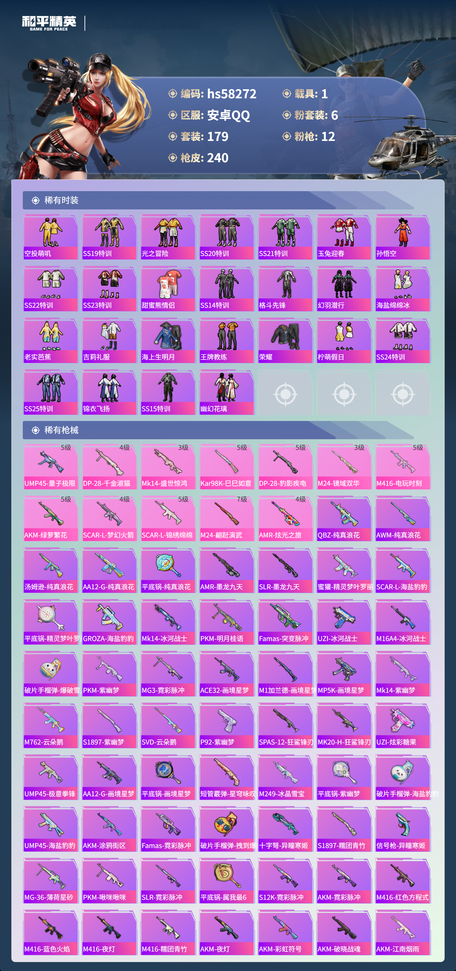 2402299安卓手q-10王牌印记-1红装-6粉装-12特效呛-1载具-80776热力值-179套装-240呛皮-2卓越印记 【1红装】盛世惊鸿-云鸾/3级 【6粉装】角色-萨利娅套装-未来歌姬套装-梦幻火箭角色-星空武士角色-烟云彩露角色-千金淑猫 【12特效呛】kar98k-巳巳如意/5级akm-绿萝繁花/5级scar-l-锦绣绵绵/5级m24-翩跹演武/7级m2
