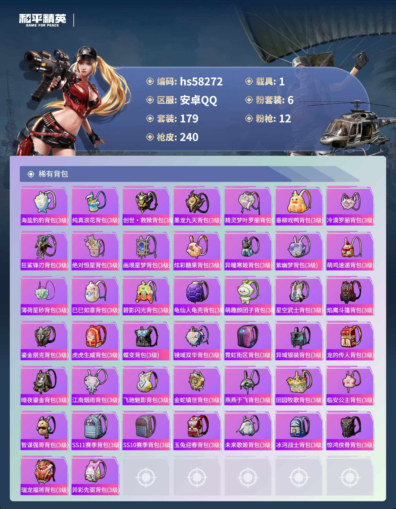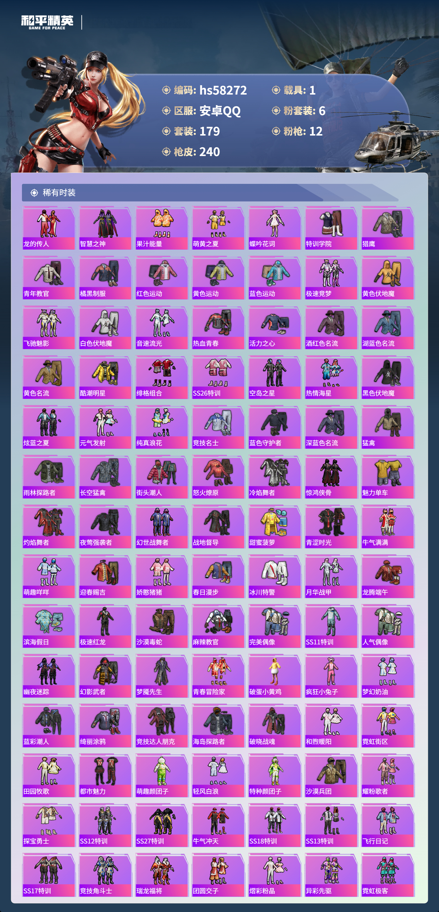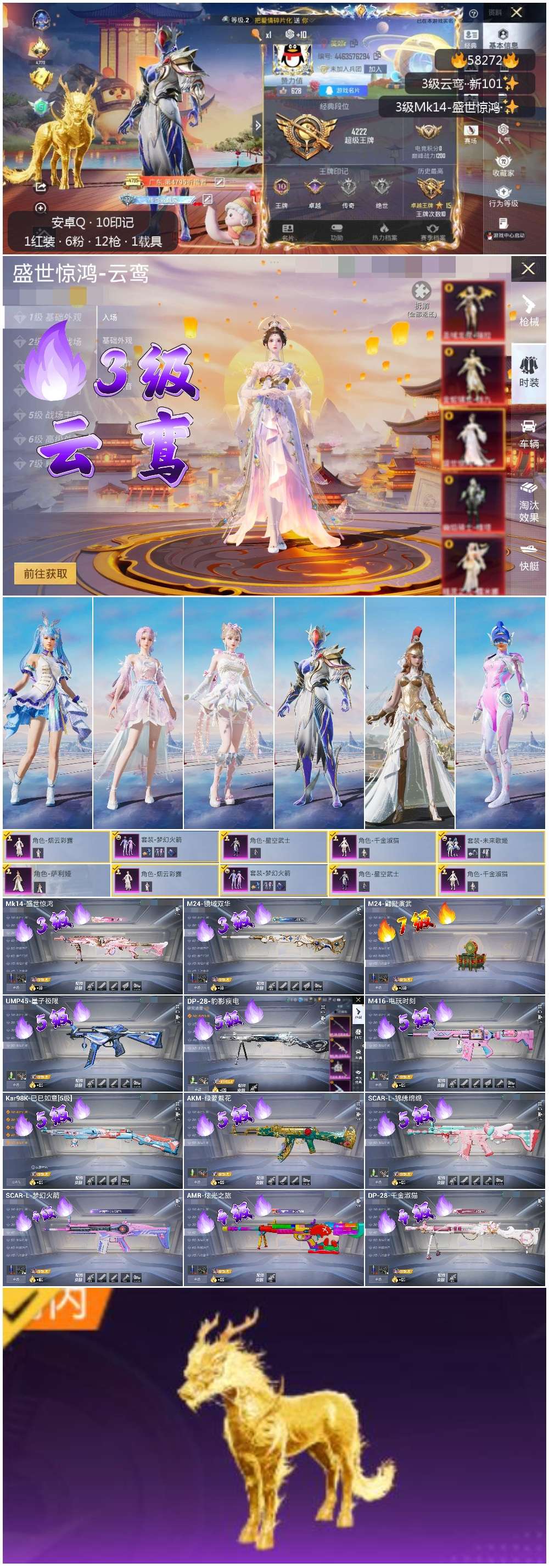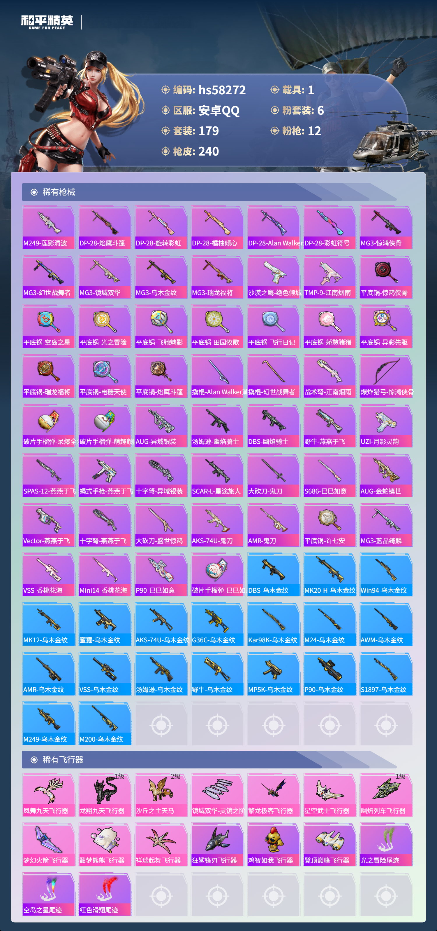 2402299安卓手q-10王牌印记-1红装-6粉装-12特效呛-1载具-80776热力值-179套装-240呛皮-2卓越印记 【1红装】盛世惊鸿-云鸾/3级 【6粉装】角色-萨利娅套装-未来歌姬套装-梦幻火箭角色-星空武士角色-烟云彩露角色-千金淑猫 【12特效呛】kar98k-巳巳如意/5级akm-绿萝繁花/5级scar-l-锦绣绵绵/5级m24-翩跹演武/7级m2