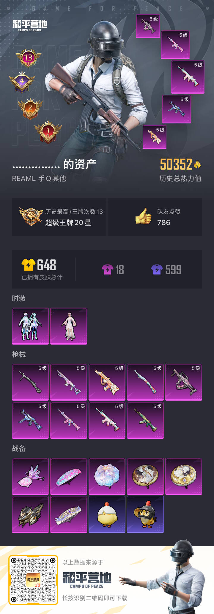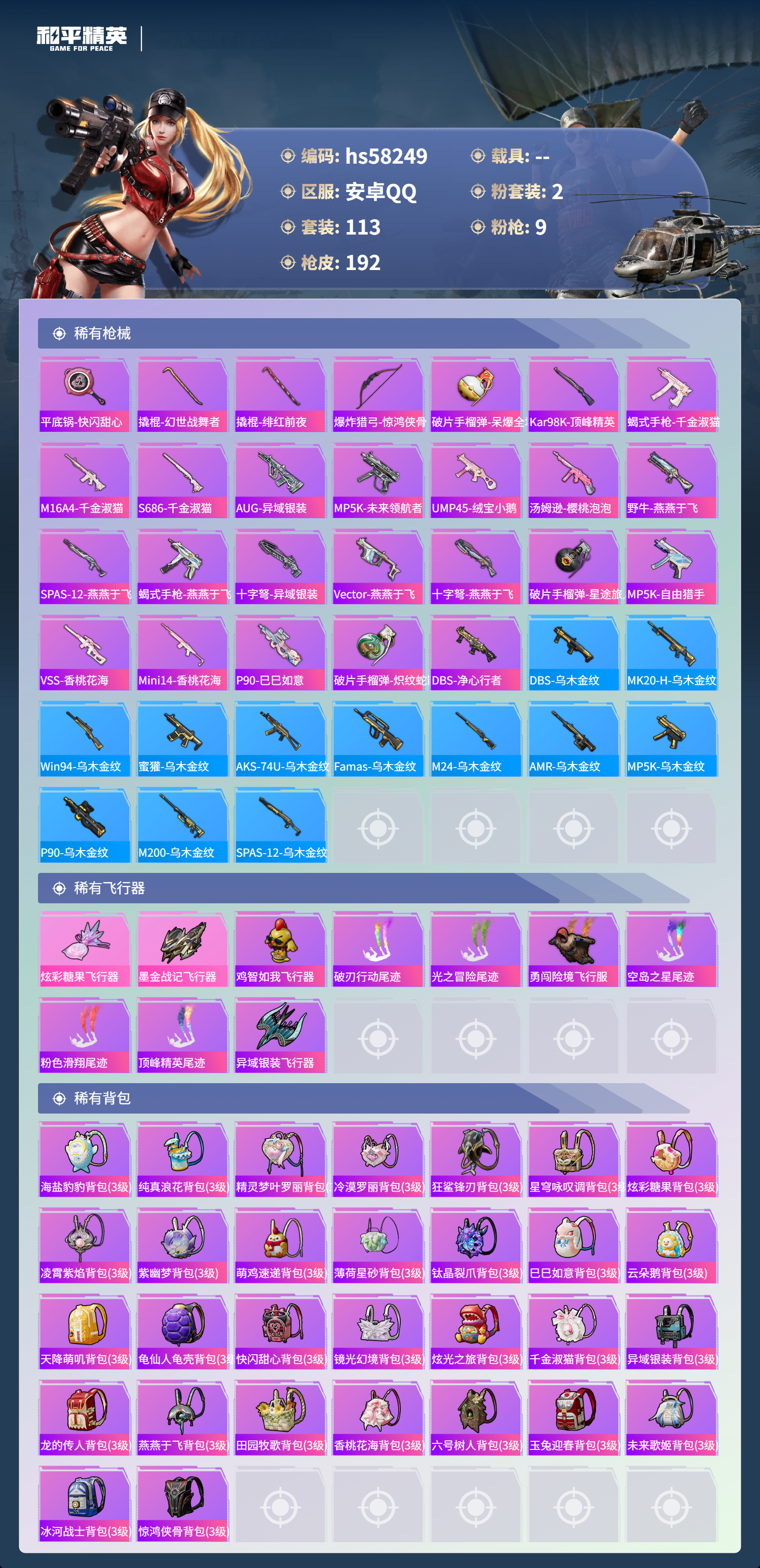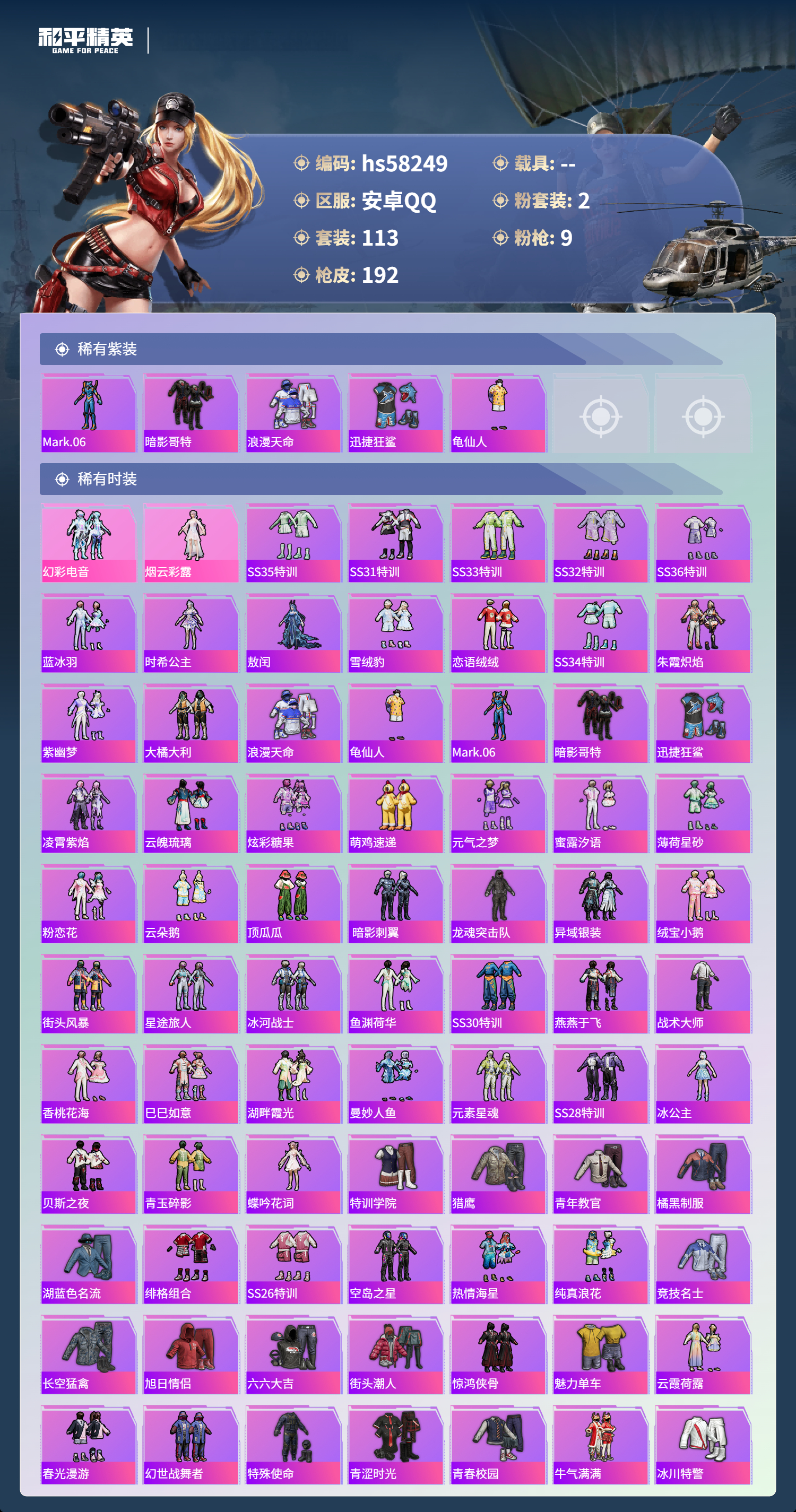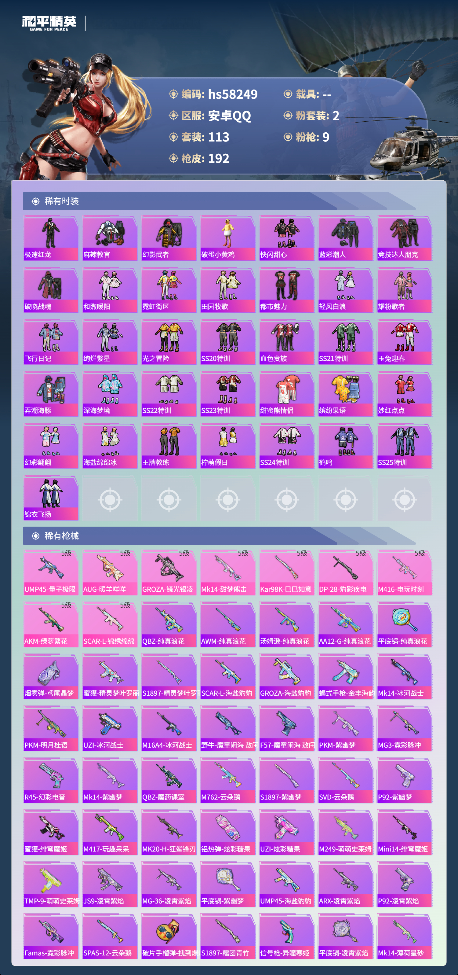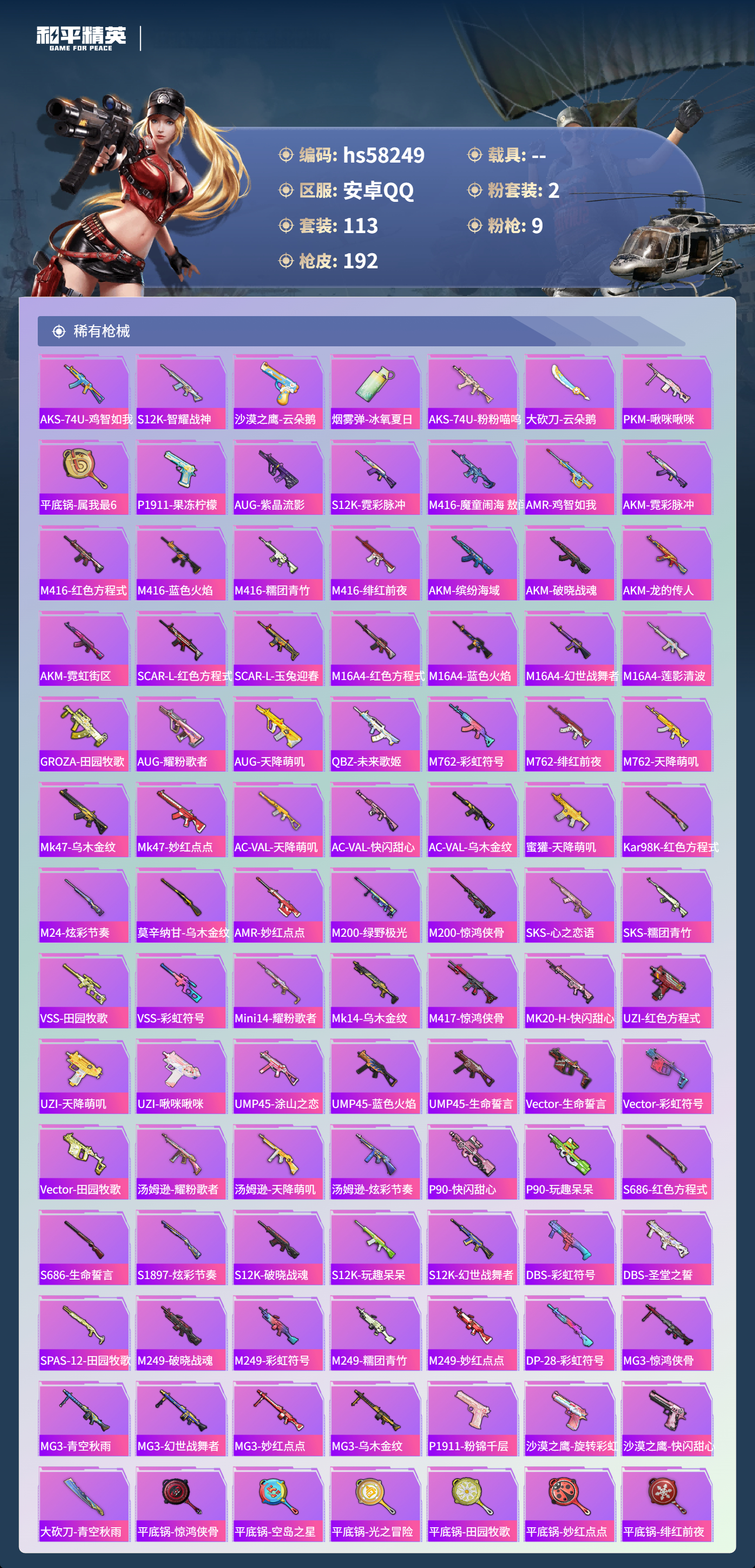 hs58249 安卓手q-13王牌印记-2粉装-9特效呛-50352热力值-113套装-192呛皮-4卓越印记-2传奇印记【2粉装】角色-烟云彩露套装-幻彩电音【9特效呛】ump45-量子极限/5级kar98k-巳巳如意/5级scar-l-锦绣绵绵/5级dp-28-豹影疾电/5级m416-电玩时刻/5级groza-镜光银凌/5级mk14-甜梦熊击/5级akm-绿萝繁花/5级a
