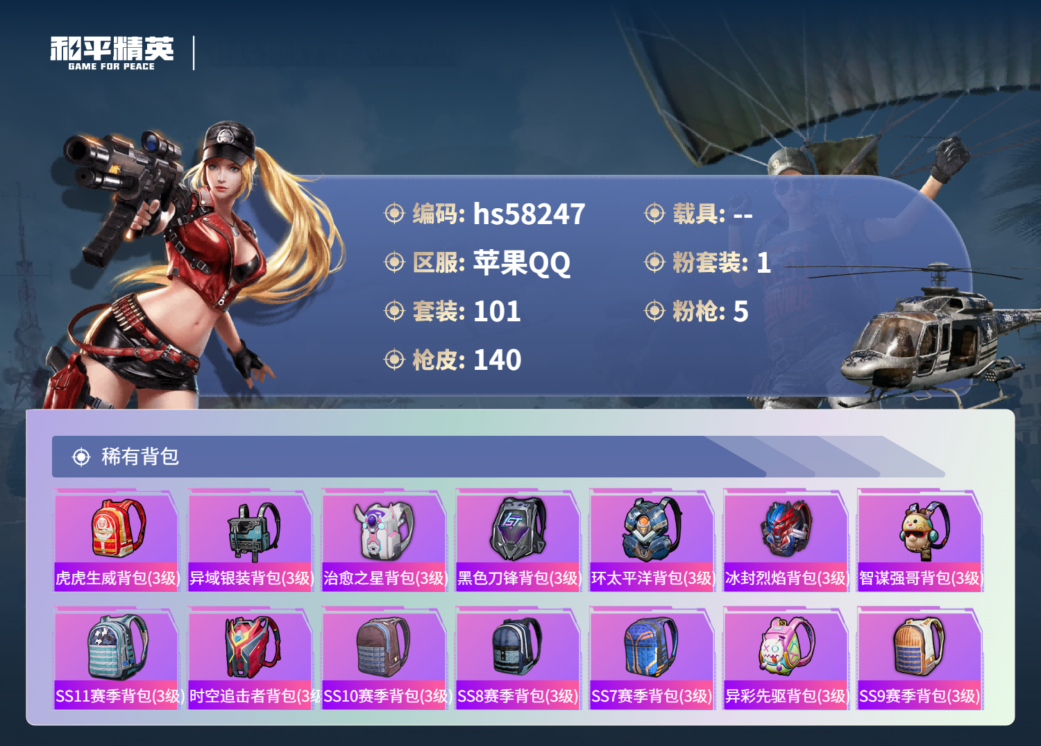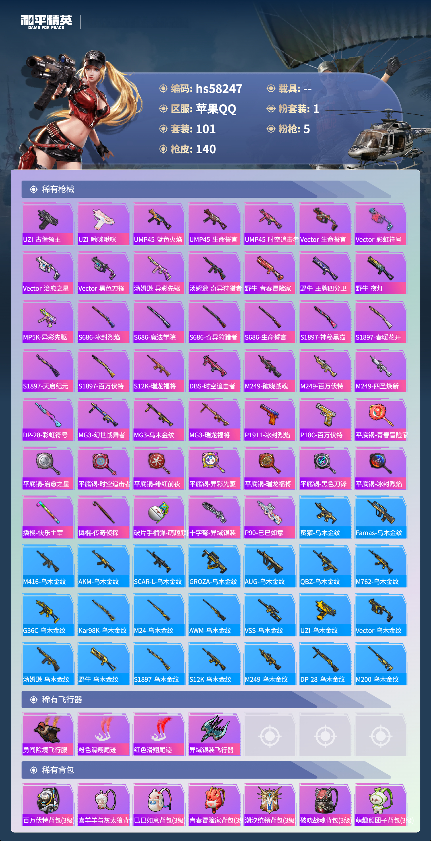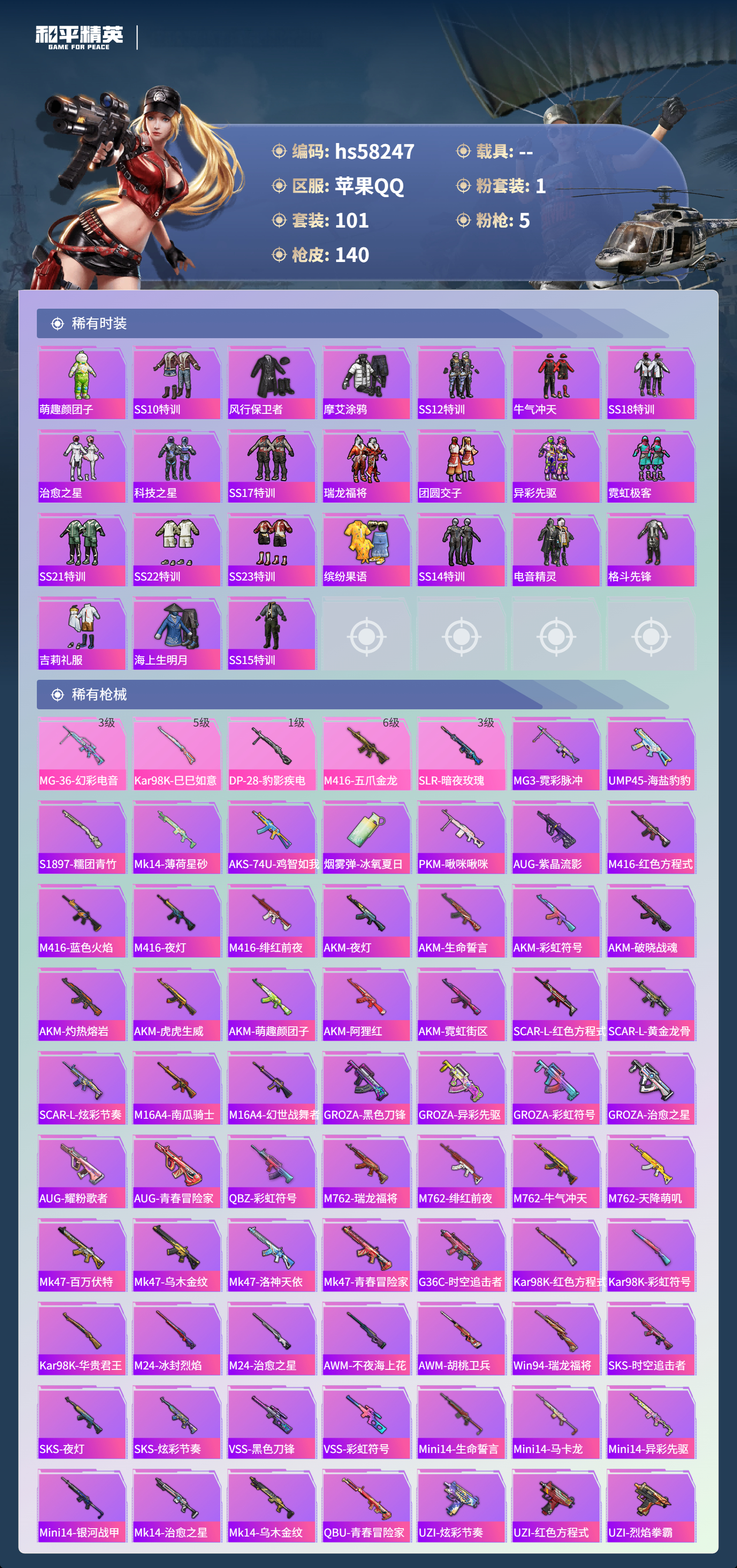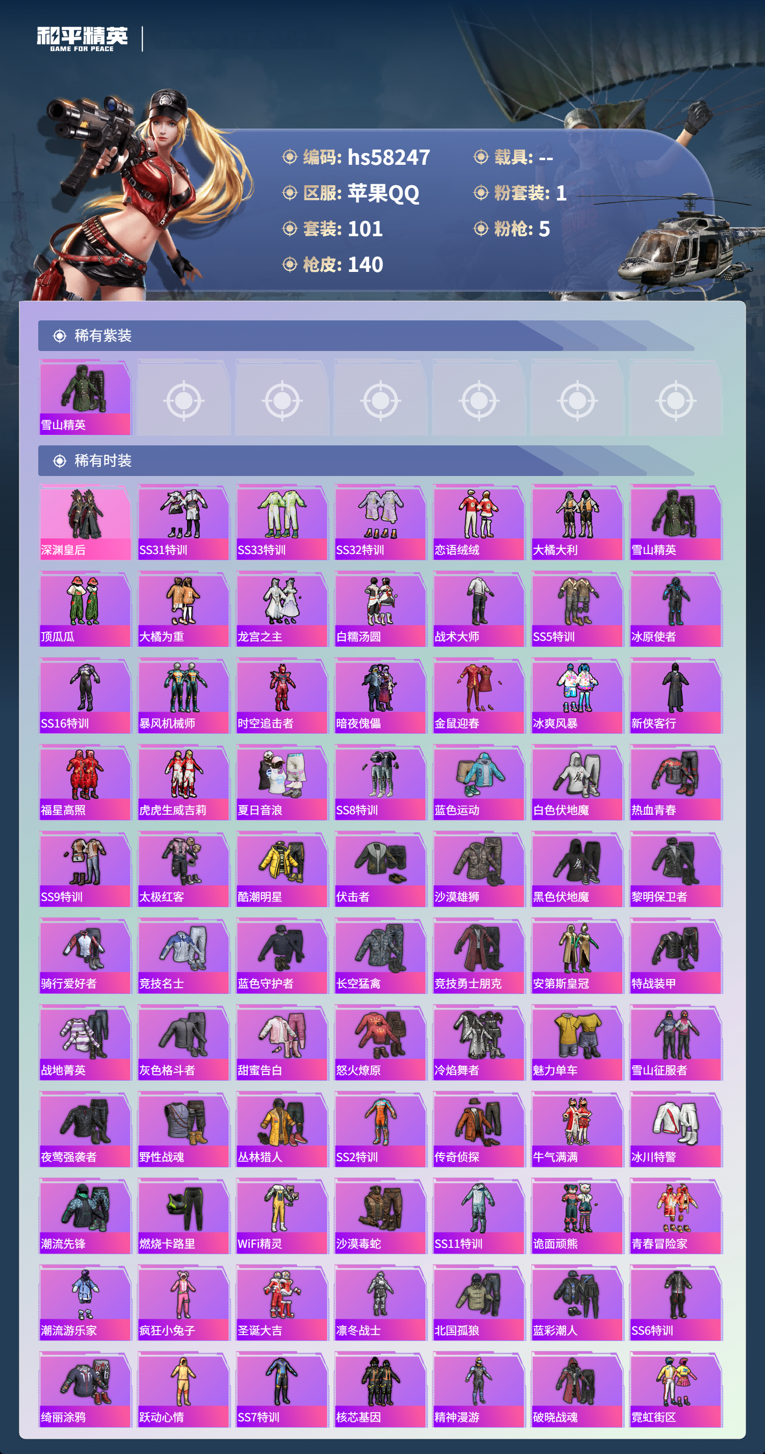 0载具-101套装-140呛皮-hs58247 苹果手q-8王牌印记-1粉装-5特效呛-41581热力值-101套装-140呛皮【1粉装】套装-深渊皇后【5特效呛】dp-28-豹影疾电/1级m416-五爪金龙/6级mg-36-幻彩电音/3级kar98k-巳巳如意/5级slr-暗夜玫瑰/3级【1稀有紫装】雪山精英【101稀有时装】ss31特训ss33特训ss32特训恋语绒绒大橘大利雪山精英顶瓜瓜深渊皇