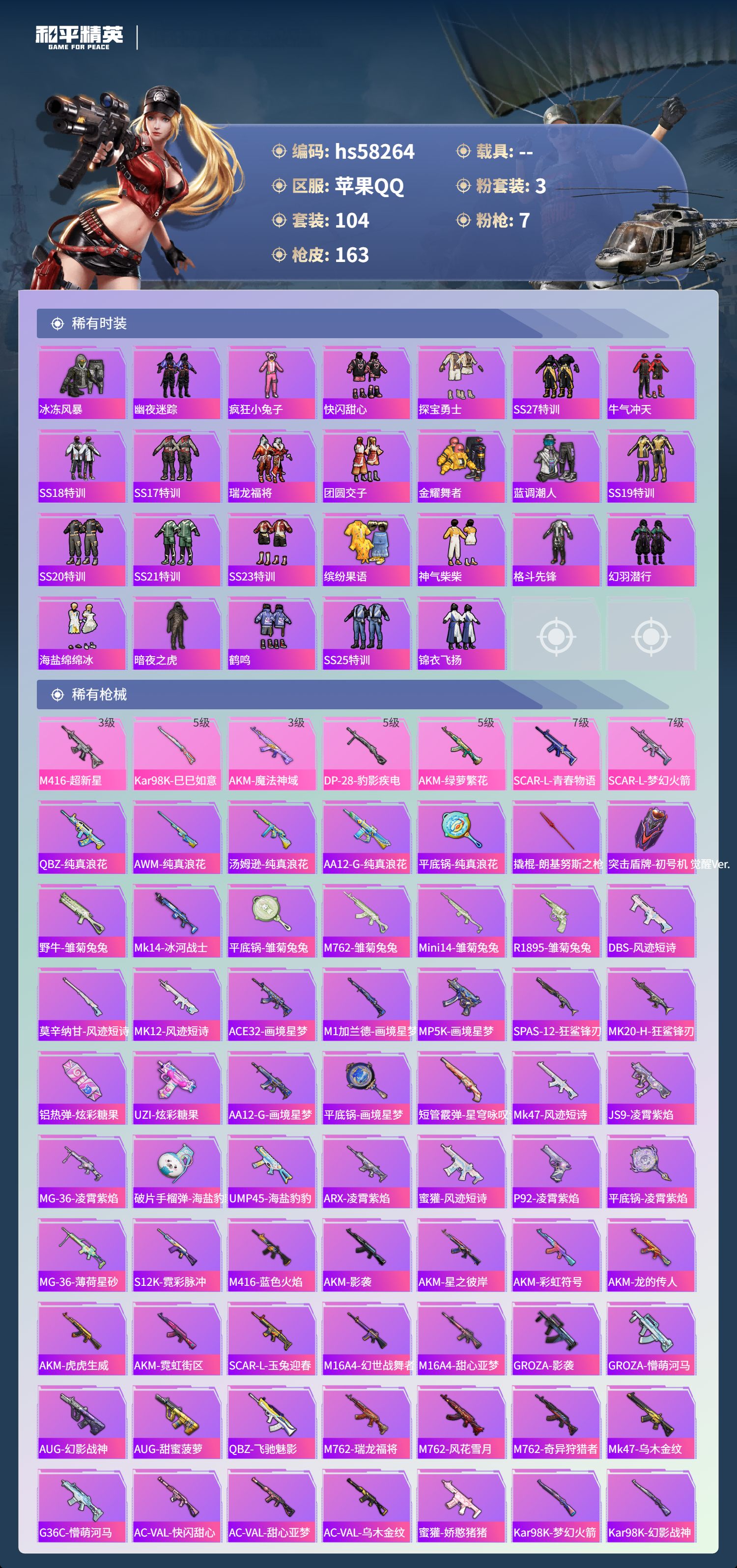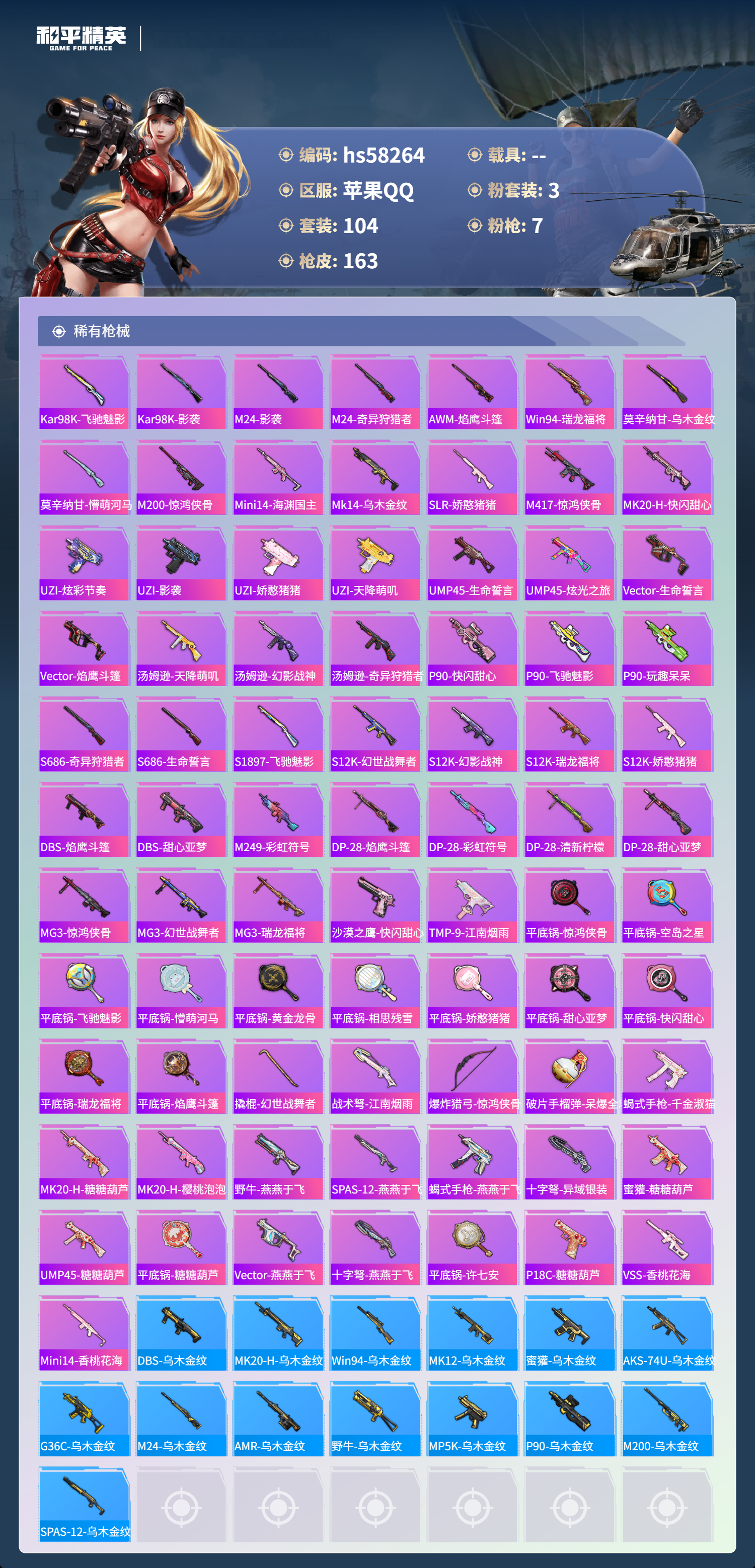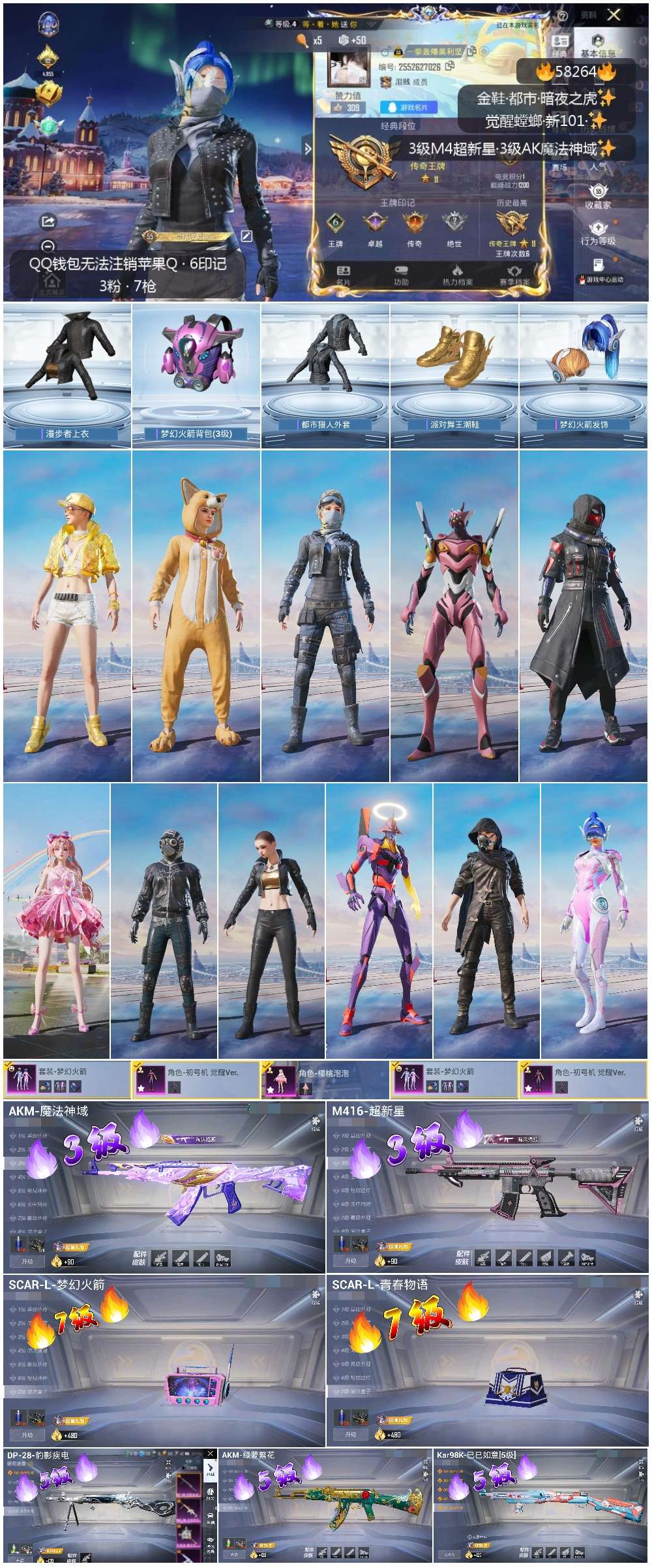 0载具-104套装-163呛皮-hs58264 苹果手q-6王牌印记-3粉装-7特效呛-50059热力值-104套装-163呛皮-1卓越印记-1传奇印记【3粉装】角色-樱桃泡泡角色-初号机 觉醒ver.套装-梦幻火箭【7特效呛】akm-绿萝繁花/5级kar98k-巳巳如意/5级scar-l-梦幻火箭/7级dp-28-豹影疾电/5级akm-魔法神域/3级m416-超新星/3级scar-l-青春物语/7级【5稀