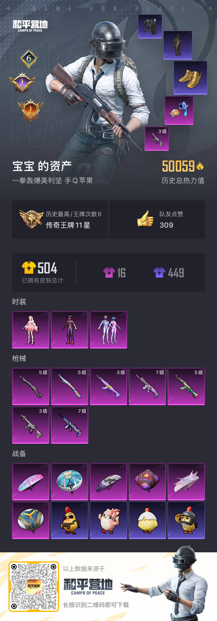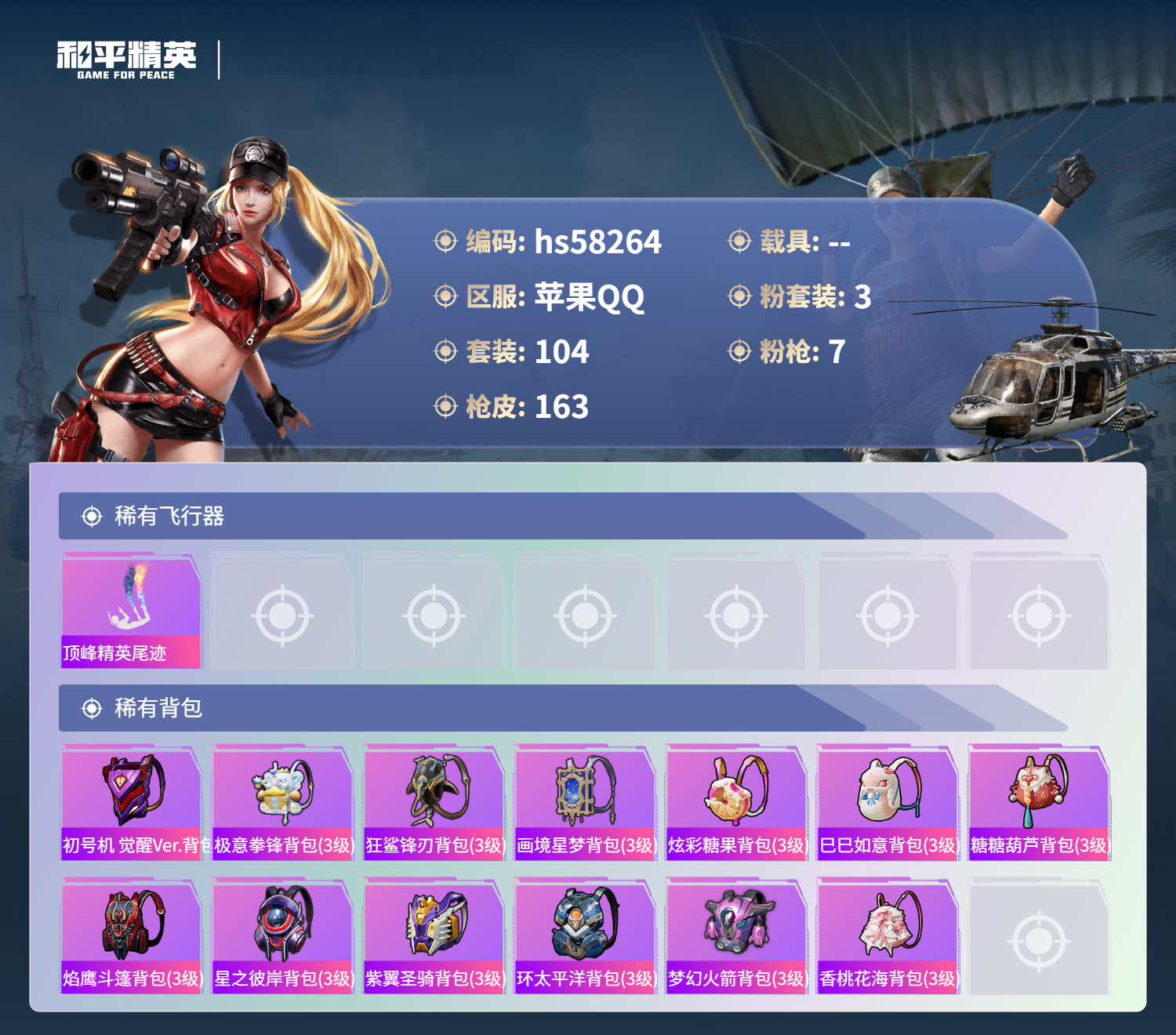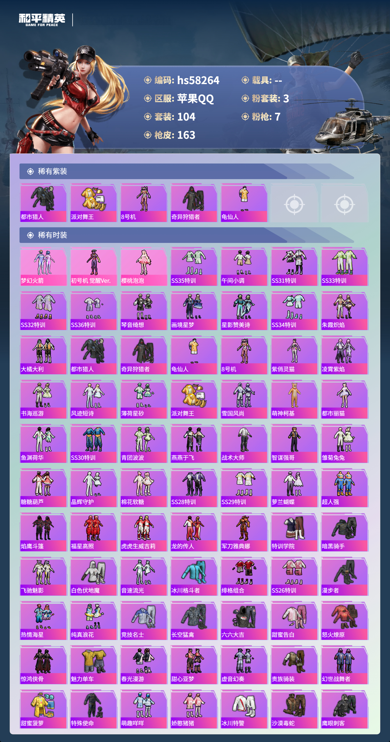 0载具-104套装-163呛皮-hs58264 苹果手q-6王牌印记-3粉装-7特效呛-50059热力值-104套装-163呛皮-1卓越印记-1传奇印记【3粉装】角色-樱桃泡泡角色-初号机 觉醒ver.套装-梦幻火箭【7特效呛】akm-绿萝繁花/5级kar98k-巳巳如意/5级scar-l-梦幻火箭/7级dp-28-豹影疾电/5级akm-魔法神域/3级m416-超新星/3级scar-l-青春物语/7级【5稀