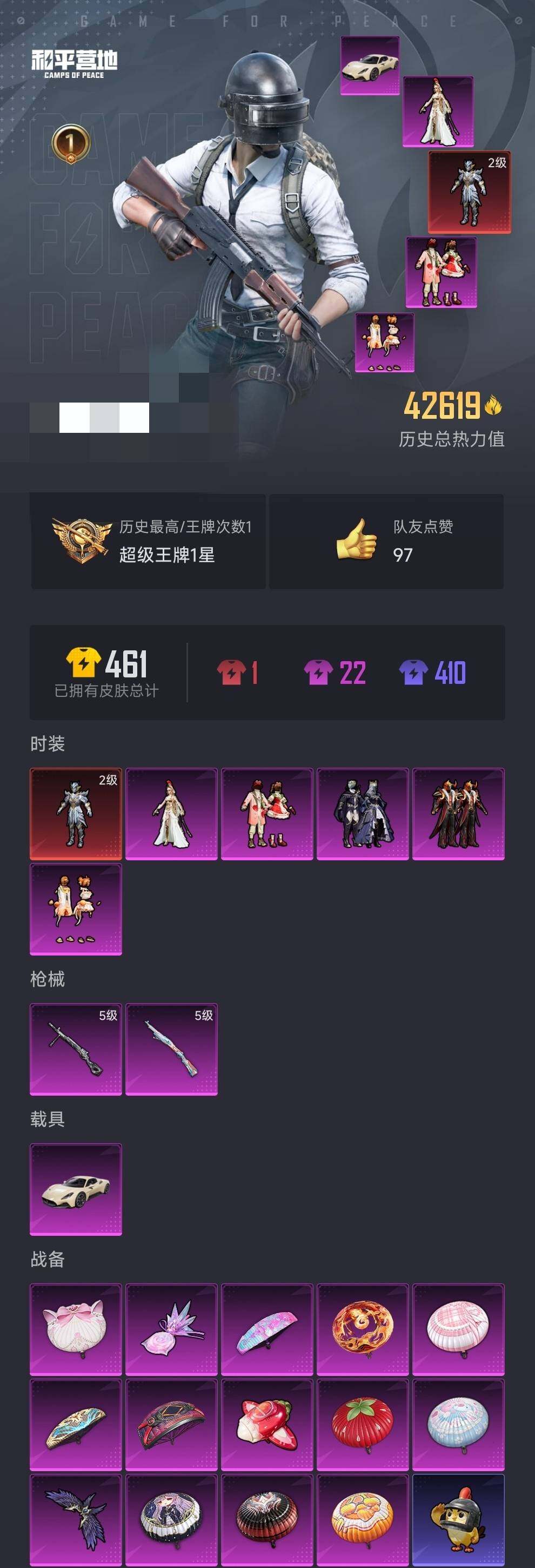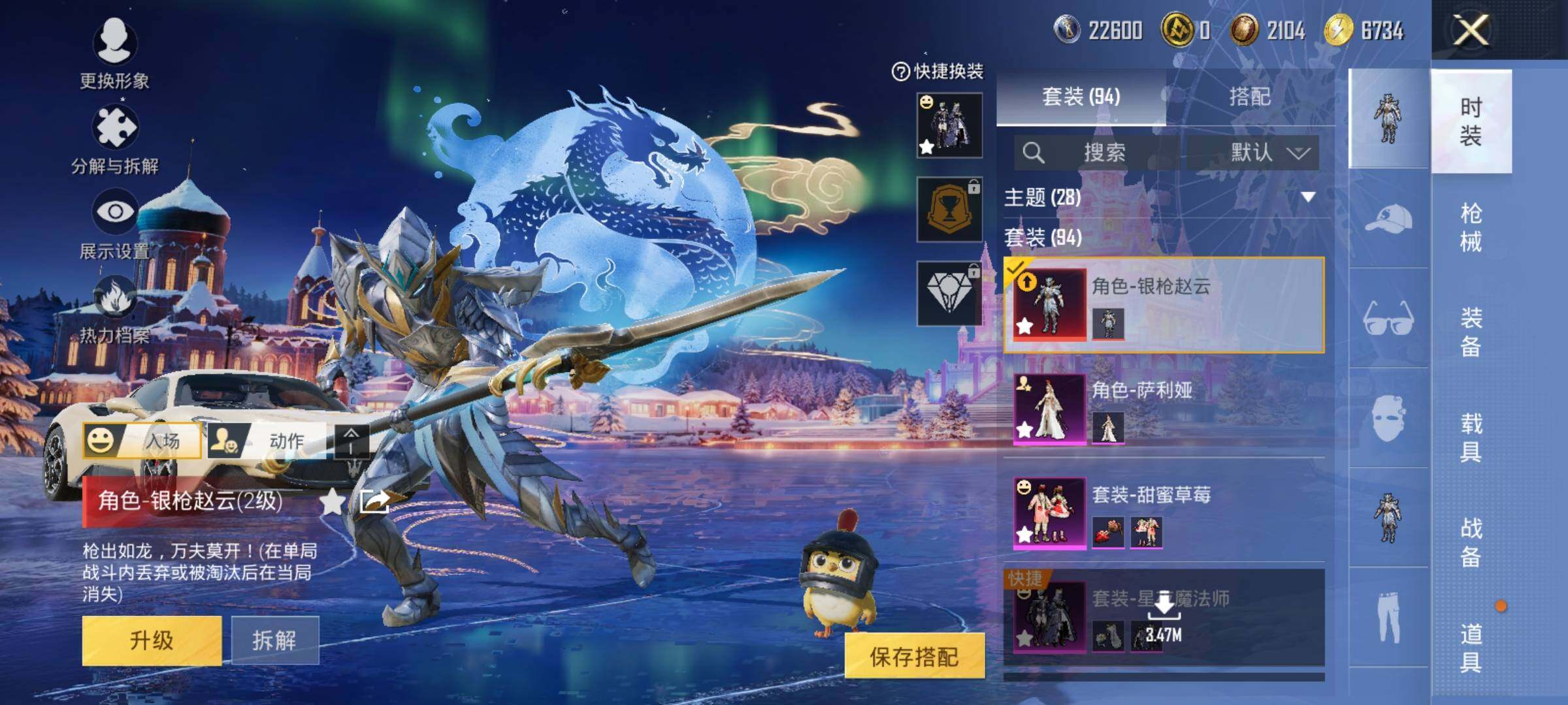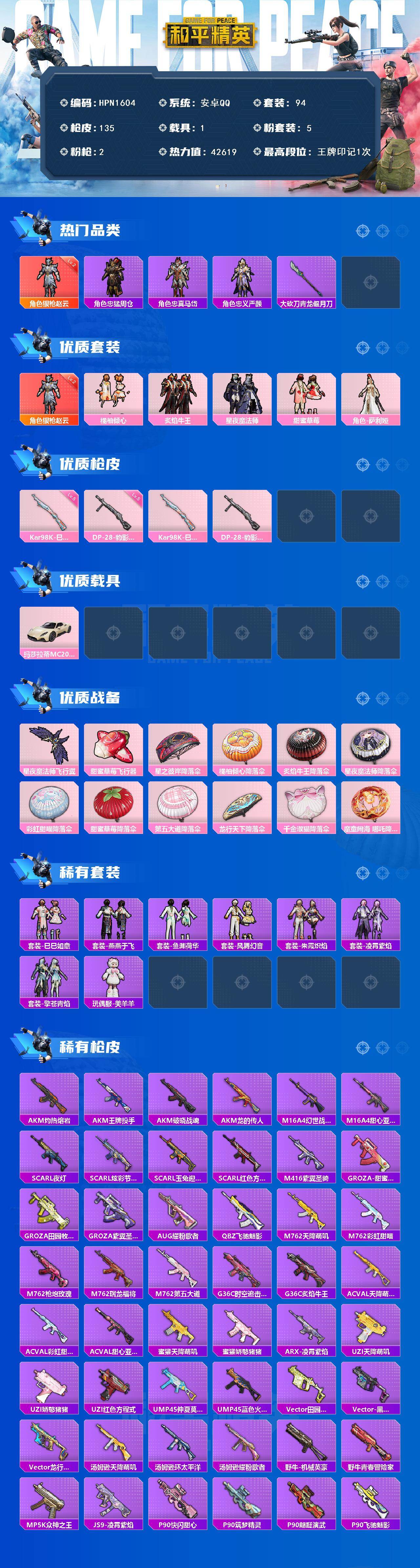 【n1604】94套装/呛械2/装备154/载具1/战备77/王牌印记1/热力值42619/五级kar98k-巳巳如意/五级dp-28-豹影疾电/二级角色-银呛赵云/角色-银呛赵云/角色-忠猛周仓/角色-忠真马岱/角色-忠义严颜 /大砍刀-青龙偃月刀/橘柚倾心/炙焰牛王/星夜魔法师/甜蜜草莓/萨利娅/玛莎拉蒂m白色/kar98k-巳巳如意/dp28豹影疾电/星夜魔法师飞行翼/甜蜜草莓飞行