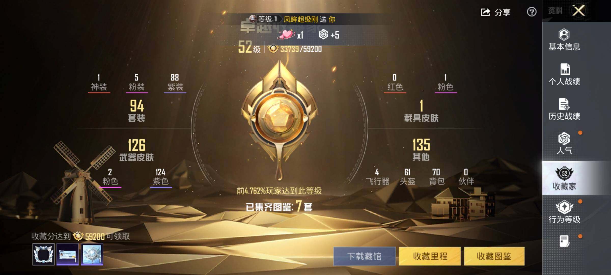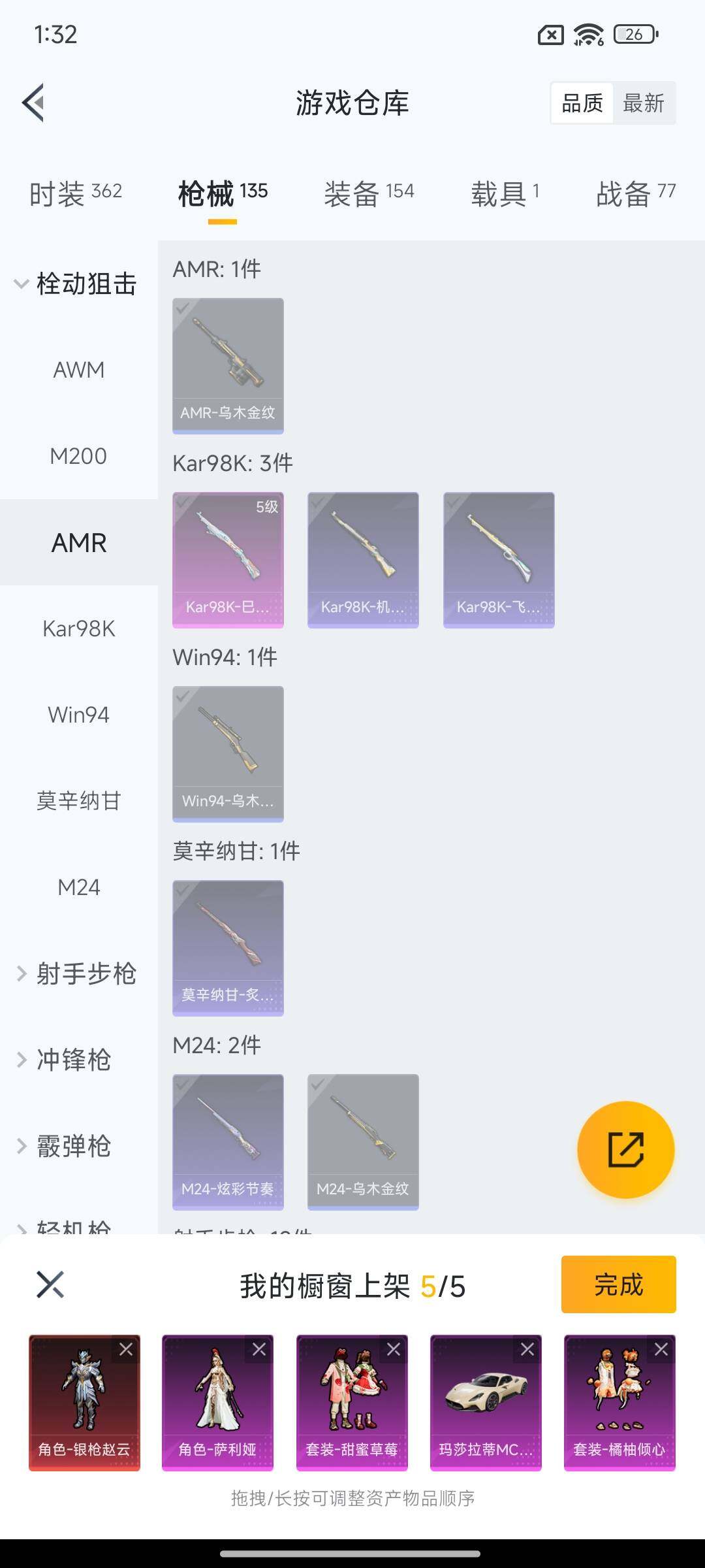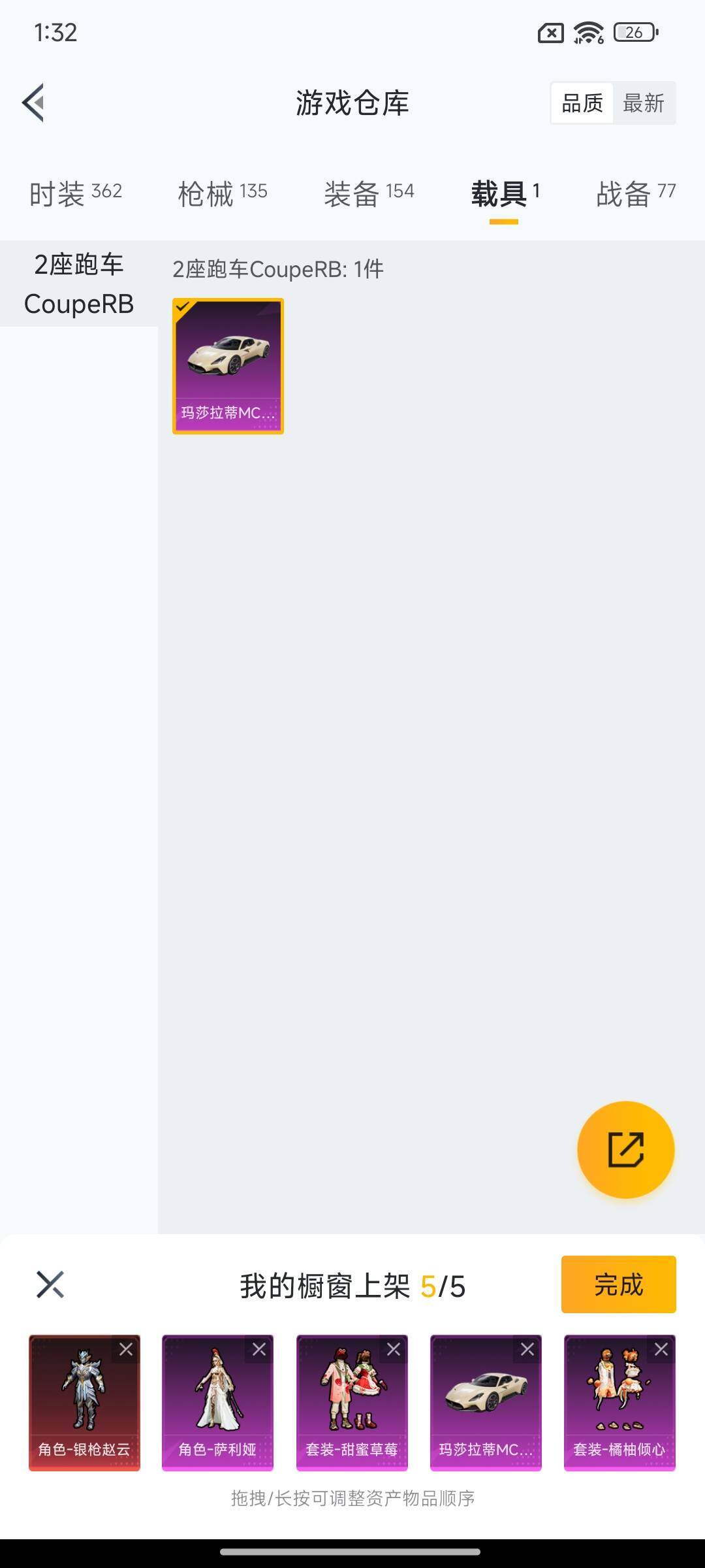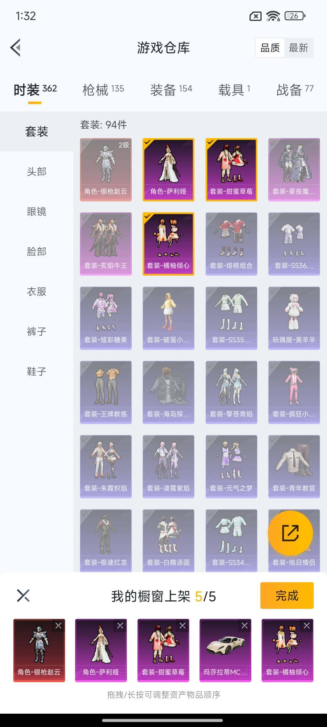 【n1604】94套装/呛械2/装备154/载具1/战备77/王牌印记1/热力值42619/五级kar98k-巳巳如意/五级dp-28-豹影疾电/二级角色-银呛赵云/角色-银呛赵云/角色-忠猛周仓/角色-忠真马岱/角色-忠义严颜 /大砍刀-青龙偃月刀/橘柚倾心/炙焰牛王/星夜魔法师/甜蜜草莓/萨利娅/玛莎拉蒂m白色/kar98k-巳巳如意/dp28豹影疾电/星夜魔法师飞行翼/甜蜜草莓飞行