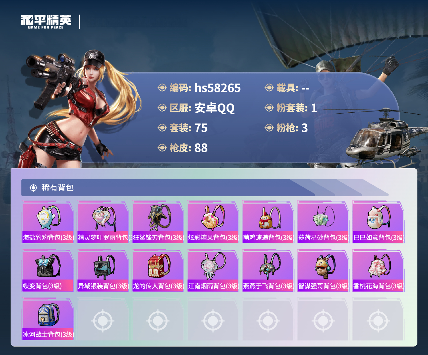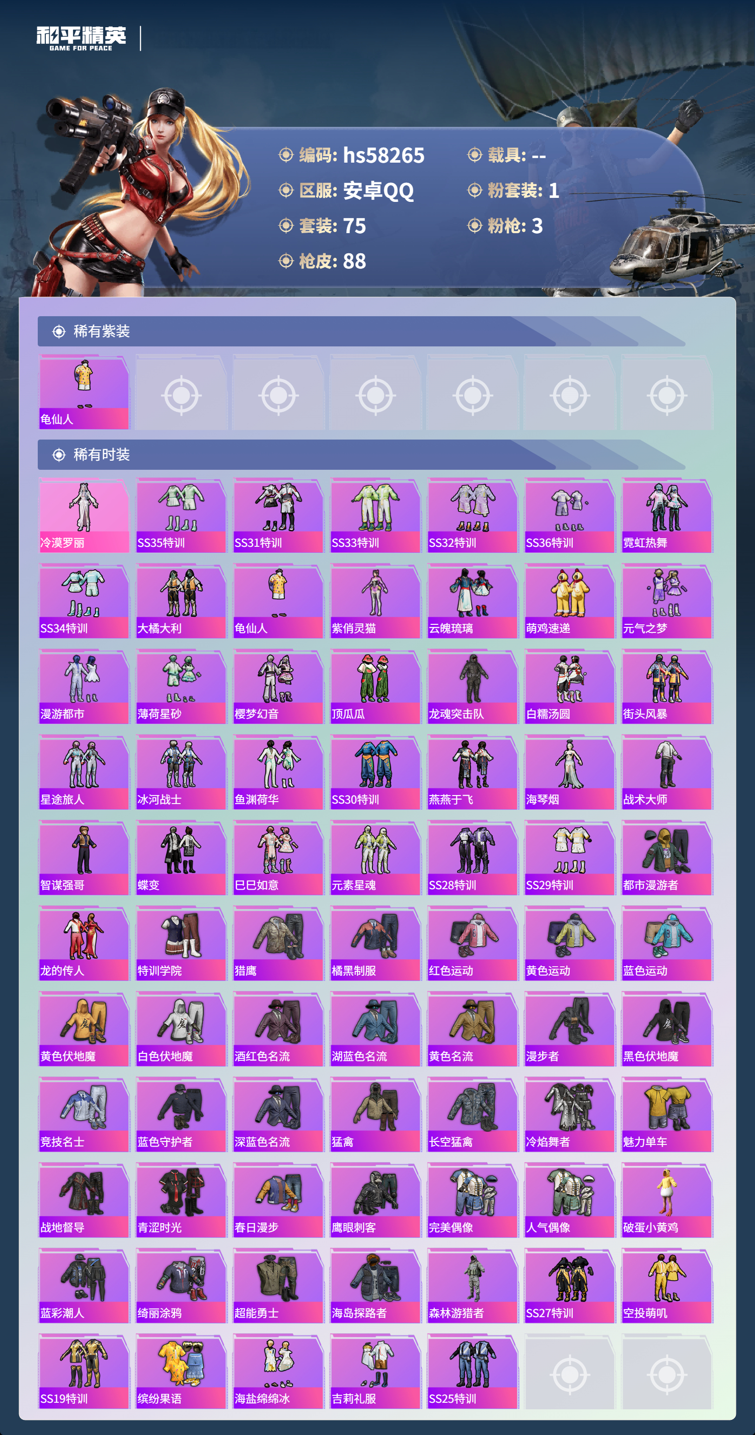 0载具-75套装-88呛皮-hs58265 安卓手q-2王牌印记-1粉装-3特效呛-25401热力值-75套装-88呛皮-1卓越印记【1粉装】角色-冷漠罗丽【3特效呛】kar98k-巳巳如意/5级dp-28-豹影疾电/5级p90-金丰海韵/7级【1稀有紫装】龟仙人【75稀有时装】冷漠罗丽ss35特训ss31特训ss33特训ss32特训ss36特训霓虹热舞ss34特训大橘大利龟仙人紫俏灵猫云魄