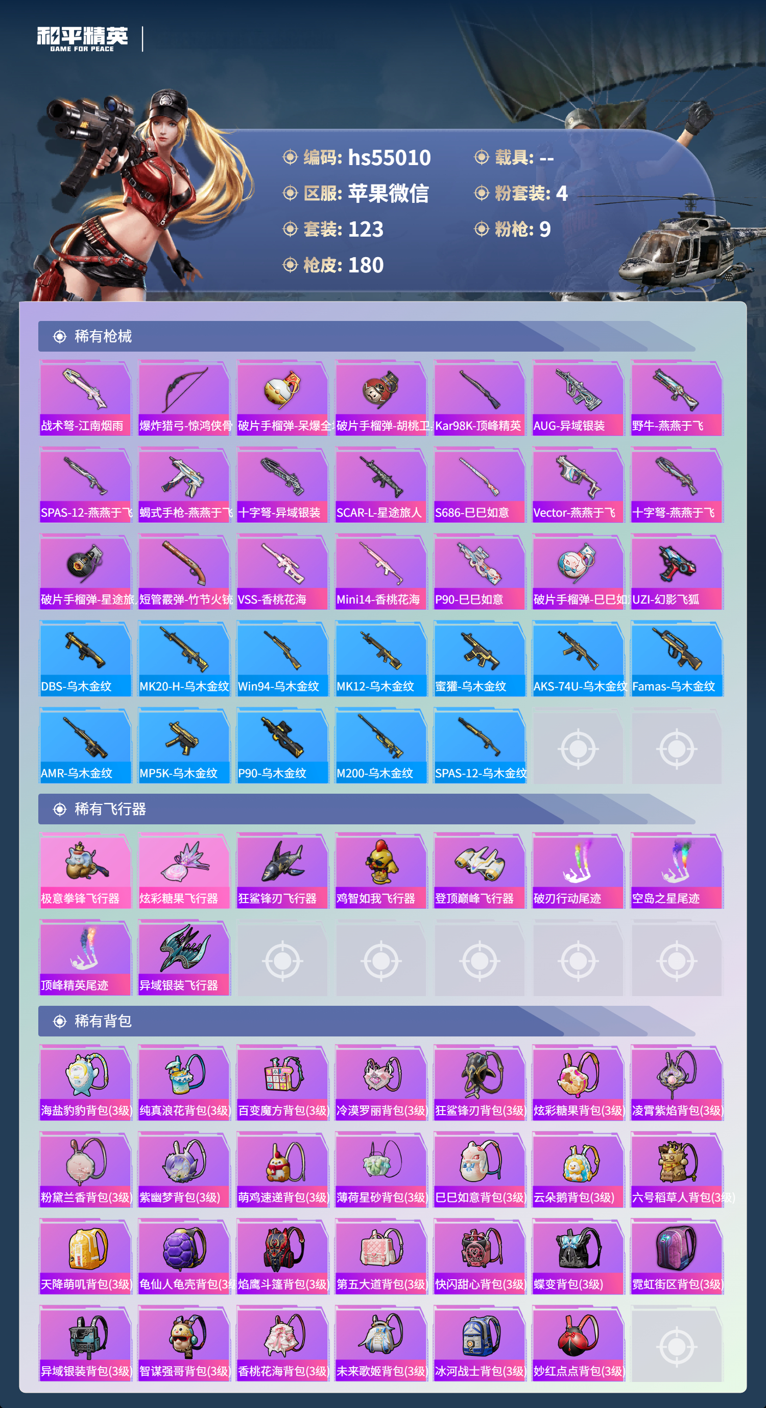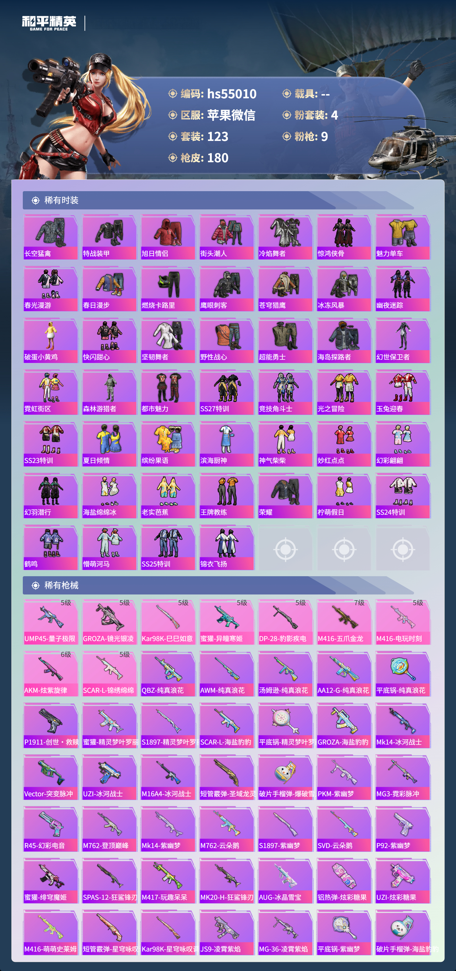 0载具-123套装-180呛皮-hs55010 苹果微信-13王牌印记-4粉装-9特效呛-52824热力值-123套装-180呛皮-1卓越印记【4粉装】套装-幻彩电音角色-月影灵韵套装-智能音符角色-灵玺【9特效呛】scar-l-锦绣绵绵/5级m416-五爪金龙/7级蜜獾-异瞳寒姬/5级akm-炫紫旋律/6级groza-镜光银凌/5级ump45-量子极限/5级m416-电玩时刻/5级kar98k-巳巳如意