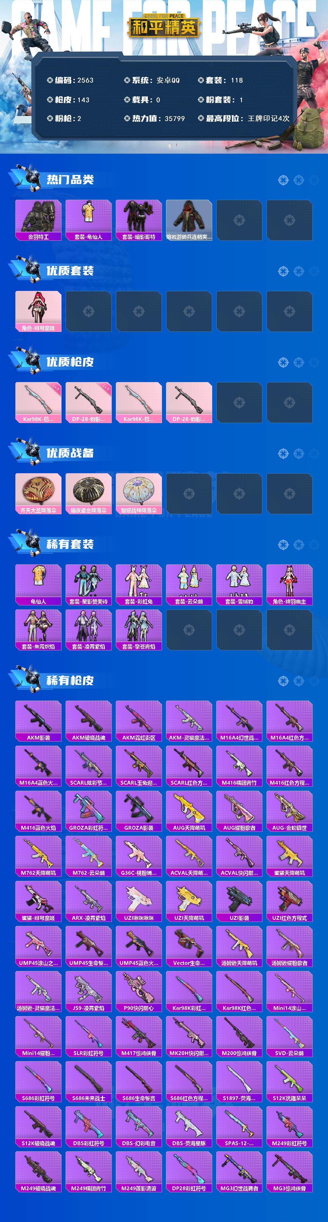 0载具-118套装-143呛皮-118套装/呛械2/装备142/战备90/王牌印记4/热力值35799/五级kar98k-巳巳如意/五级dp-28-豹影疾电/金羽特工/套装-龟仙人/套装-暗影哥特/熔岩游骑兵连帽夹克/角色-绯穹魔姬/kar98k-巳巳如意/dp-28-豹影疾电/齐天大圣降落伞/暗夜鎏金降落伞/智耀战神降落伞/炫彩糖果降落伞/龟仙人/套装-炫彩糖果/套装-星影赞美诗/套装-彩虹兔/套装-云朵鹅/套装-雪绒豹/