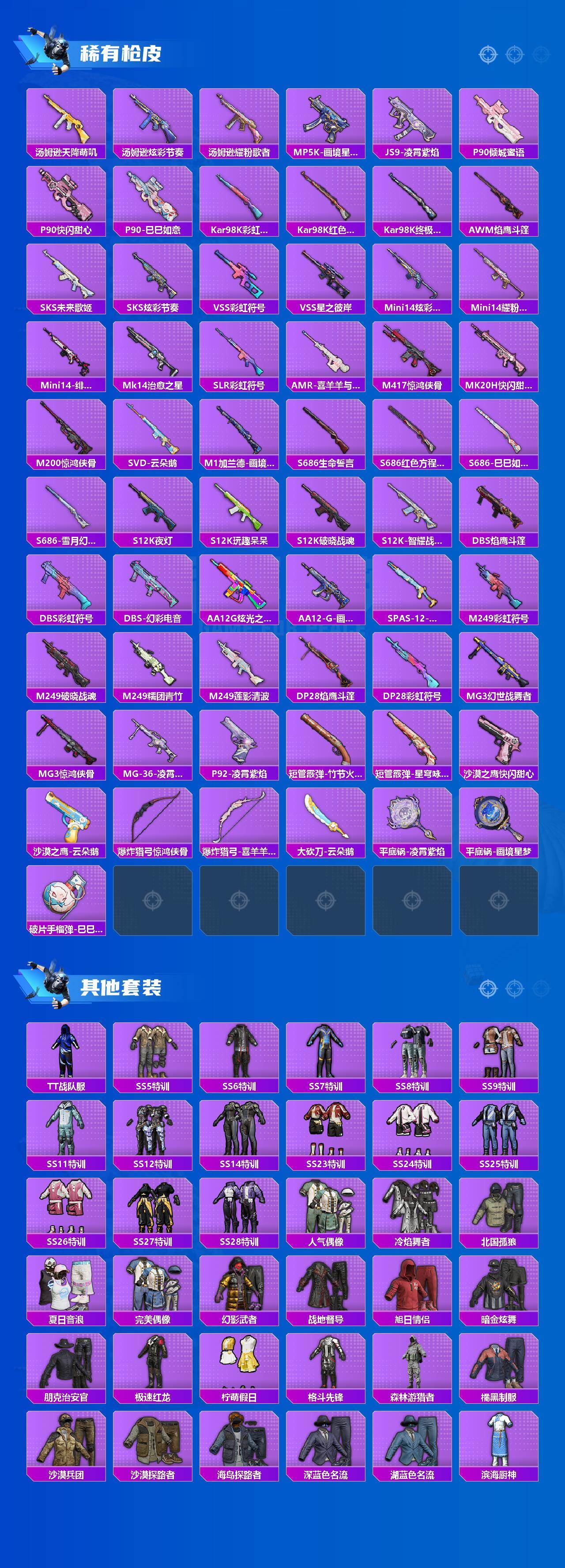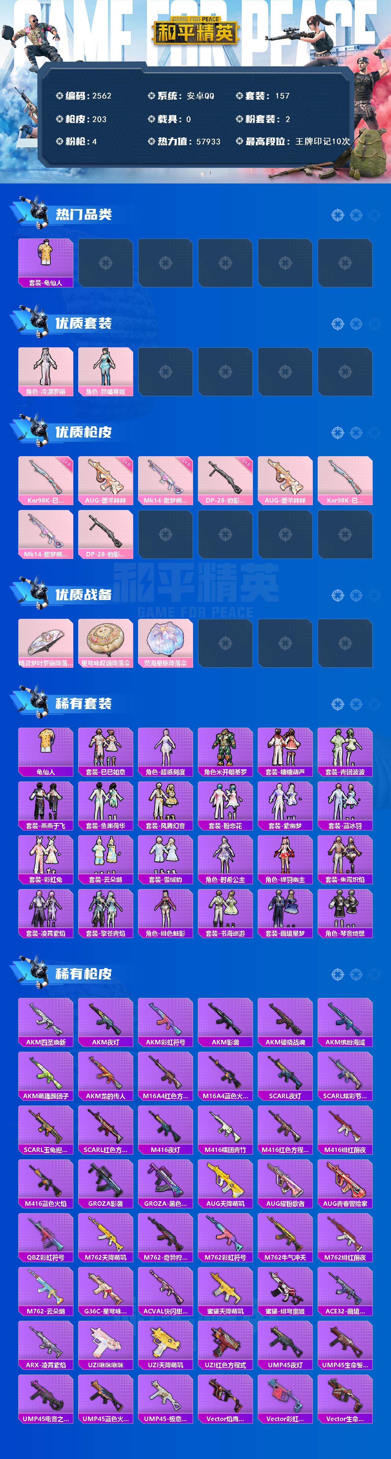 0载具-157套装-203呛皮-157套装/呛械4/装备208/战备142/王牌印记10/热力值57933/五级aug-暖羊咩咩/五级kar98k-巳巳如意/五级mk14-甜梦熊击/五级dp-28-豹影疾电/套装-龟仙人/角色-冷漠罗丽/角色-异瞳寒姬/aug-暖羊咩咩/kar98k-巳巳如意/mk14-甜梦熊击/dp-28-豹影疾电/精灵梦叶罗丽降落伞/星穹咏叹调降落伞/荧海星豚降落伞/炫彩糖果降落伞/龟仙人/巳巳如意/角
