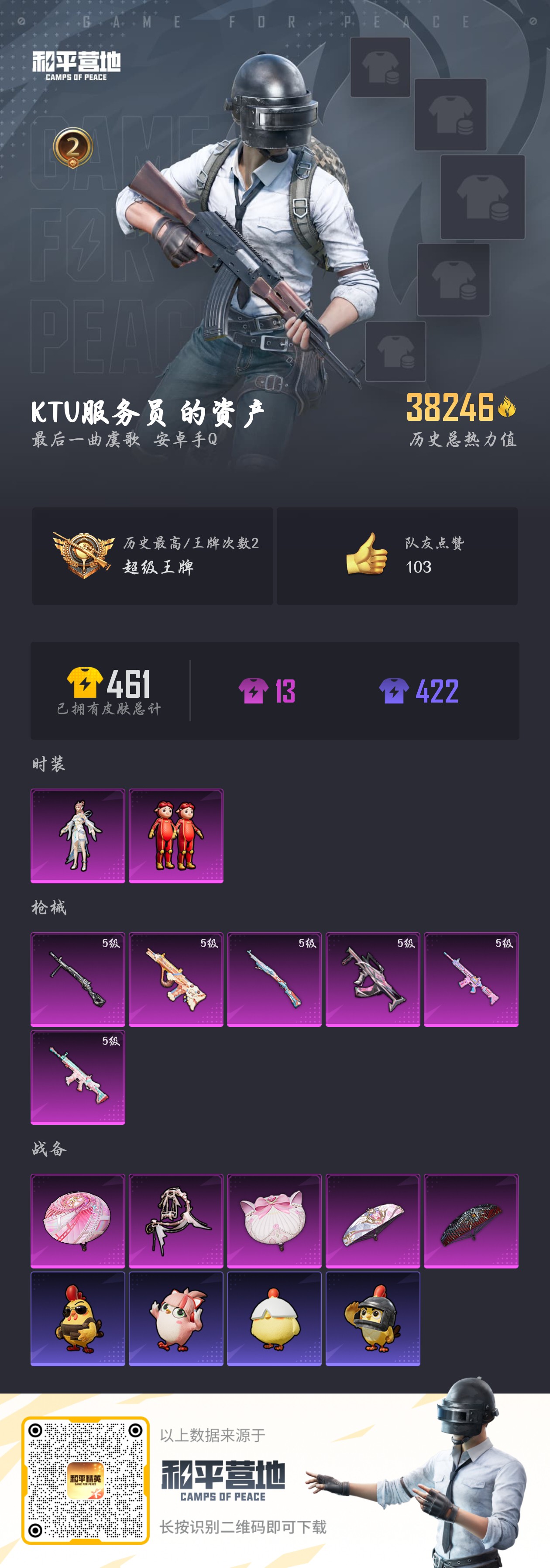 【和平精英】【txhp6378】2粉装,6特效呛,0载具,历史最高段位:超级王牌 王牌印记2次 热力值:38246,91套装,149呛械,144装备,60战备;套装:玩偶服-猪猪侠,角色-月影灵韵,套装-红色运动,套装-黄色运动,套装-蓝色运动,套装-黄色伏地魔,套装-黑色伏地魔,套装-竞技名士,套装-黄色名流,套装-长空猛禽,套装-海岛探路者,套装-特殊使命,套装-活力之心,套装-魅力单车,套装-雪山征服者,套装-超能勇士,套装-森林游猎者,套装-荣耀,套装-摩艾涂鸦,套装-奇趣章鱼,套装-青涩时光,套装-缤纷果语,套装-龙魂突击队,套装-元素星魂,套装-太极红客,套装-破蛋小黄鸡,套装-疯狂小兔子,套装-裁决冥王,套装-核芯基因,套装-鹤鸣,套装-霓虹街区,套装-战术大师,套装-耀粉歌者,套装-热情海星,套装-纯真浪花,套装-绯格组合,套装-神气柴柴,套装-懵萌河马,套装-ss24特训,套装-龟仙人,套装-涂山之恋,套装-ss25特训,套装-惊鸿侠骨,套装-锦衣飞扬,套装-元气发射,套装-龙的传人,套装-冰河战士,套装-ss26特训,套装-快闪甜心,套装-春光漫游,套装-空岛之星,套装-贝斯之夜,玩偶服-超人强,套装-焰鹰斗篷,套装-幽夜迷踪,套装-幻羽潜行,套装-ss27特训,套装-幽幻花璃,套装-老实芭蕉,套装-ss28特训,角色-白光莹,套装-街头风暴,套装-海盐绵绵冰,套装-蝶变,套装-粉日山川,套装-ss29特训,套装-雏菊兔兔,套装-萝兰蝴蝶,角色-绯色魅影,角色-都市丽猫,角色-俏兔智灵,套装-ss30特训,套装-青团波波,套装-糖糖葫芦,套装-ss31特训,套装-鱼渊荷华,套装-燕燕于飞,套装-智谋强哥,套装-紫幽梦,套装-粉恋花,套装-ss33特训,角色-猎影月神,套装-巳巳如意,套装-ss32特训,套装-蓝冰羽,套装-大橘大利,套装-星影赞美诗,套装-元气之梦,套装-ss34特训,套装-ss35特训,套装-ss36特训;呛皮:5级aug-暖羊咩咩,aug-凝视深渊,aug-天降萌叽,aug-黑白懵懵牛,aug-异域银装,ace32-冰晶雪宝,5级groza-镜光银凌,groza-懵萌河马,groza-海盐豹豹,akm-破晓战魂,akm-霓虹街区,akm-涂鸦街区,akm-环太平洋,akm-龙的传人,akm-江南烟雨,5级m416-电玩时刻,m416-绯红前夜,m416-糯团青竹,m762-彩虹符号,m762-天降萌叽,m762-雏菊兔兔,蜜獾-天降萌叽,蜜獾-精灵梦叶罗丽,蜜獾-糖糖葫芦,蜜獾-乌木金纹,m16a4-凝视深渊,m16a4-冰河战士,5级scar-l-锦绣绵绵,scar-l-红色方程式,scar-l-凝视深渊,scar-l-炫彩节奏,scar-l-星途旅人,scar-l-海盐豹豹,ac-val-乌木金纹,ac-val-快闪甜心,g36c-懵萌河马,g36c-星穹咏叹调,q-纯真浪花,awm-天降萌叽,awm-焰鹰斗篷,awm-纯真浪花,莫辛纳甘-乌木金纹,莫辛纳甘-懵萌河马,5级kar98k-巳巳如意,kar98k-星穹咏叹调,m200-惊鸿侠骨,m200-乌木金纹,amr-乌木金纹,m24-幻彩电音,mk20-h-莲影清波,mk20-h-快闪甜心,mk20-h-星途旅人,mk20-h-糖糖葫芦,mk20-h-狂鲨锋刃,mk20-h-乌木金纹,m417-惊鸿侠骨,m417-猪猪侠,mini14-耀粉歌者,mini14-阿狸红,mini14-涂山之恋,mini14-香桃花海,mini14-雏菊兔兔,sks-炫彩节奏,sks-棋盘冕主,mk14-纯梦嫁纱,mk14-冰河战士,mk14-紫幽梦,vss-未来战士,vss-彩虹符号,qbu-飒粉甜心,aks-74u-尼罗河传说,aks-74u-粉粉喵呜,aks-74u-乌木金纹,野牛-雏菊兔兔,野牛-燕燕于飞,mp5k-乌木金纹,p90-快闪甜心,p90-巳巳如意,p90-乌木金纹,vect-焰鹰斗篷,vect-燕燕于飞,汤姆逊-环太平洋,汤姆逊-天降萌叽,汤姆逊-纯真浪花,汤姆逊-智耀战神,uzi-天降萌叽,uzi-冰河战士,uzi-啾咪啾咪,ump45-夜灯,ump45-涂山之恋,ump45-海盐豹豹,ump45-糖糖葫芦,dbs-圣堂之誓,dbs-焰鹰斗篷,dbs-月影灵韵,dbs-乌木金纹,s686-未来战士,s686-生命誓言,s686-千金淑猫,s686-巳巳如意,s1897-精灵梦叶罗丽,s1897-紫幽梦,s1897-糯团青竹,spas-12-燕燕于飞,spas-12-乌木金纹,s12k-玩趣呆呆,aa12-g-纯真浪花,m249-彩虹符号,m249-莲影清波,5级dp-28-豹影疾电,dp-28-彩虹符号,dp-28-焰鹰斗篷,mg3-幻世战舞者,mg3-惊鸿侠骨,mg3-霓彩脉冲,mg-36-薄荷星砂,pkm-懵萌河马,pkm-紫幽梦,蝎式手呛-金丰海韵,蝎式手呛-千金淑猫,蝎式手呛-燕燕于飞,沙墨之鹦-快闪甜心,p18c-糖糖葫芦,tmp-9-江南烟雨,tmp-9-雪月幻音,p92-紫幽梦,r1895-雏菊兔兔,平底锅-懵萌河马,平底锅-惊鸿侠骨,平底锅-快闪甜心,平底锅-空岛之星,平底锅-焰鹰斗篷,平底锅-精灵梦叶罗丽,平底锅-纯真浪花,平底锅-雏菊兔兔,平底锅-糖糖葫芦,平底锅-许七安,平底锅-紫幽梦,撬棍-环太平洋,大砍刀-黄族统领,十子怒-燕燕于飞,十子怒-异域银装,燃烧瓶-甜梦桃焰,破片手留单-呆爆全场,破片手留单-海盐豹豹,破片手留单-拽到爆炸,破片手留单-巳巳如意,战术弩-江南烟雨,爆炸猎弓-惊鸿侠骨;降落伞:牡丹亭・游园飞行器,空岛之星尾迹; 详情看图2印记-3.8w热力-2粉-6特